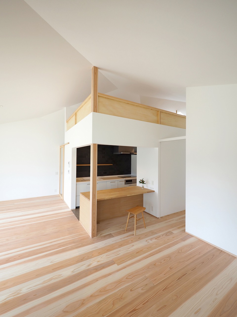 内部は四隅に屋根なりの勾配天井が流れ櫓のようなロフトへと続きます。