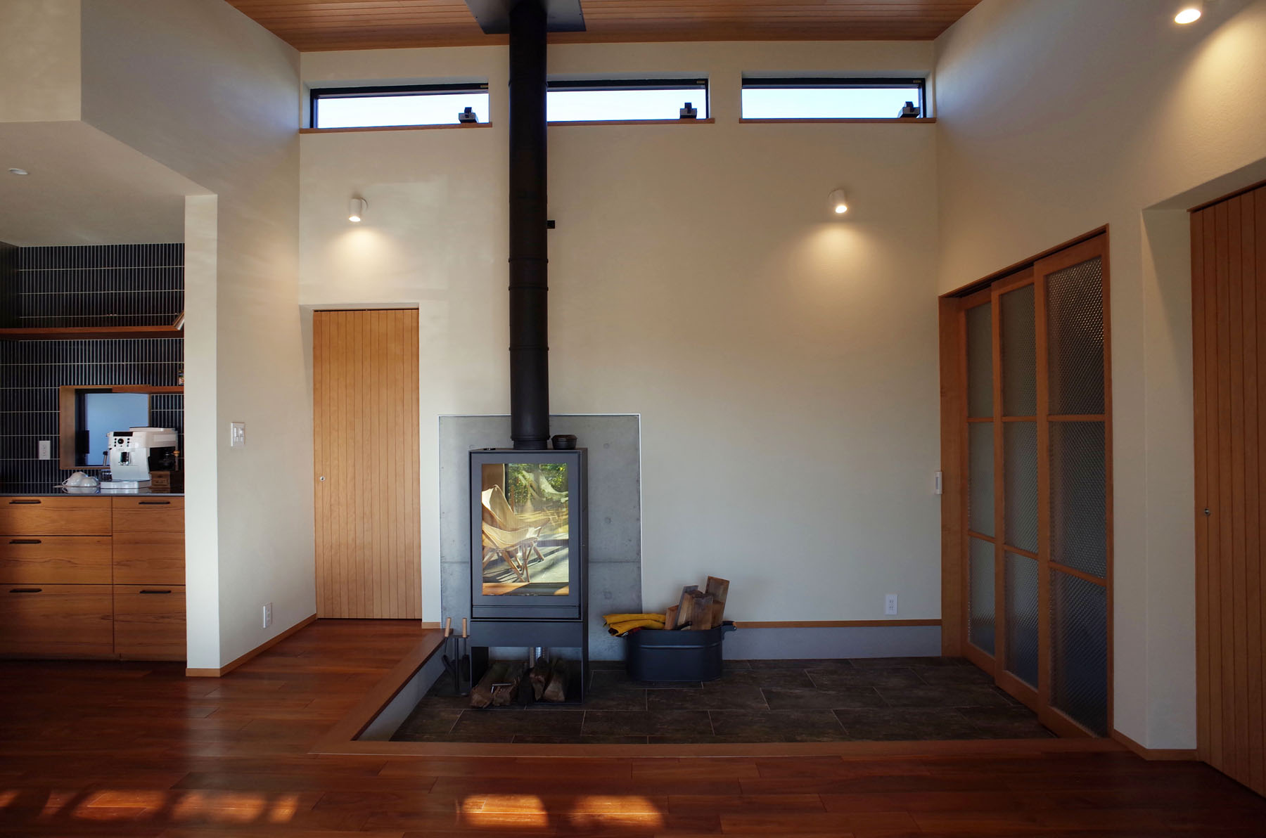 高台の住宅地。どの部屋にも光と風を取り込むために南間口を大きくとり、尚且つ中庭をつくる事で各部屋に最高の環境を与えられる様に配慮をしました。リビングは勾配天井の板張り。東西の奥行き感を強調して、開放感のある伸びやかな心地良い空間としました。