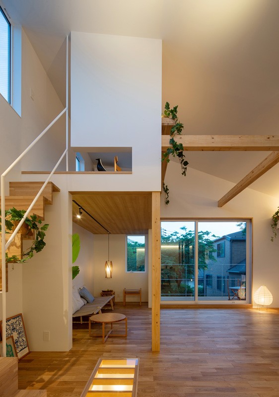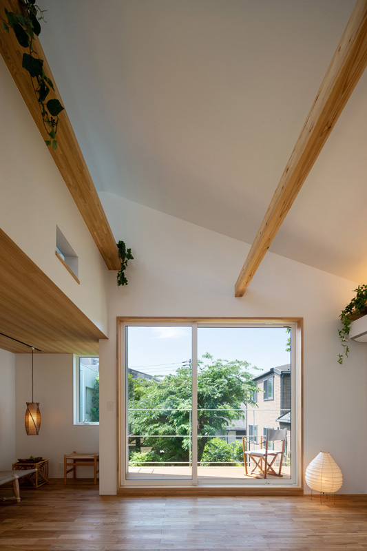 2階においては屋根も一部掛替えを行い、新たに吹抜け+ ロフトを設けて、公園側へ開く窓を最大限に大きくとれるようにしています。