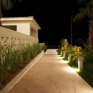ランドスケープは琉球石灰岩、クバの木、月桃、ハイビスカス、アダン、その他クライアント提供の植栽を