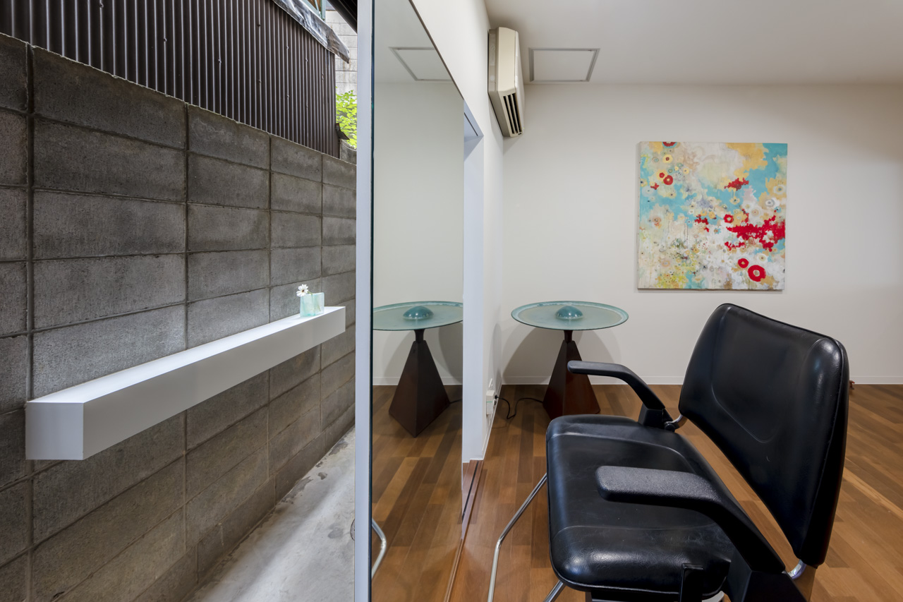 この部屋にとって唯一の外部空間を活かせないかと考え、鏡越しにこの外部空間を向くよう、チェアの向きを決めました。既存のアルミサッシの開口はディティールを整え、ガラスは透明に入れ替えました。そして境界に立つブロック塀には、お客さんの目を楽しませてもらえるよう、白い飾り棚を取り付けました。