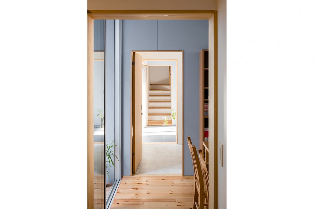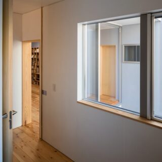 松原市内の閑静な住宅地に建つ二世帯のための住宅。敷地は通りから少し離れ入り組んだ道を通るため人通りも少ない。限られた空間に拡がりを得るためにスキマと名付けた室内空間と道がつながり開放的になるように計画した。スキマに面した他空間は趣味や溢れる生活感を楽しむために程よくプライベートを保てるようにした。