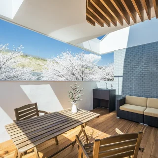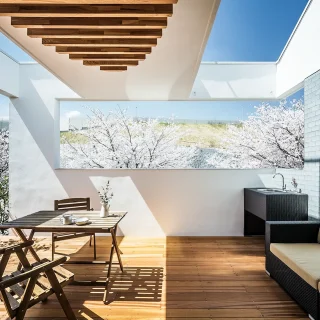 外部と内部の境界を曖昧にし、自然と外に出てしまうようなデザイン、夏の強い日差しを遮る工夫、雨をしのげる屋根やタープ、常設されたソファやテーブルなどの家具──庭でもテラスでもなく、あくまでも〈リビング〉を目指しました。桜並木からアウトドアリビング、LDKへと連続してつながった、合計31帖の家族団欒のための空間が広がる住まいです。