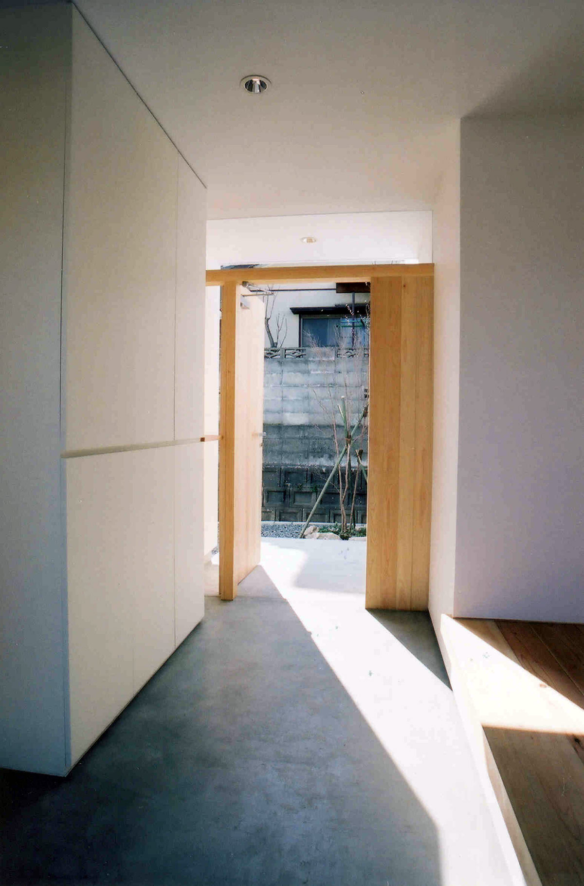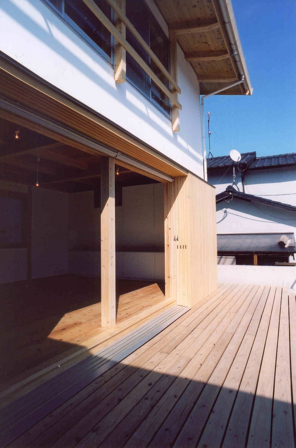 九州産の杉構造材を宮大工による現場手刻み加工で建てた、プリミティブな2階建ての住宅です。柱や梁などの構造材だけでなく、床やデッキ材にも厚み40ミリの九州産杉材を使い、内外装は漆喰壁、浴室は人造石研ぎ出し仕上を採用するなど、敢えて、素材の経年変化を家族の成長とともに愉しめるよう拘った。
