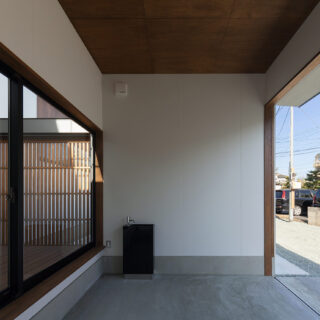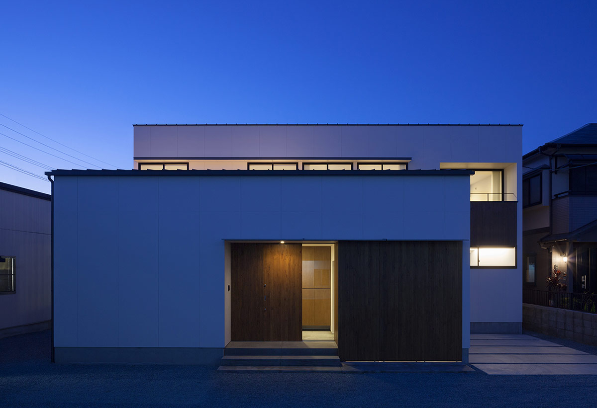 南側マンションからの視線を遮るために、目隠しとなる離れに玄関とバイクガレージ、和室を内包した家族4人の為の住宅です。この離れと母屋の間には、リビングのための中庭テラスと浴室のためのバスコートがあります。周辺環境から適度な距離感とプライバシーを確保つつも、居室空間に快適な光と風を取り込むことに成功した。