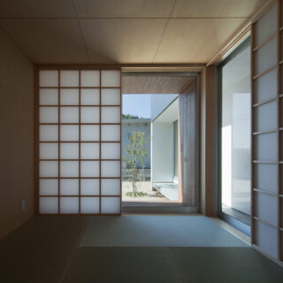 高台の住宅団地に建つ、家族4人のための住宅です。多目的に使える離れの和室で周辺からの視線を適度に遮り、リビングにあるホームシアターはダイニングやキッチンからも楽しめる設計となっています。品の良い住宅の佇まいにする為に、玄関ドアを道路側に直接向けないように設計しています。