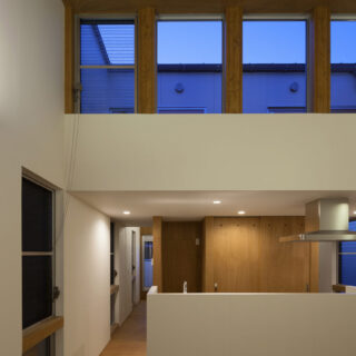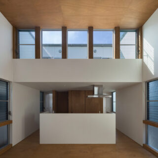 間口6m、奥行き18.5mという細長い、まるで「うなぎの寝床」のような敷地に建つ、3台分の駐車スペースを持つ家族5人の為の住宅です。敷地の両側は隣の家との隙間が少なく、非常に困難な採光状況でしたが、ロフトや屋上バルコニーをつくることで上方からの採光を確保しました。また、天井を高くすることで2階LDKの空間を大きく取り、狭小敷地でありながらも狭さを感じさせないような設計になっています。