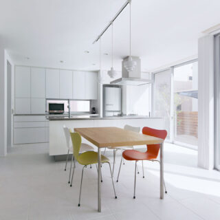 ご夫婦と小型犬のためのシンプルでナチュラルな住宅です。広い軒下の玄関ポーチ、メンテナンスを考慮した床タイル、格子引き戸を活用した可変性のあるLDK空間、お料理好きな奥様のための清潔感のあるオーダーキッチンが特徴となっています。また、非日常的なインテリアデザインは、多忙なご主人の癒しの空間になっています。