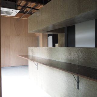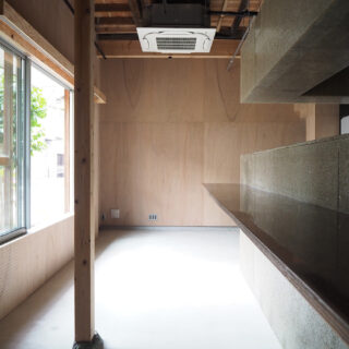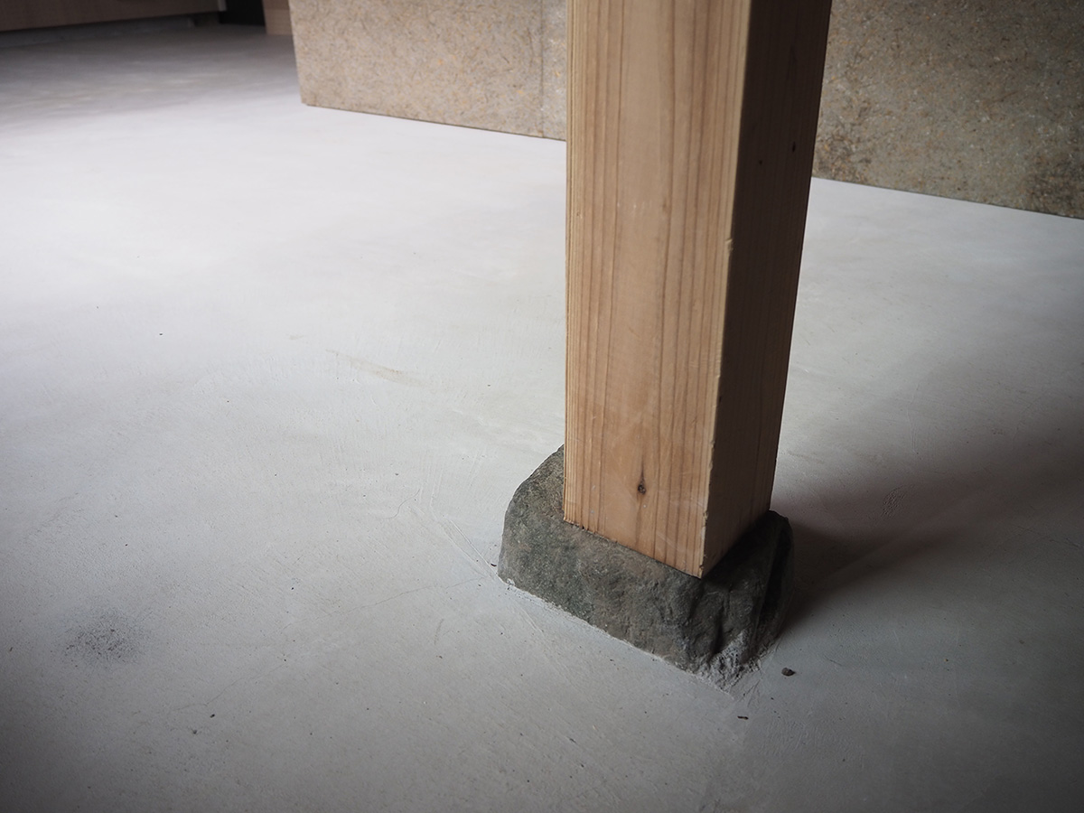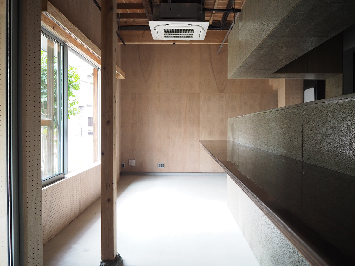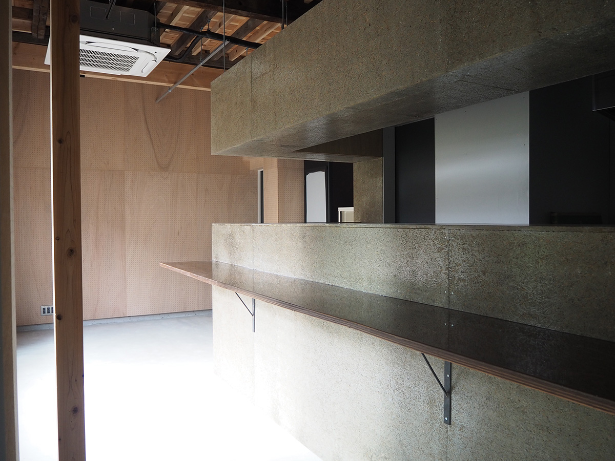1階飲食店では、床を解体し剥き出しとなった土部分に、基礎の代わりとなっている大谷石に緊結するよう配筋した土間コンクリートを施工し、耐震性を高めると共に、飲食店としての天井高と清潔感を確保した。また、壁は全面を有孔の木製ベニヤ貼りとし、吸音性能に木のあたたかさをプラスした。