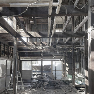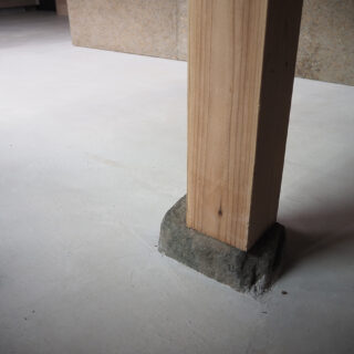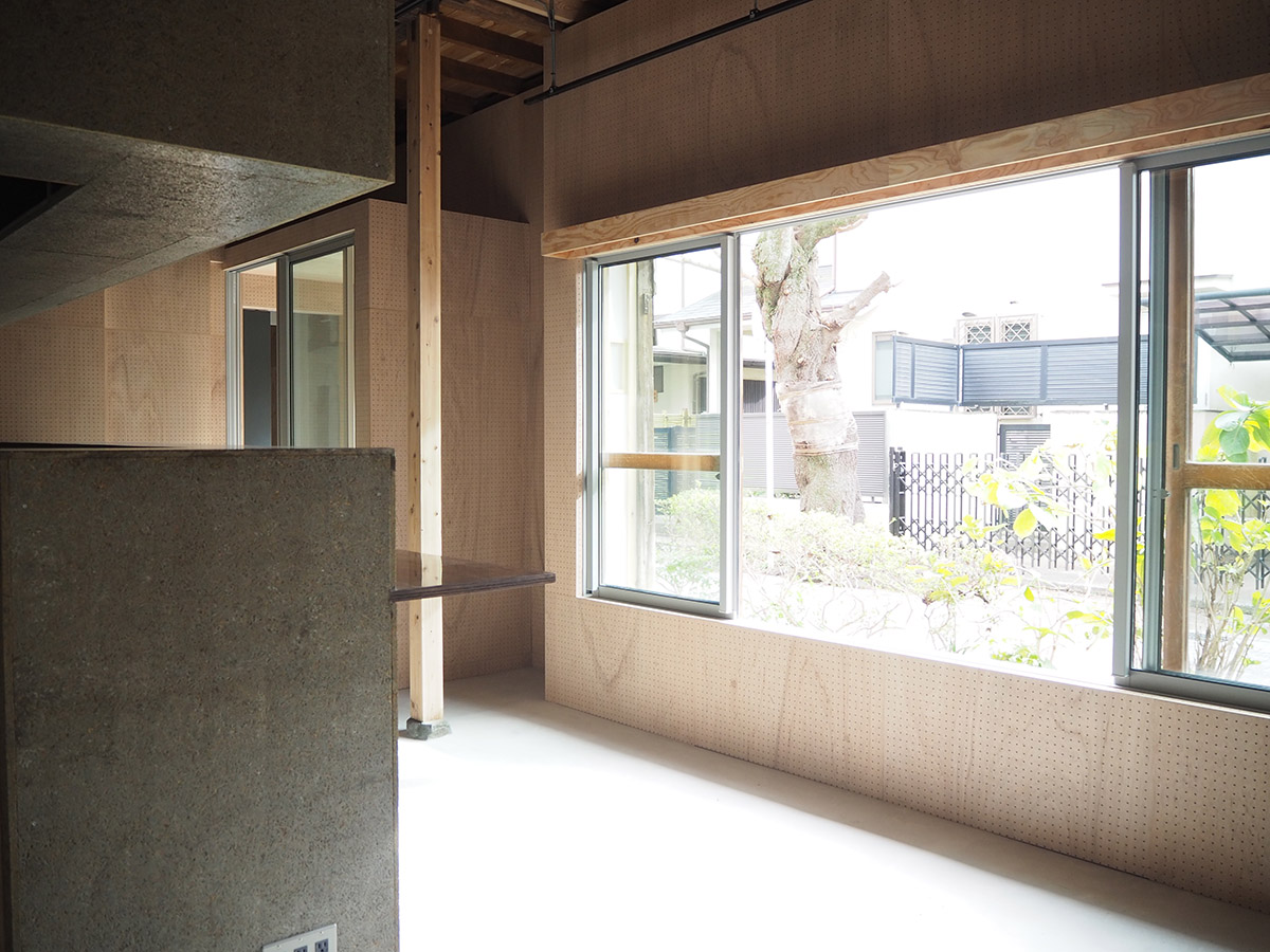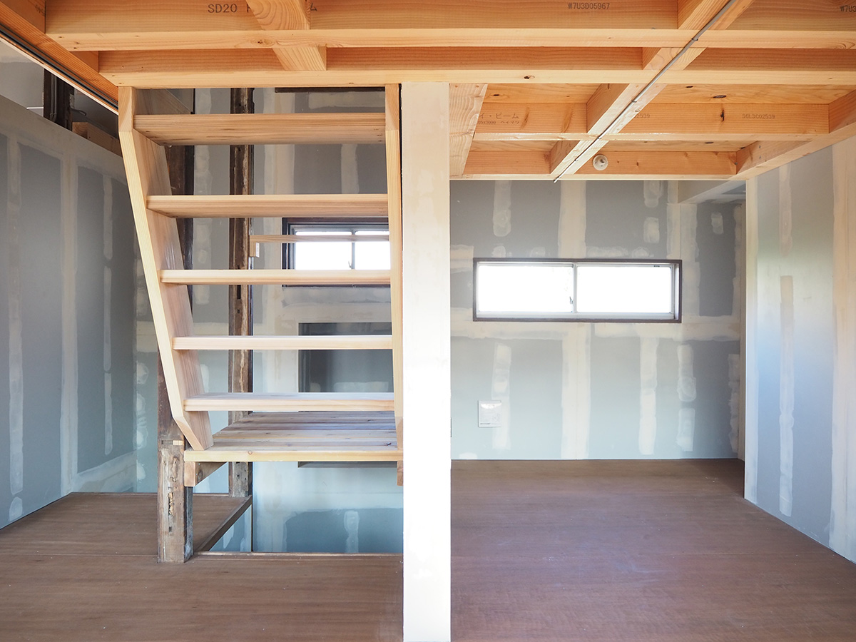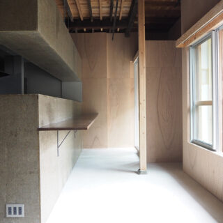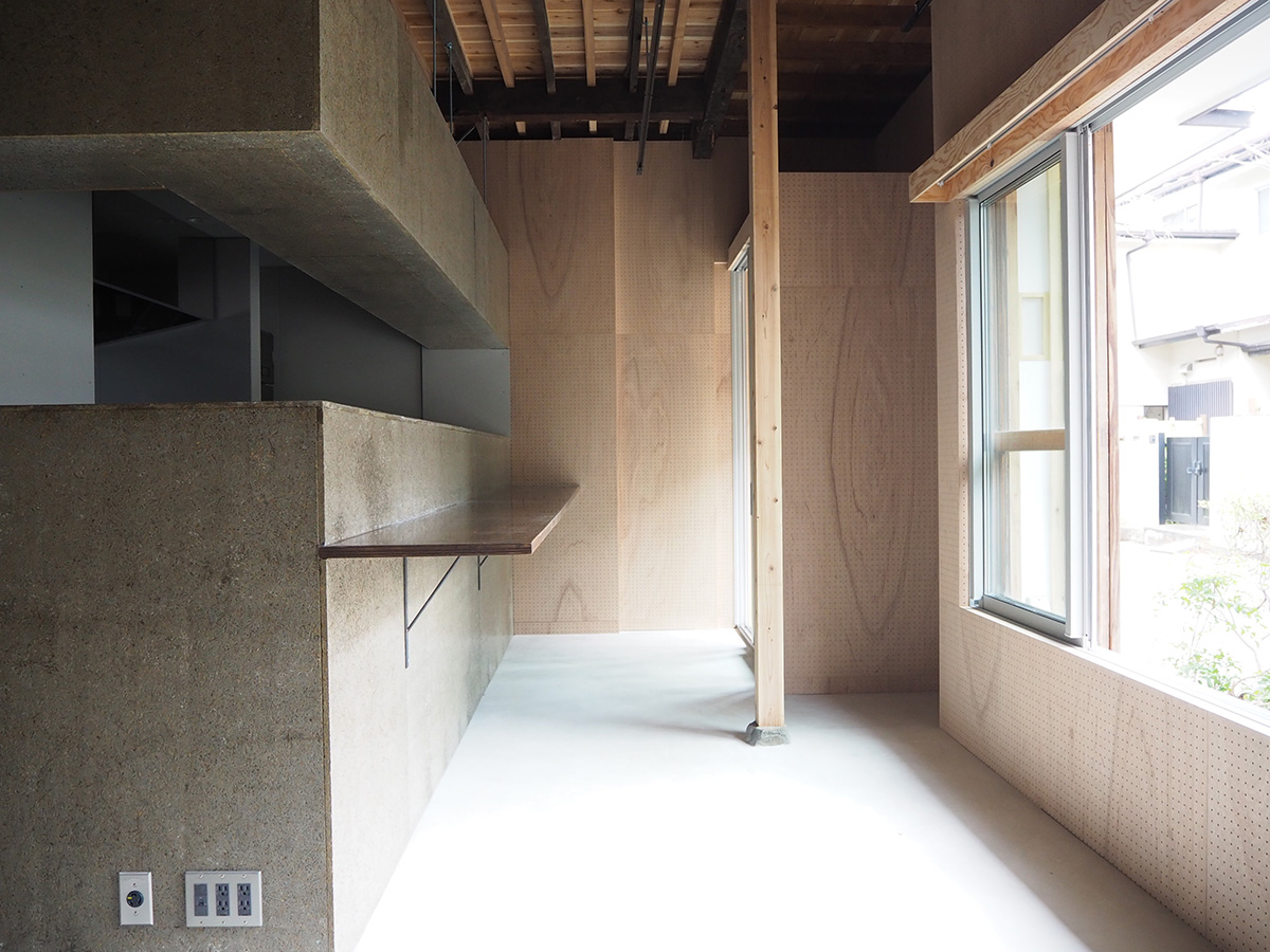 住居となる2階は既存の柱梁がそのまま見えるワンルーム空間とし、断熱材を追加した壁は既存の柱梁に負けないテクスチャーとするべく、ボードのパテをそのまま見せる土着的なアートのような荒々しい仕上げとした。
