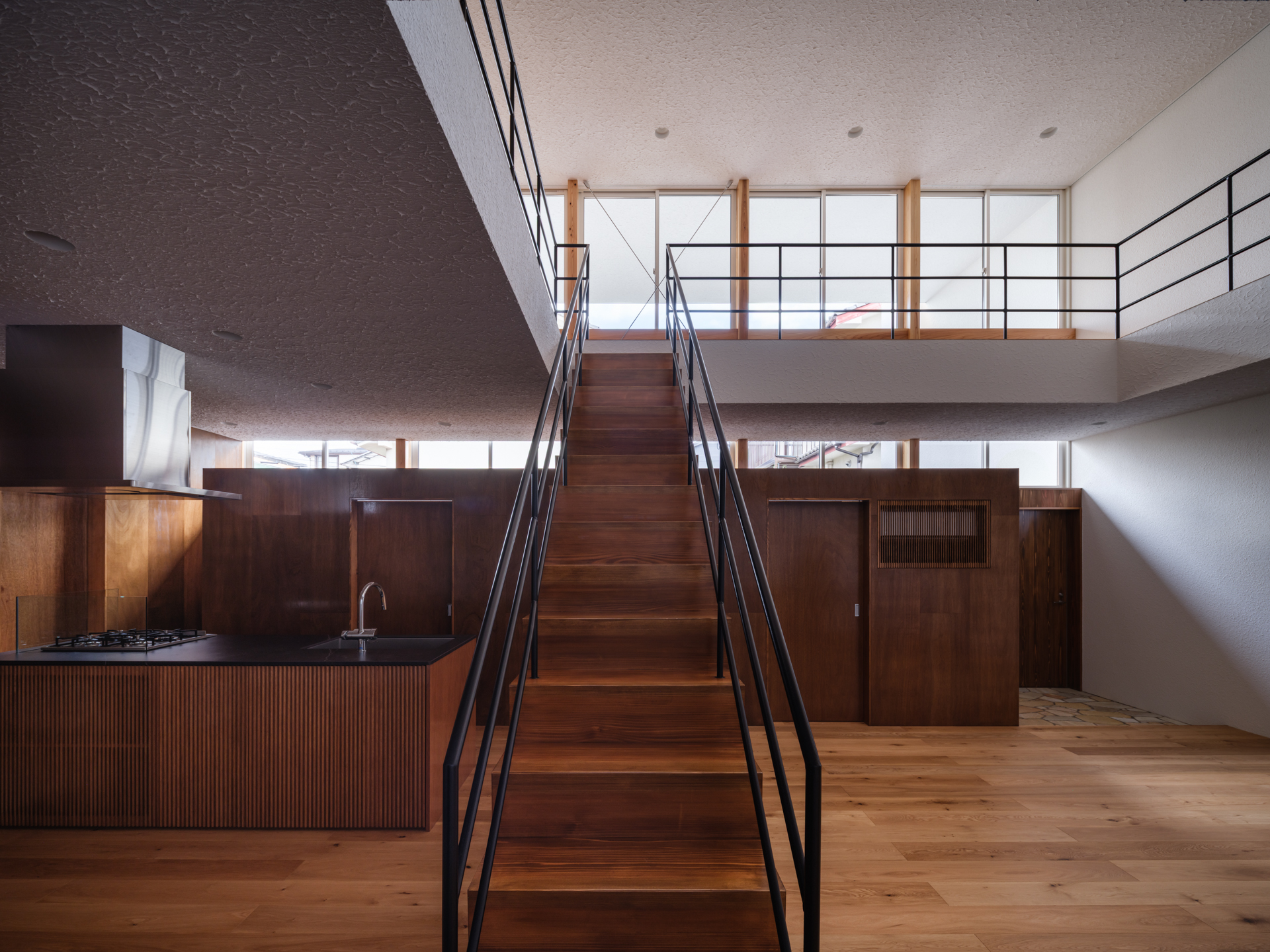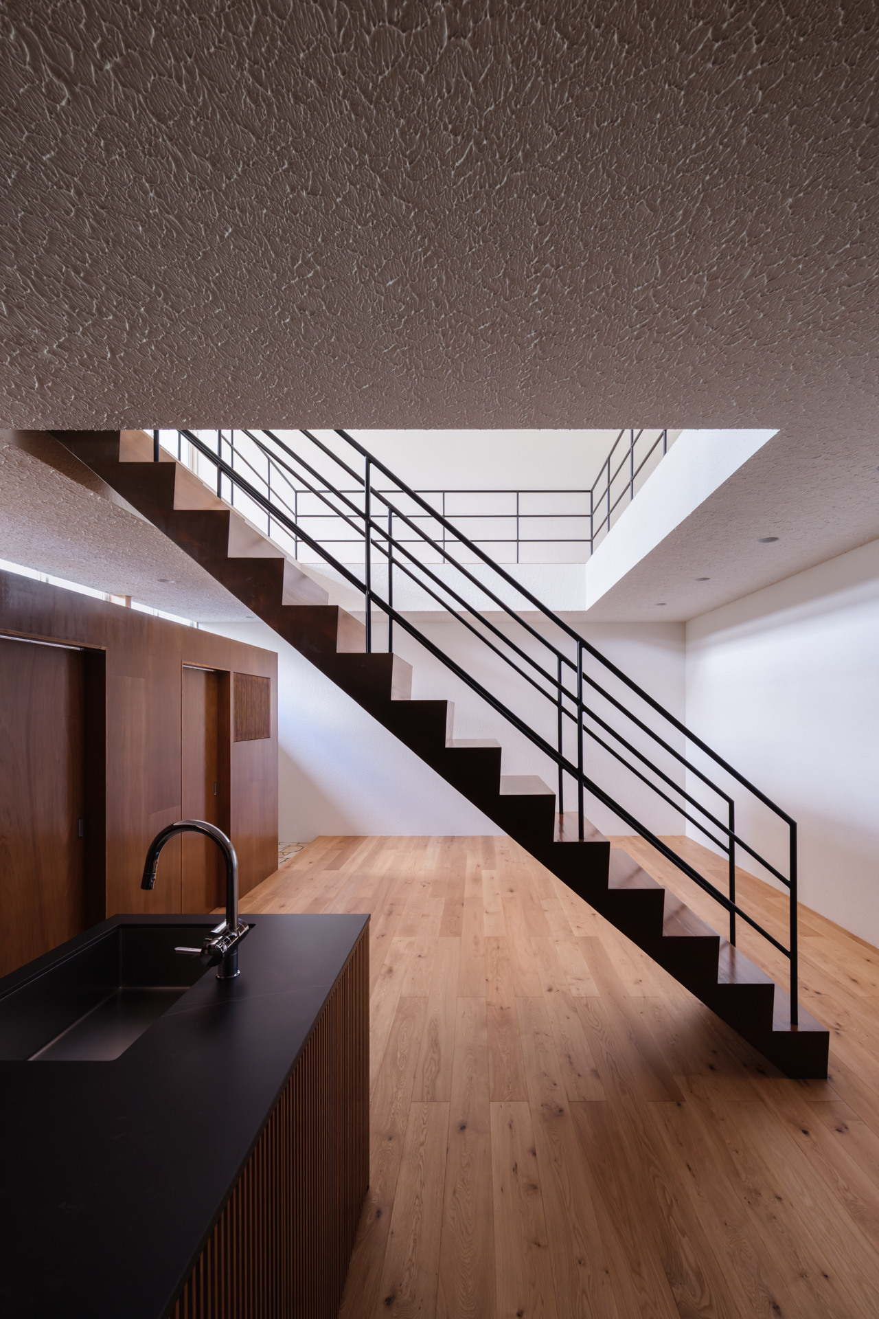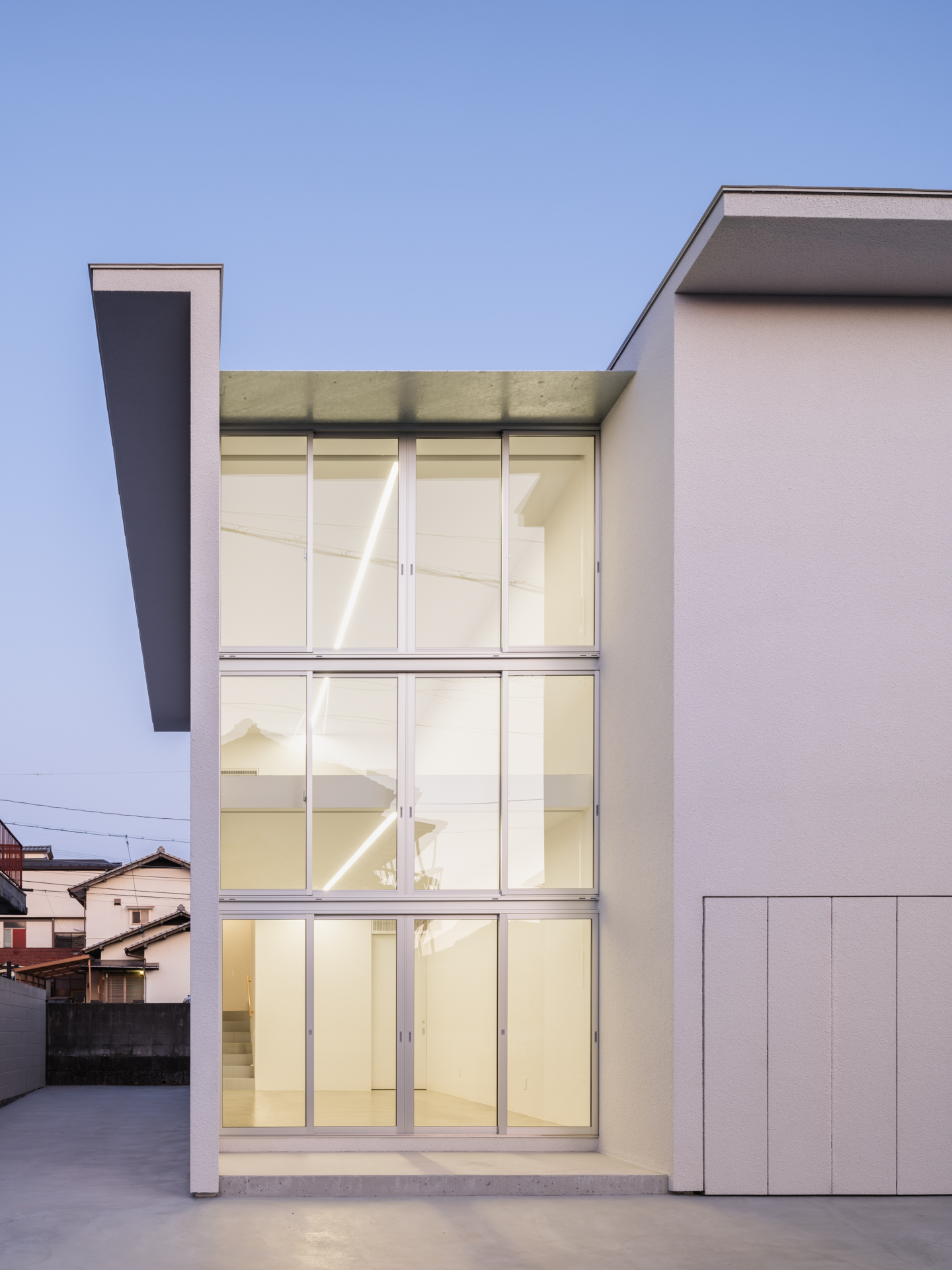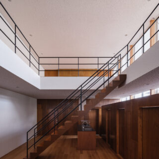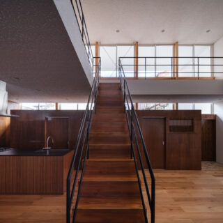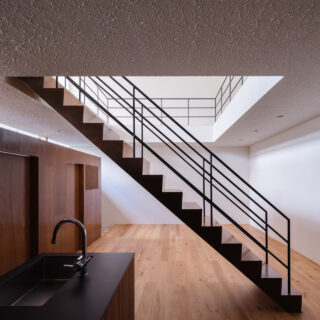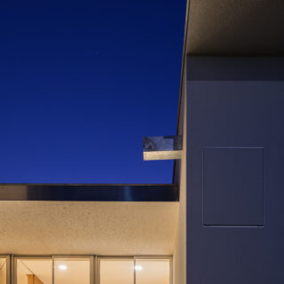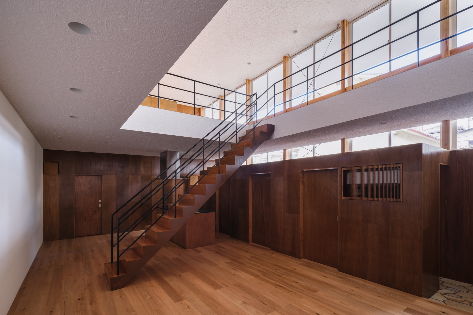 薄く大きな庇壁、地層のような床、階を越境するサッシ、日常的なスケールから少し逸脱した要素で全体を構成することで、シンプルながら、心地良い開放感と重厚感のある空間を目指した。