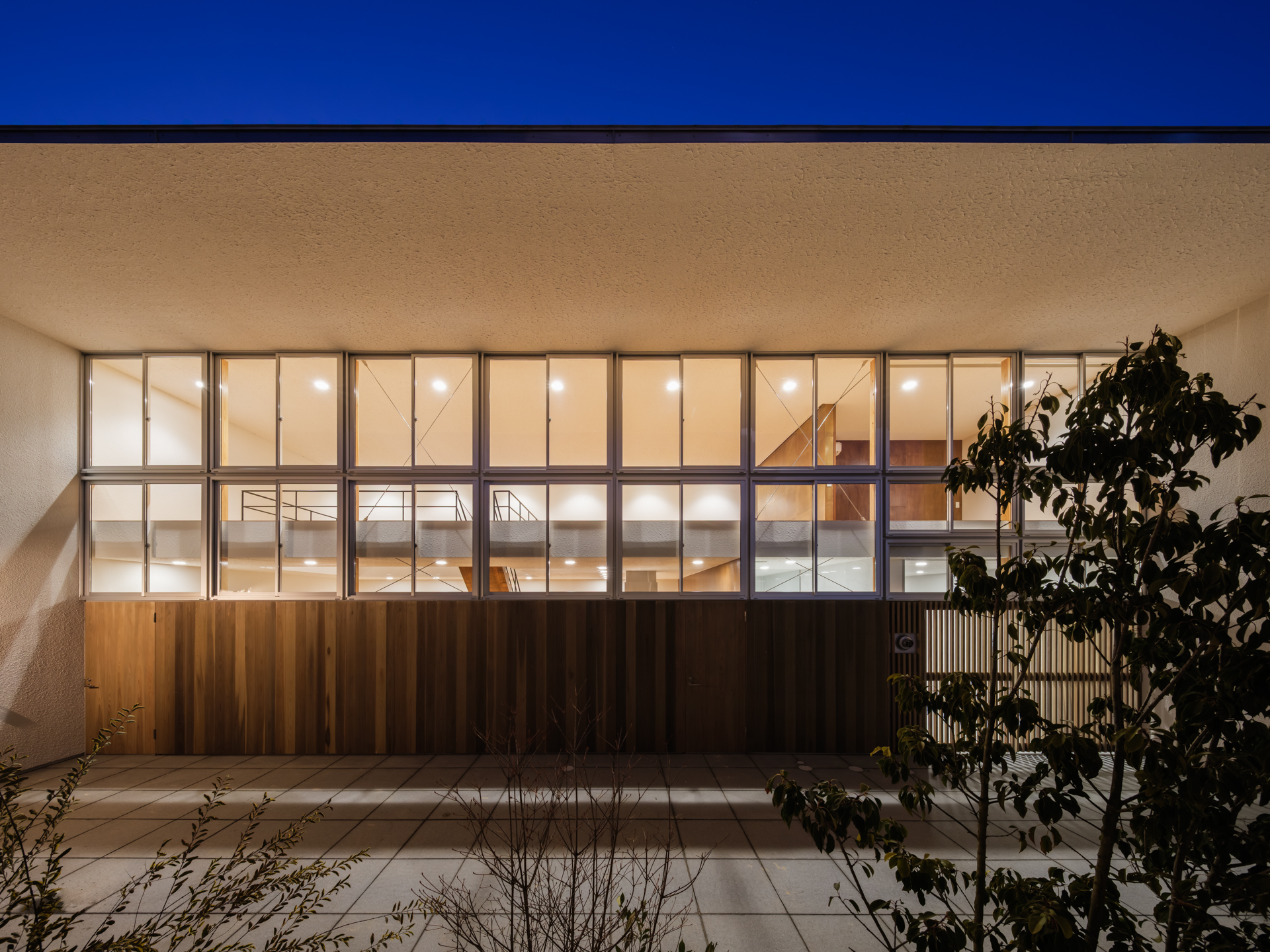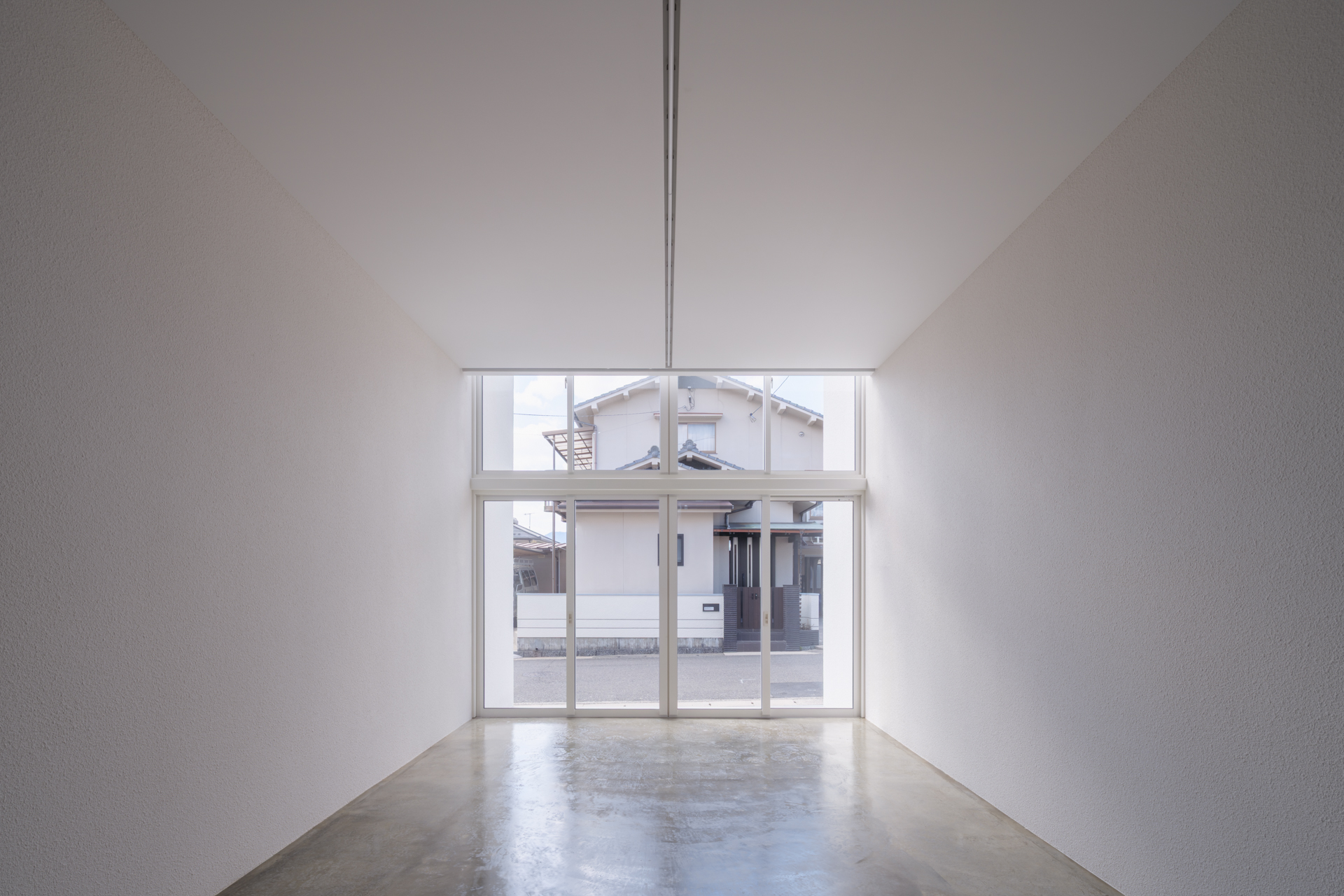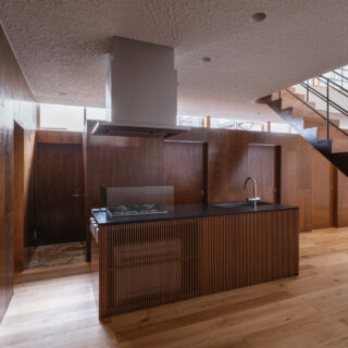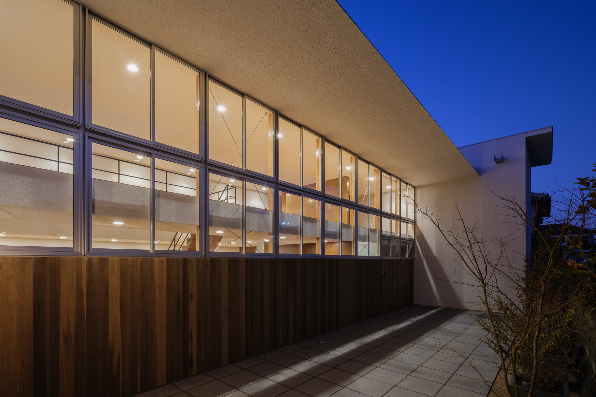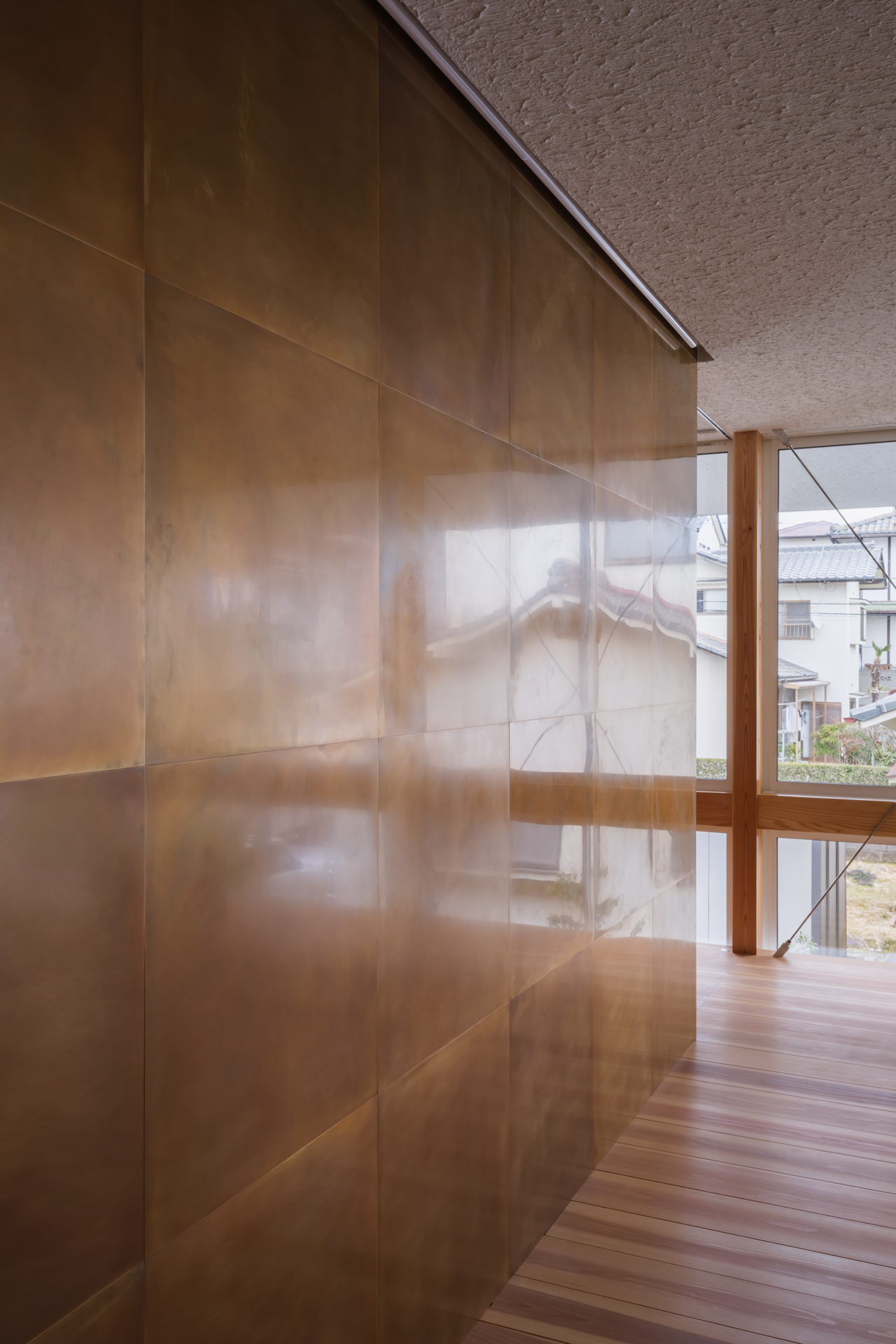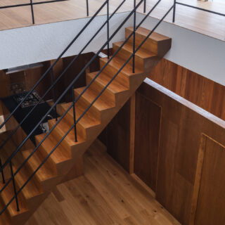 薄く大きな庇壁、地層のような床、階を越境するサッシ、日常的なスケールから少し逸脱した要素で全体を構成することで、シンプルながら、心地良い開放感と重厚感のある空間を目指した。