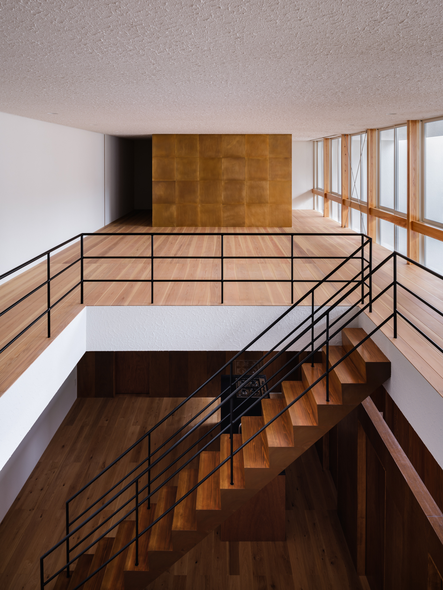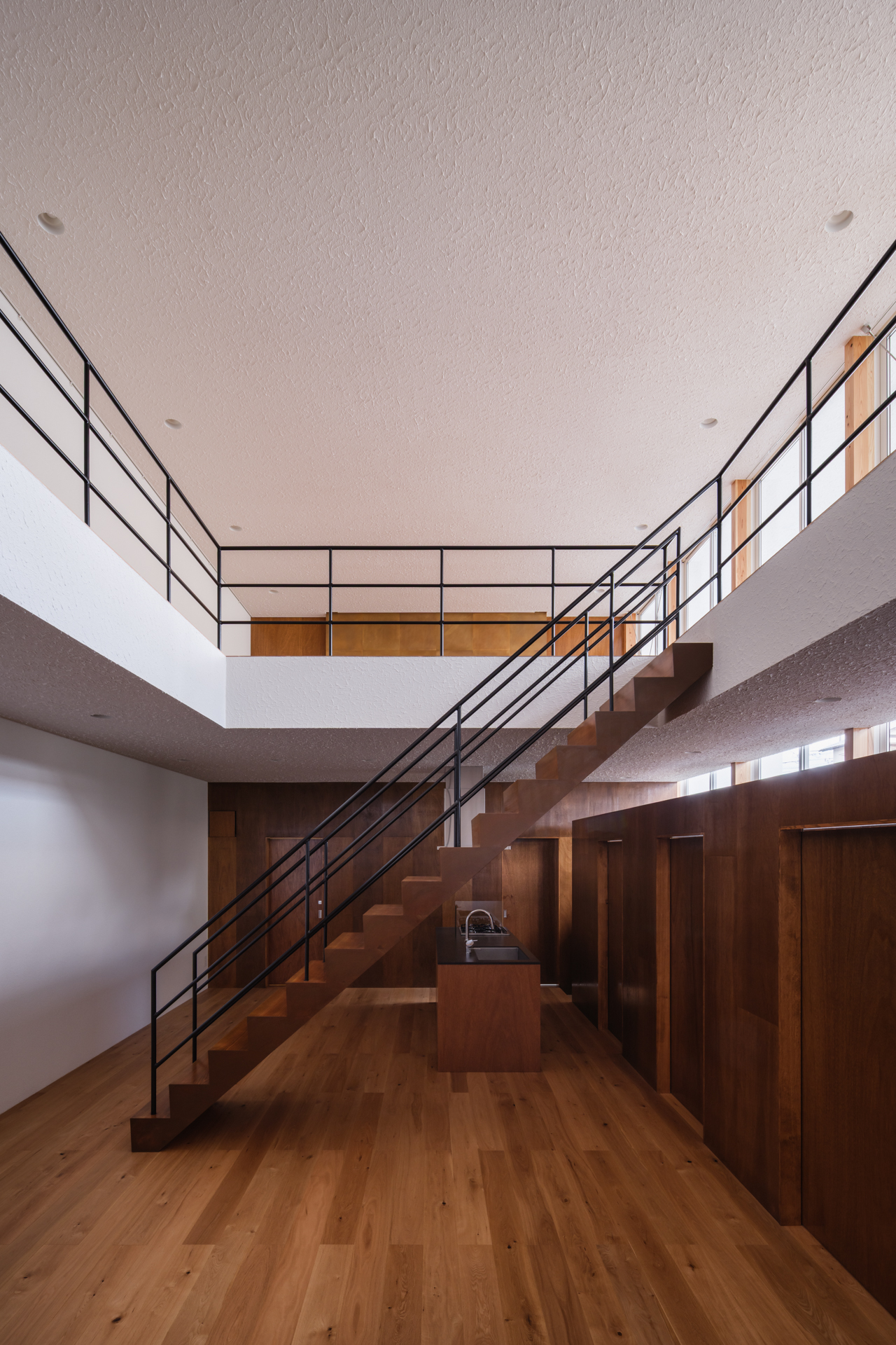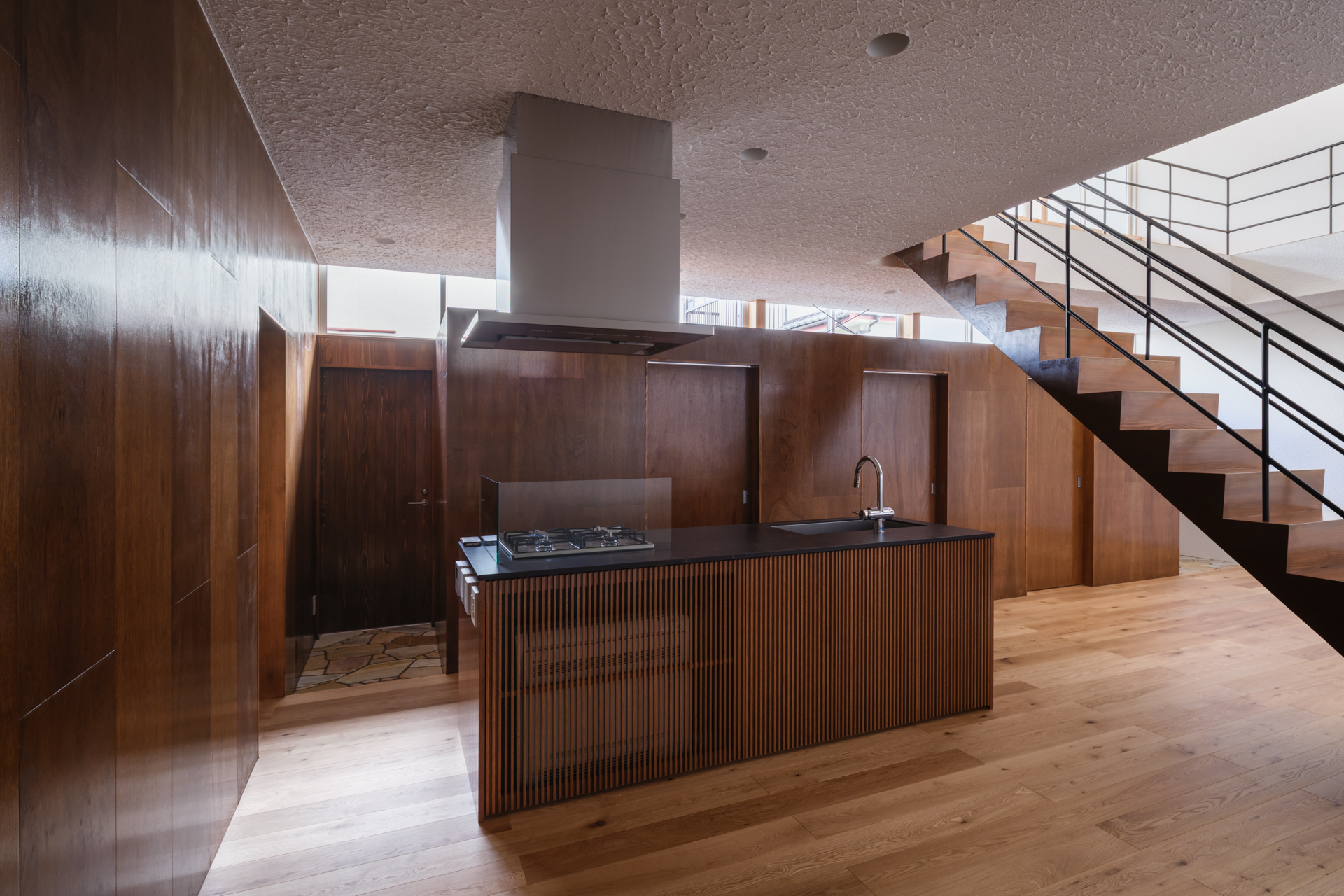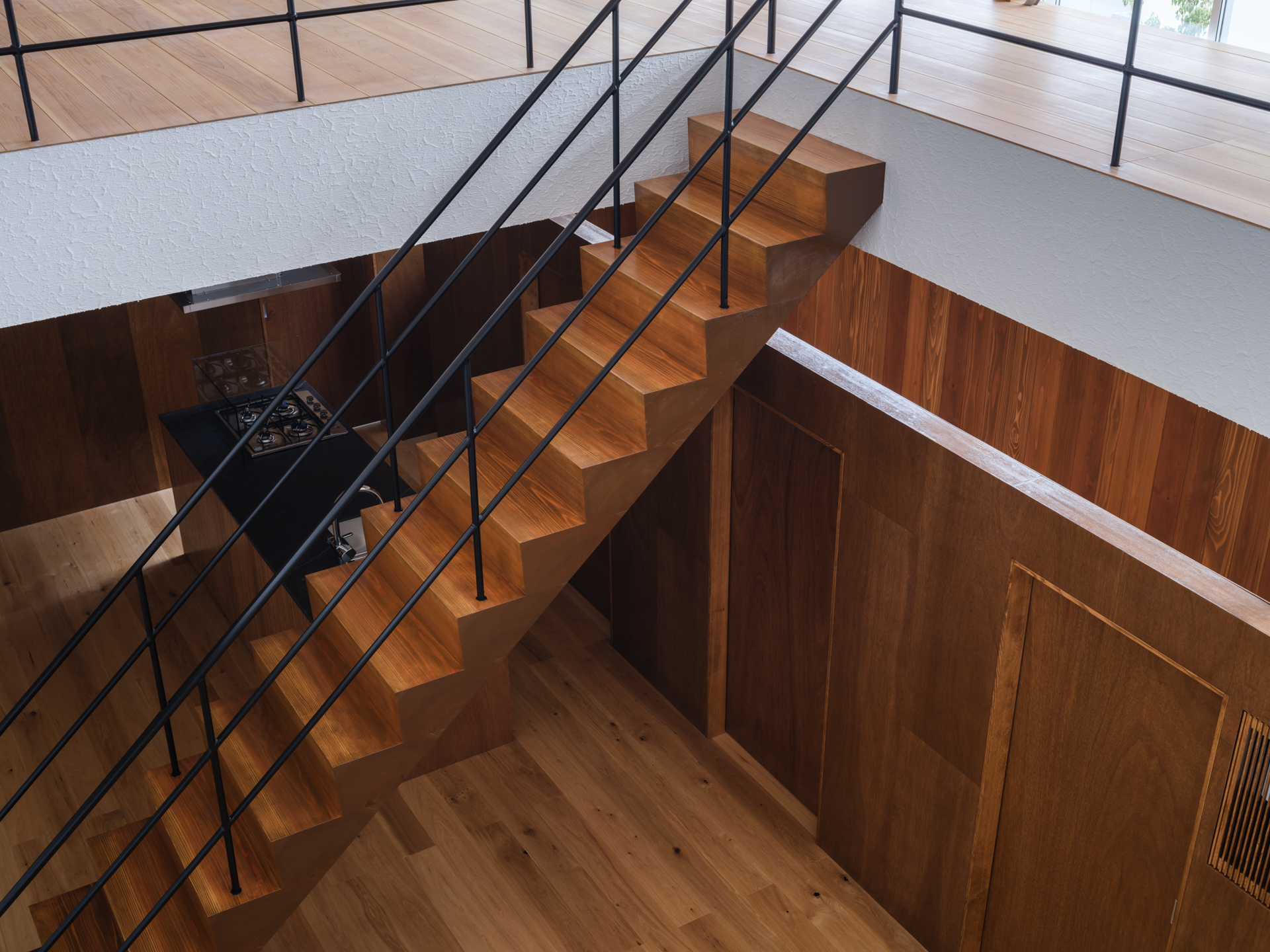 薄く大きな庇壁、地層のような床、階を越境するサッシ、日常的なスケールから少し逸脱した要素で全体を構成することで、シンプルながら、心地良い開放感と重厚感のある空間を目指した。