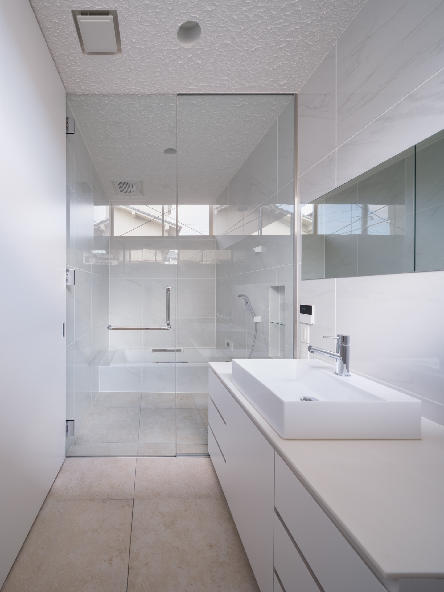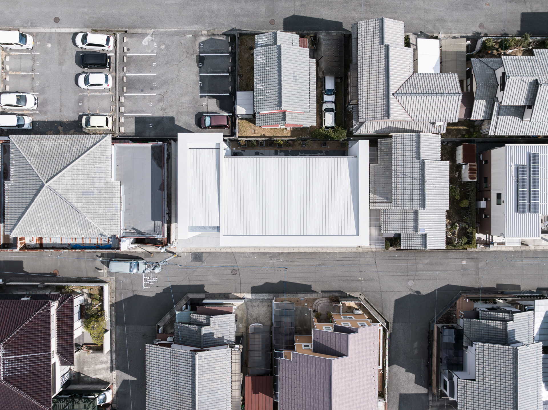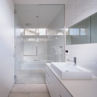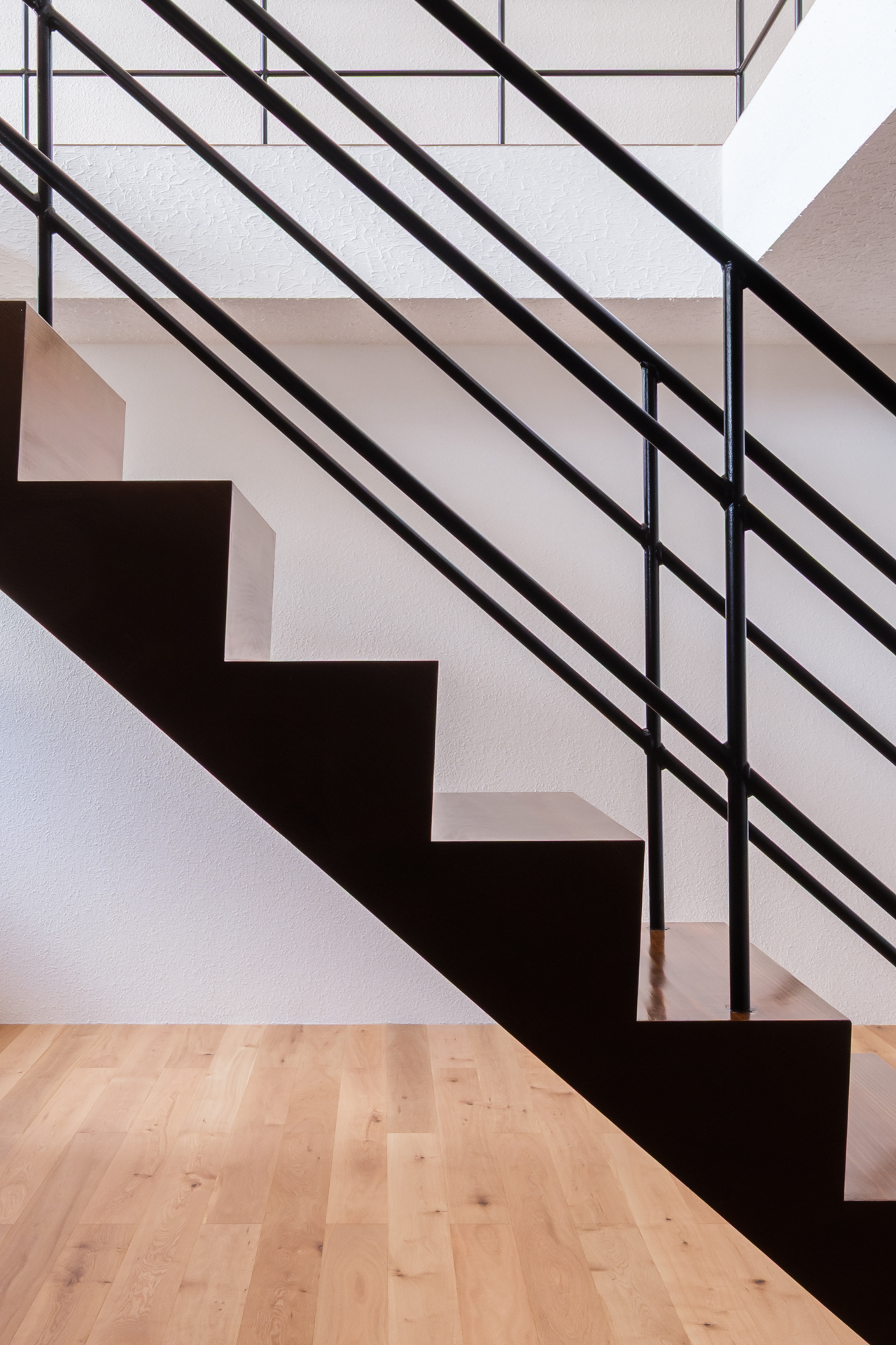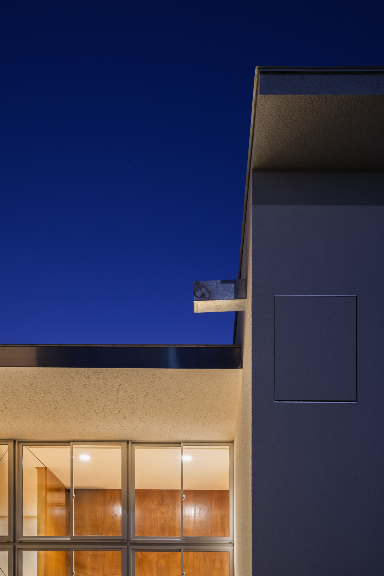 薄く大きな庇壁、地層のような床、階を越境するサッシ、日常的なスケールから少し逸脱した要素で全体を構成することで、シンプルながら、心地良い開放感と重厚感のある空間を目指した。