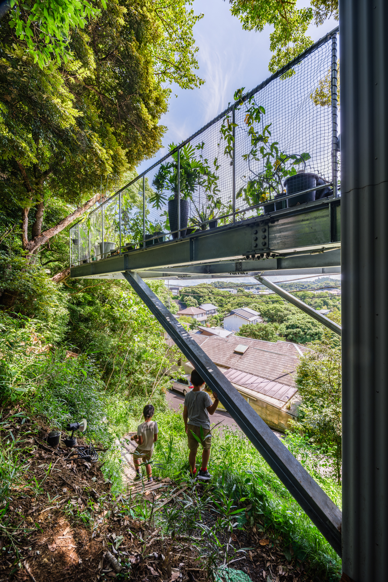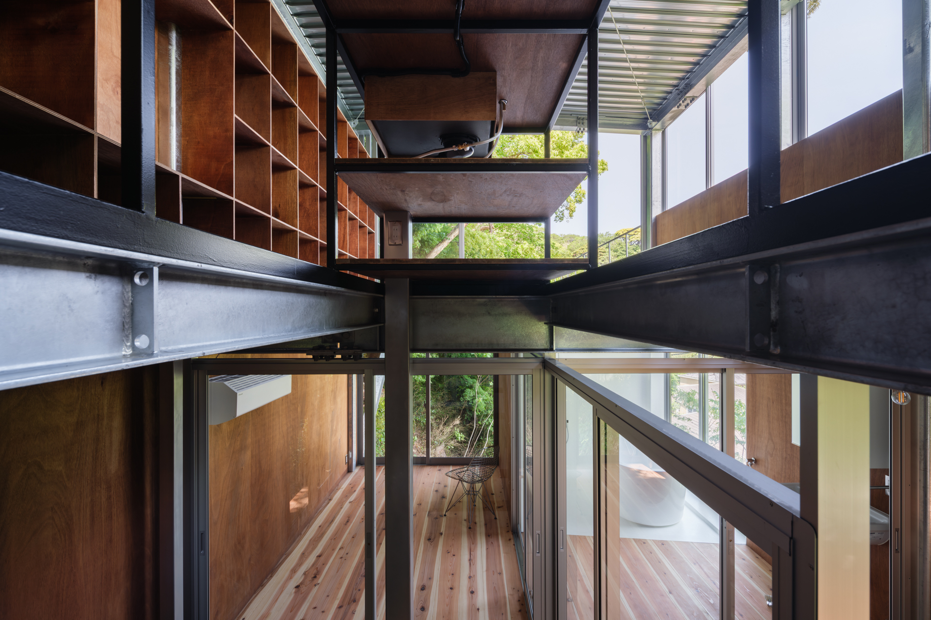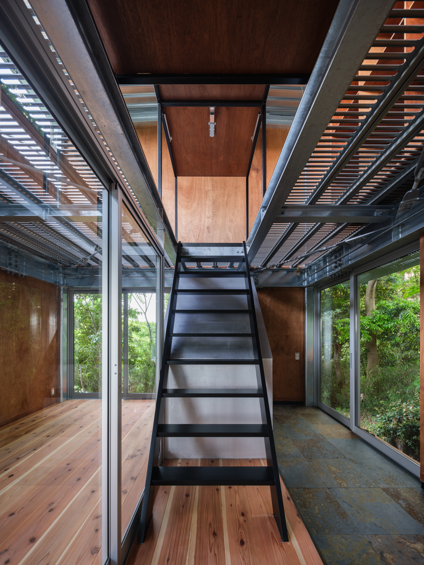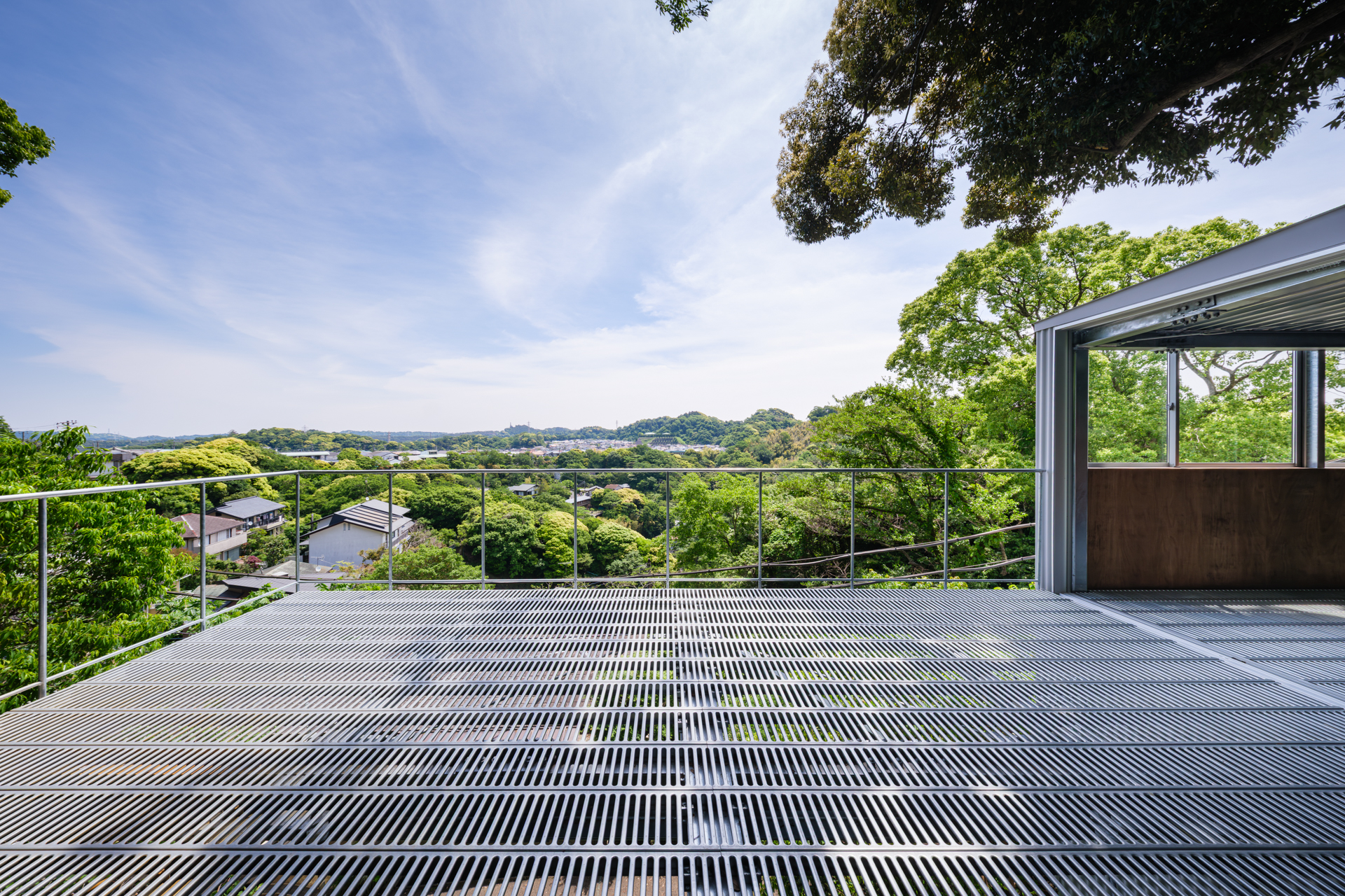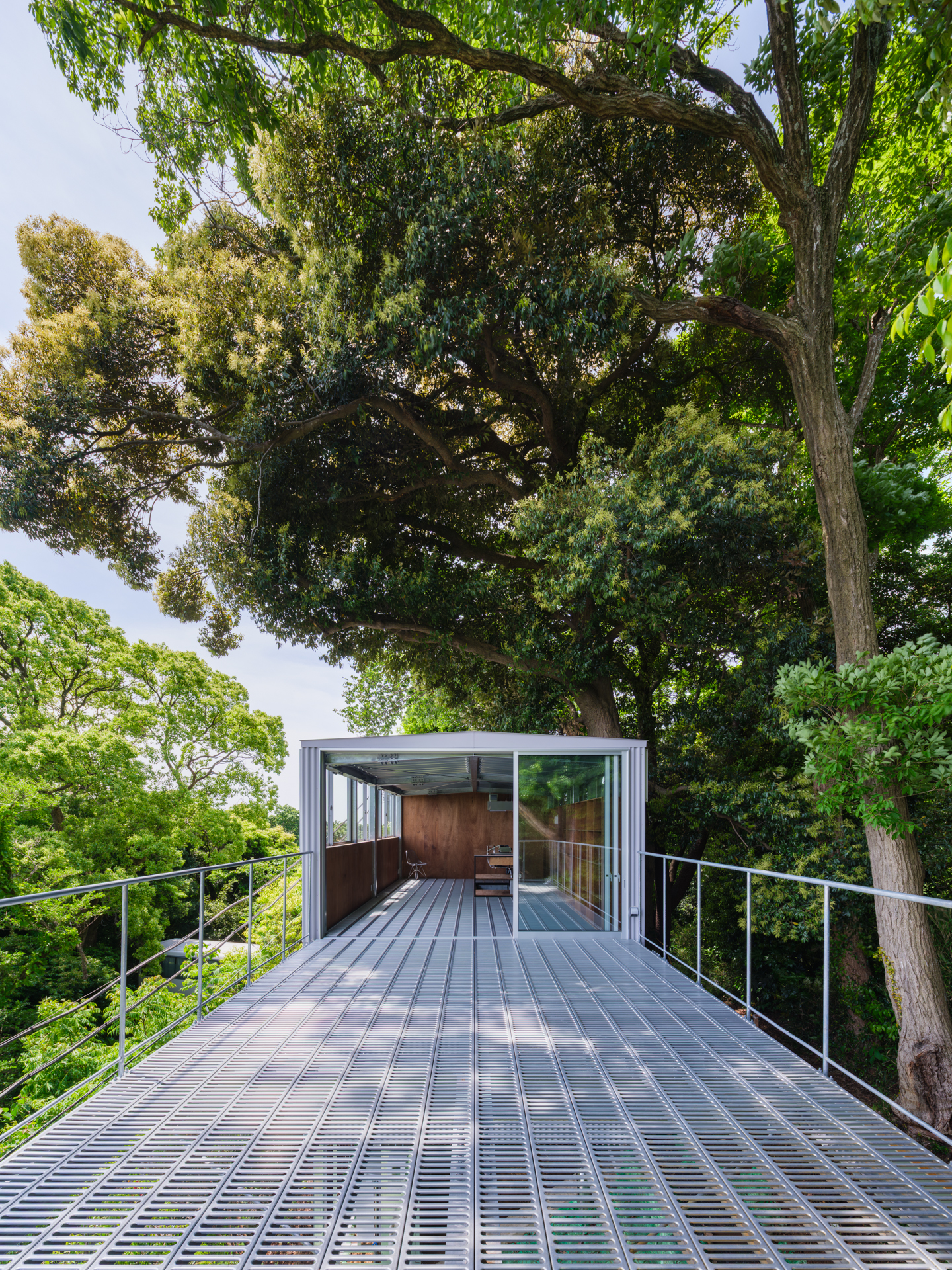 7年前、家族との山歩きの途中で偶然この土地と出会った。当時は自分たちの家を建てる計画などなく、漠然とここに大きなデッキがあると気持ちよいだろうなと思って見ていた。数年後、縁あってこの土地で自邸を建てることとなり、当時の想いそのままに大きなデッキをつくり、そこに生活を寄り添わせていくことを考えた。セットバックが厳しく高低差のある変形敷地に木を避けながら矩形で最も長くデッキを架けるため、また、森に対して最低限の干渉とするため、4本の柱のみ接地する独立基礎を採用した。ヤジロベエのようにバランスの取られたデッキは、半分をテラス、半分を内部化して居間とした。2階の床は「下地床」として、内外共にスリットの入ったデッキ材を用いた。仕上げとして絨毯を敷けば柔らかい床に、フローリングを敷けば硬い床に、手作業で簡単に取り外せば吹抜けにと生活に合わせ柔軟に変化していく。1階はサッシで十字に間仕切り、ふたつの個室、浴室洗面、玄関を同じ床面積とした。さらに1階のサッシは内外共に同じ寸法とし、同じ床面積と開口をもつ空間が合わせ鏡のように展開することで、床面積以上の広がりを感じさせる。また、自邸の設計を通して家族が集まって住むということも改めて考えた。せっかく人生の限れた時間を共有するのだから、家族の気配が日常としてあるような、そんな生活の記憶を残す家をつくりたい。この家に完全な個室はトイレのみである。1階のサッシと梁の間には隙間があり、上下階を隔てるのはデッキ材であるため、家中どこにいても家族の声は聞こえ、姿は見切れ、光を共有している。将来、家としての機能が必要とされなくなった時には、内部化されたデッキは再び外部化され、森に架かるデッキとして原初的な姿に戻るかもしれない。しかし、その際にも単なる展望台となるのではなく、確かにそこに人の生活があった痕跡が残っているだろう。森を受け入れながら大胆に住まう、そんな力強く柔軟な建築を目指した。