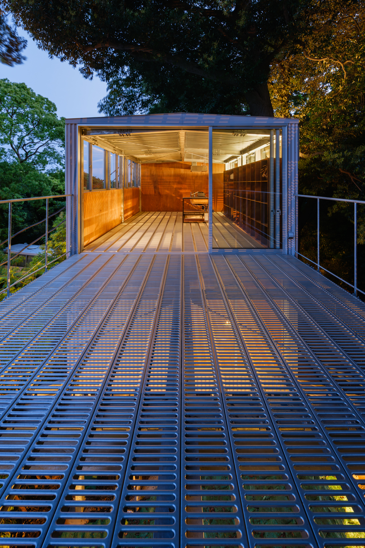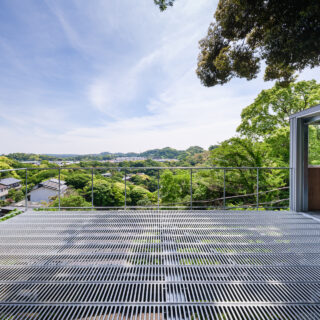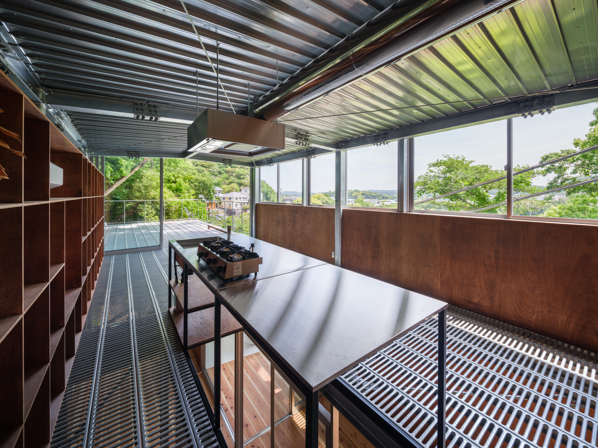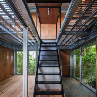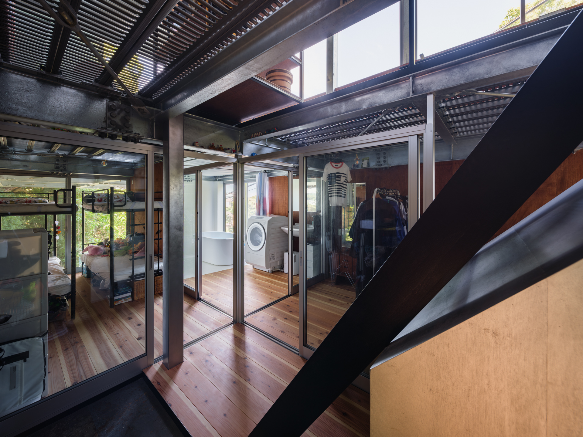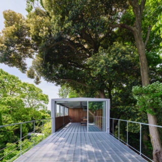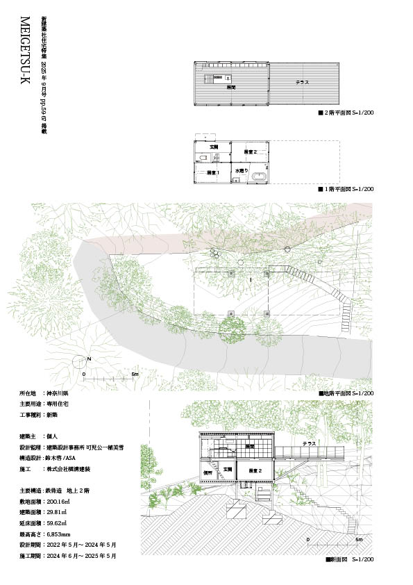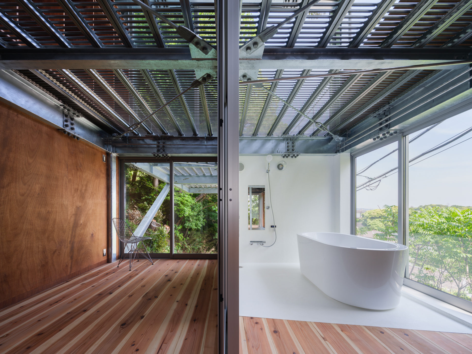 7年前、家族との山歩きの途中で偶然この土地と出会った。当時は自分たちの家を建てる計画などなく、漠然とここに大きなデッキがあると気持ちよいだろうなと思って見ていた。数年後、縁あってこの土地で自邸を建てることとなり、当時の想いそのままに大きなデッキをつくり、そこに生活を寄り添わせていくことを考えた。セットバックが厳しく高低差のある変形敷地に木を避けながら矩形で最も長くデッキを架けるため、また、森に対して最低限の干渉とするため、4本の柱のみ接地する独立基礎を採用した。ヤジロベエのようにバランスの取られたデッキは、半分をテラス、半分を内部化して居間とした。2階の床は「下地床」として、内外共にスリットの入ったデッキ材を用いた。仕上げとして絨毯を敷けば柔らかい床に、フローリングを敷けば硬い床に、手作業で簡単に取り外せば吹抜けにと生活に合わせ柔軟に変化していく。1階はサッシで十字に間仕切り、ふたつの個室、浴室洗面、玄関を同じ床面積とした。さらに1階のサッシは内外共に同じ寸法とし、同じ床面積と開口をもつ空間が合わせ鏡のように展開することで、床面積以上の広がりを感じさせる。また、自邸の設計を通して家族が集まって住むということも改めて考えた。せっかく人生の限れた時間を共有するのだから、家族の気配が日常としてあるような、そんな生活の記憶を残す家をつくりたい。この家に完全な個室はトイレのみである。1階のサッシと梁の間には隙間があり、上下階を隔てるのはデッキ材であるため、家中どこにいても家族の声は聞こえ、姿は見切れ、光を共有している。将来、家としての機能が必要とされなくなった時には、内部化されたデッキは再び外部化され、森に架かるデッキとして原初的な姿に戻るかもしれない。しかし、その際にも単なる展望台となるのではなく、確かにそこに人の生活があった痕跡が残っているだろう。森を受け入れながら大胆に住まう、そんな力強く柔軟な建築を目指した。