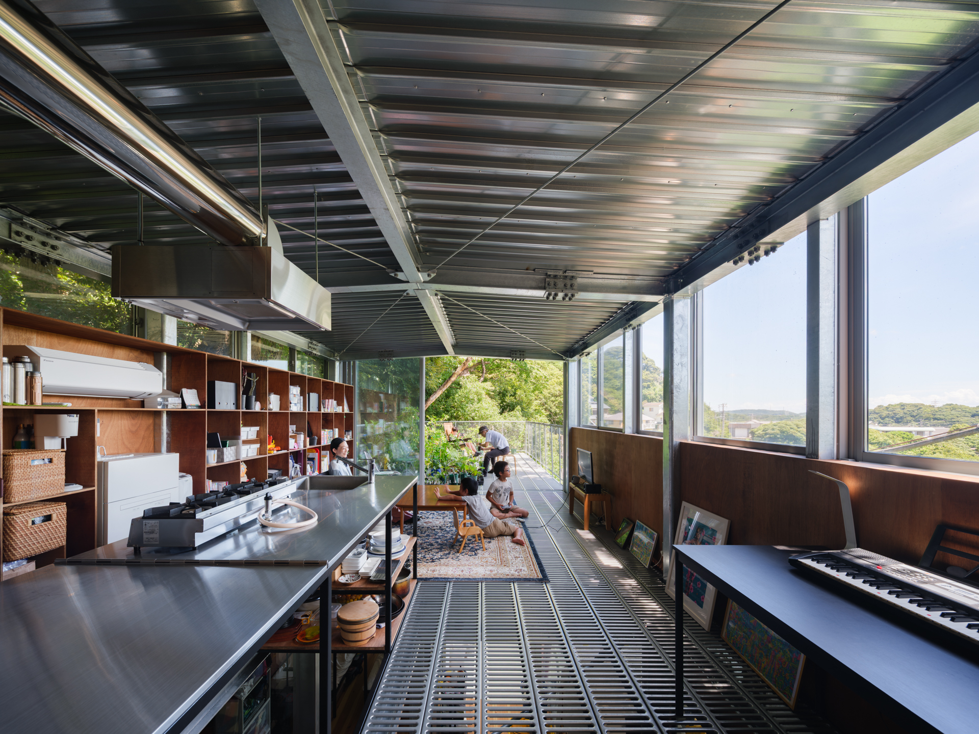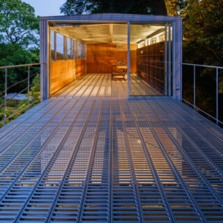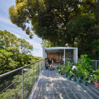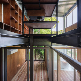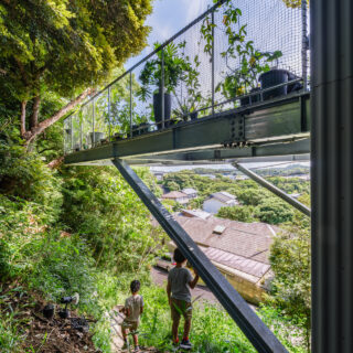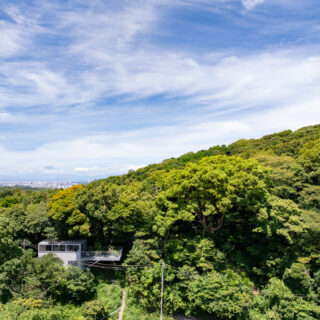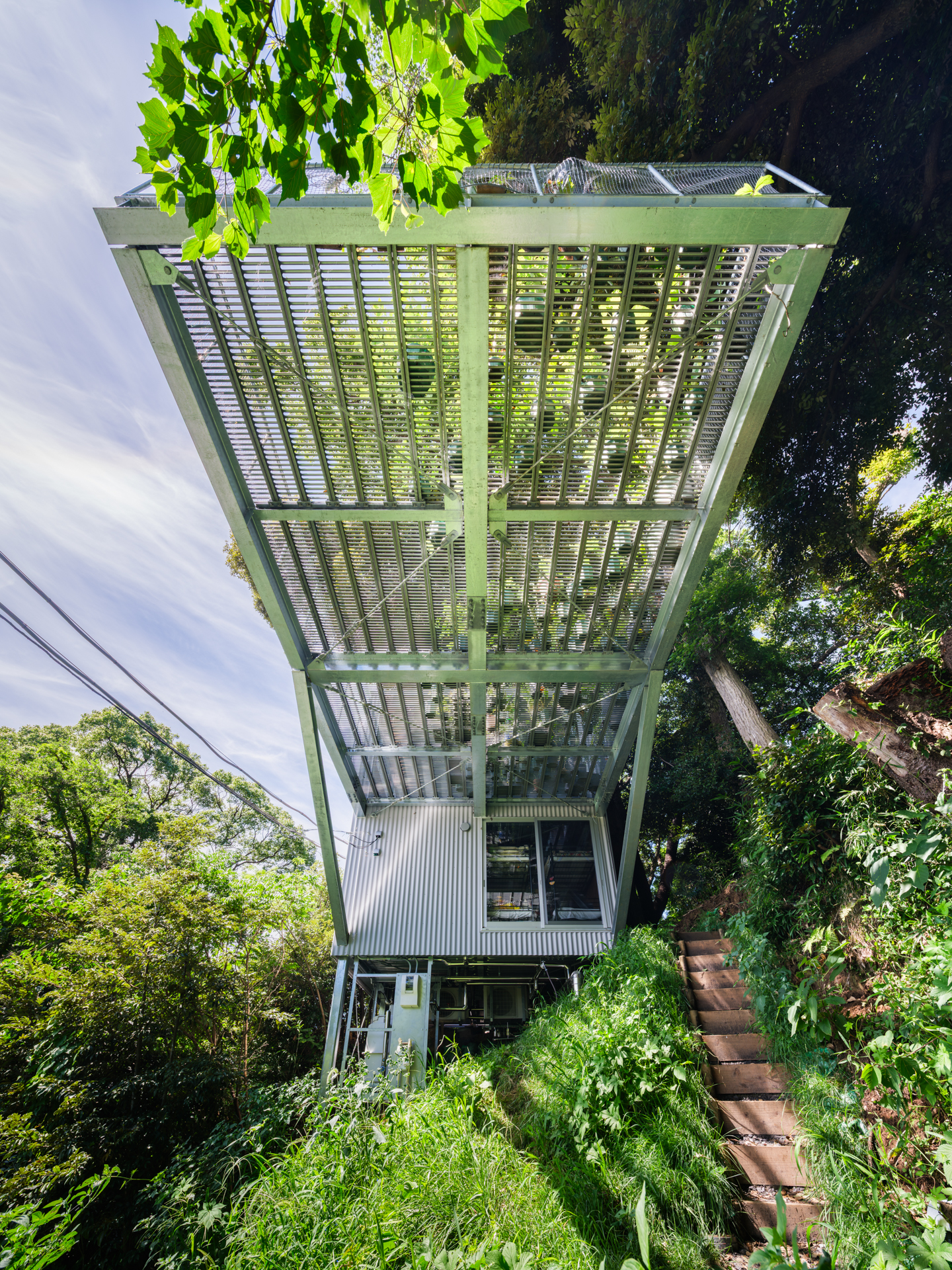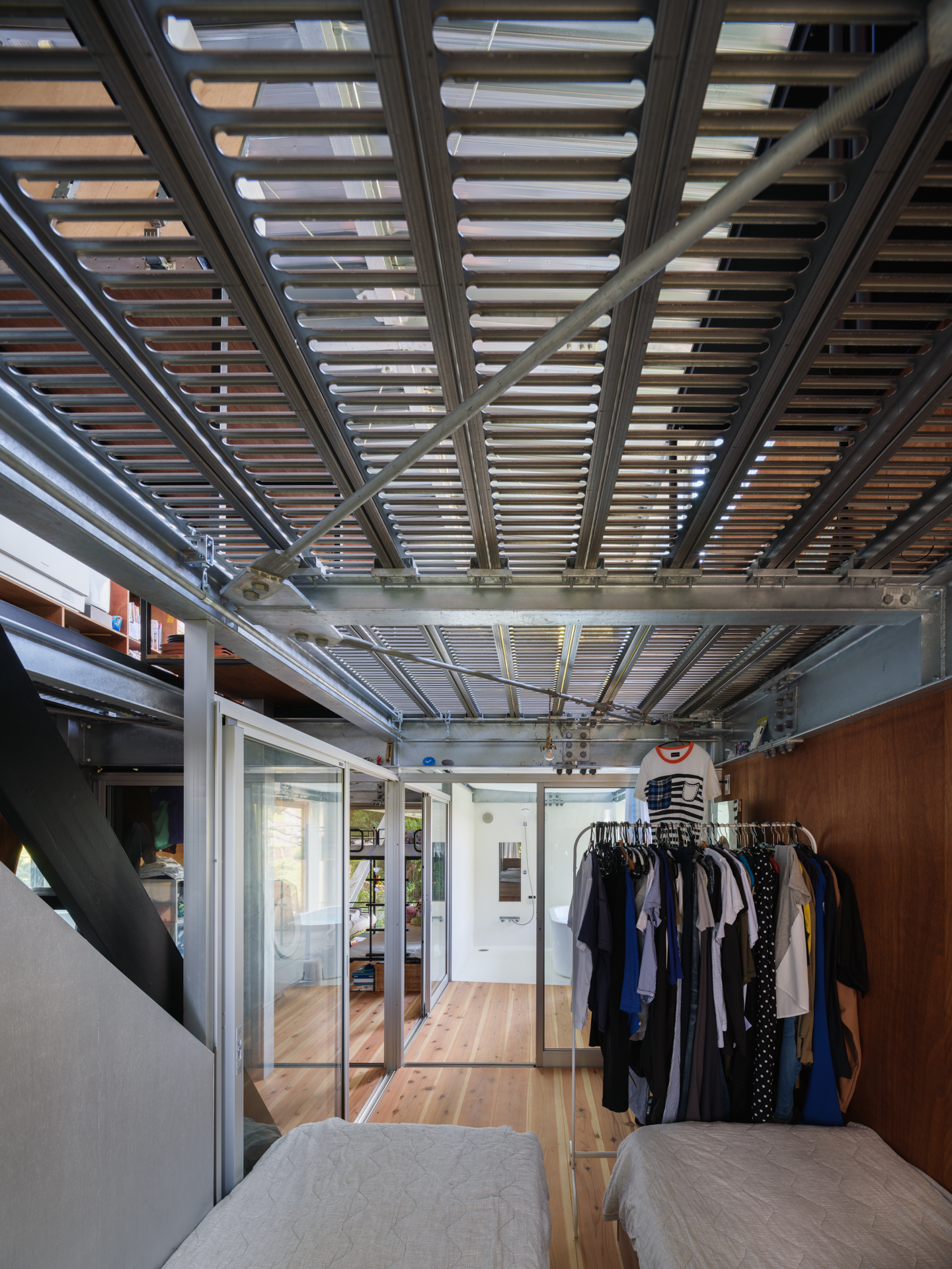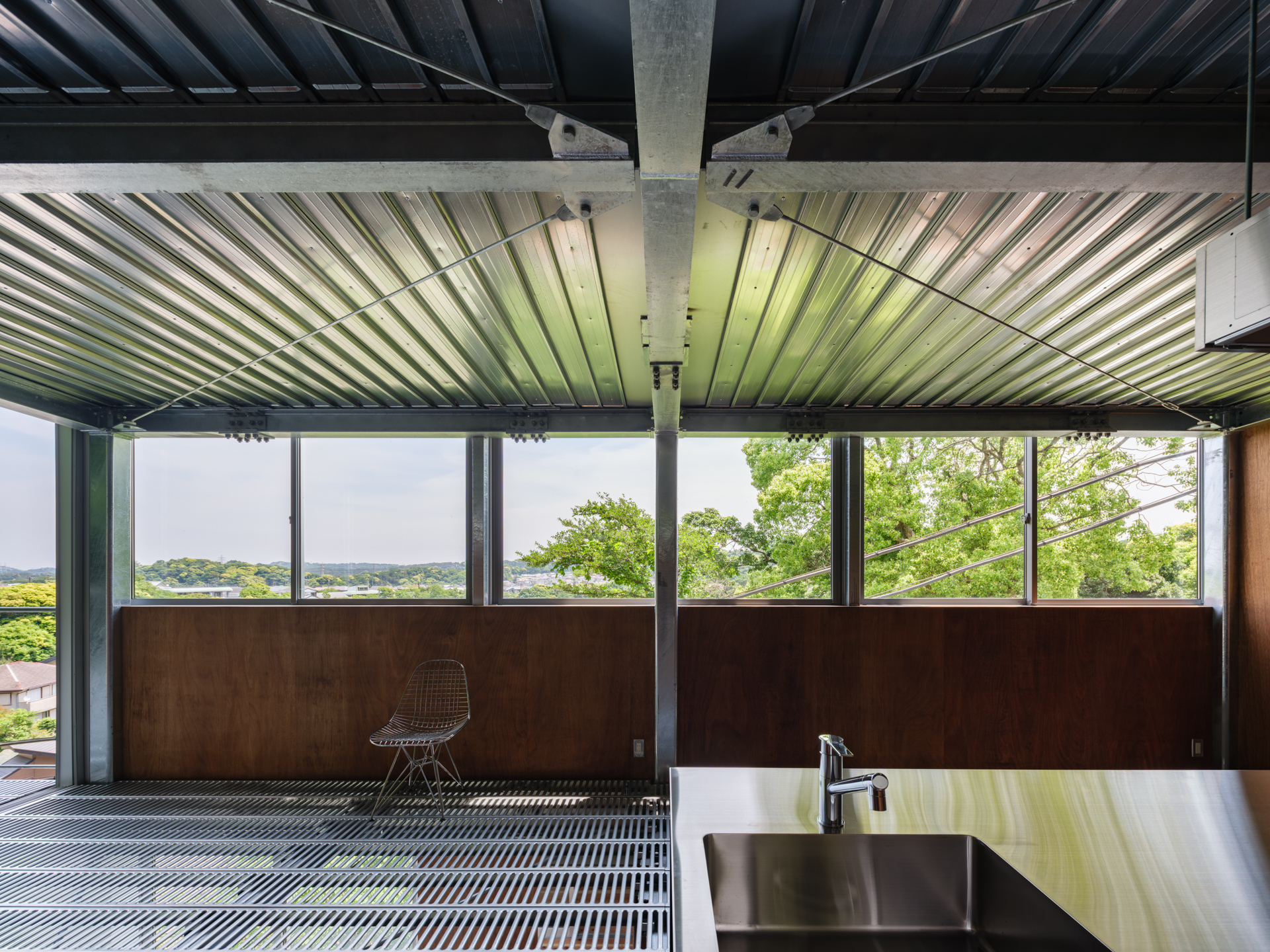 7年前、家族との山歩きの途中で偶然この土地と出会った。当時は自分たちの家を建てる計画などなく、漠然とここに大きなデッキがあると気持ちよいだろうなと思って見ていた。数年後、縁あってこの土地で自邸を建てることとなり、当時の想いそのままに大きなデッキをつくり、そこに生活を寄り添わせていくことを考えた。セットバックが厳しく高低差のある変形敷地に木を避けながら矩形で最も長くデッキを架けるため、また、森に対して最低限の干渉とするため、4本の柱のみ接地する独立基礎を採用した。ヤジロベエのようにバランスの取られたデッキは、半分をテラス、半分を内部化して居間とした。2階の床は「下地床」として、内外共にスリットの入ったデッキ材を用いた。仕上げとして絨毯を敷けば柔らかい床に、フローリングを敷けば硬い床に、手作業で簡単に取り外せば吹抜けにと生活に合わせ柔軟に変化していく。1階はサッシで十字に間仕切り、ふたつの個室、浴室洗面、玄関を同じ床面積とした。さらに1階のサッシは内外共に同じ寸法とし、同じ床面積と開口をもつ空間が合わせ鏡のように展開することで、床面積以上の広がりを感じさせる。また、自邸の設計を通して家族が集まって住むということも改めて考えた。せっかく人生の限れた時間を共有するのだから、家族の気配が日常としてあるような、そんな生活の記憶を残す家をつくりたい。この家に完全な個室はトイレのみである。1階のサッシと梁の間には隙間があり、上下階を隔てるのはデッキ材であるため、家中どこにいても家族の声は聞こえ、姿は見切れ、光を共有している。将来、家としての機能が必要とされなくなった時には、内部化されたデッキは再び外部化され、森に架かるデッキとして原初的な姿に戻るかもしれない。しかし、その際にも単なる展望台となるのではなく、確かにそこに人の生活があった痕跡が残っているだろう。森を受け入れながら大胆に住まう、そんな力強く柔軟な建築を目指した。