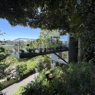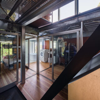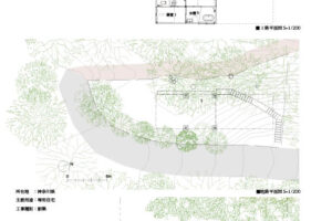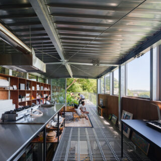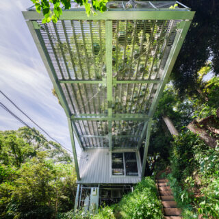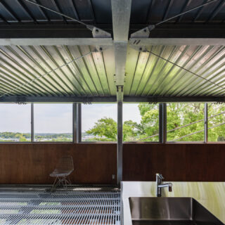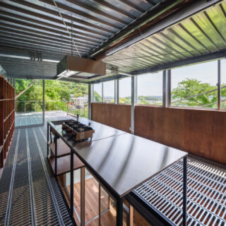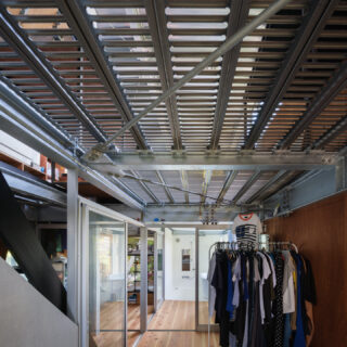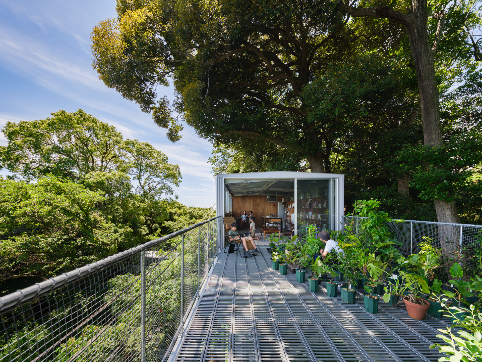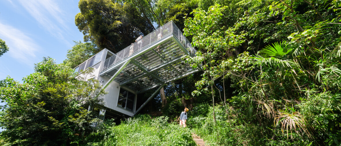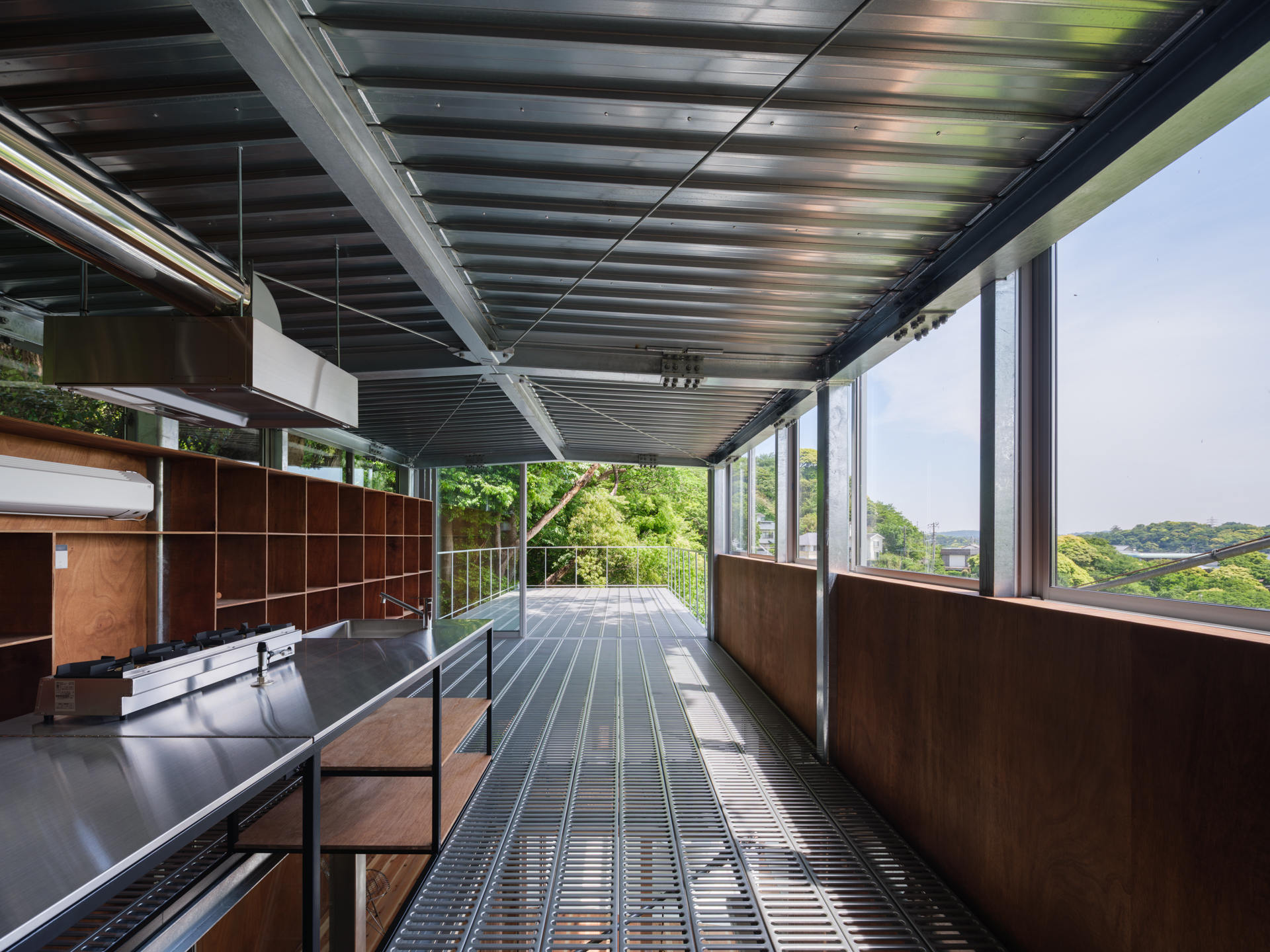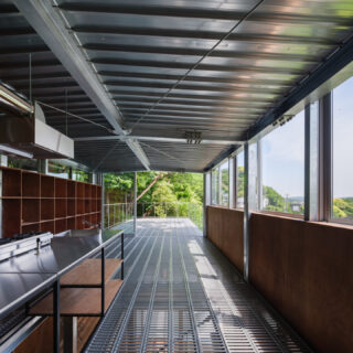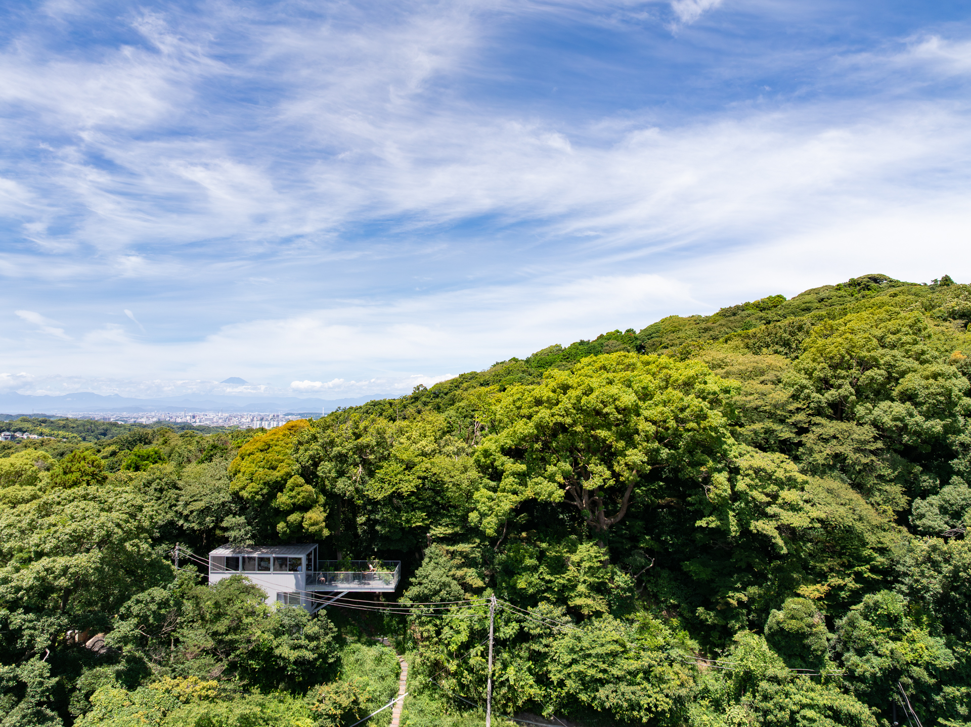 7年前、家族との山歩きの途中で偶然この土地と出会った。当時は自分たちの家を建てる計画などなく、漠然とここに大きなデッキがあると気持ちよいだろうなと思って見ていた。数年後、縁あってこの土地で自邸を建てることとなり、当時の想いそのままに大きなデッキをつくり、そこに生活を寄り添わせていくことを考えた。セットバックが厳しく高低差のある変形敷地に木を避けながら矩形で最も長くデッキを架けるため、また、森に対して最低限の干渉とするため、4本の柱のみ接地する独立基礎を採用した。ヤジロベエのようにバランスの取られたデッキは、半分をテラス、半分を内部化して居間とした。2階の床は「下地床」として、内外共にスリットの入ったデッキ材を用いた。仕上げとして絨毯を敷けば柔らかい床に、フローリングを敷けば硬い床に、手作業で簡単に取り外せば吹抜けにと生活に合わせ柔軟に変化していく。1階はサッシで十字に間仕切り、ふたつの個室、浴室洗面、玄関を同じ床面積とした。さらに1階のサッシは内外共に同じ寸法とし、同じ床面積と開口をもつ空間が合わせ鏡のように展開することで、床面積以上の広がりを感じさせる。また、自邸の設計を通して家族が集まって住むということも改めて考えた。せっかく人生の限れた時間を共有するのだから、家族の気配が日常としてあるような、そんな生活の記憶を残す家をつくりたい。この家に完全な個室はトイレのみである。1階のサッシと梁の間には隙間があり、上下階を隔てるのはデッキ材であるため、家中どこにいても家族の声は聞こえ、姿は見切れ、光を共有している。将来、家としての機能が必要とされなくなった時には、内部化されたデッキは再び外部化され、森に架かるデッキとして原初的な姿に戻るかもしれない。しかし、その際にも単なる展望台となるのではなく、確かにそこに人の生活があった痕跡が残っているだろう。森を受け入れながら大胆に住まう、そんな力強く柔軟な建築を目指した。