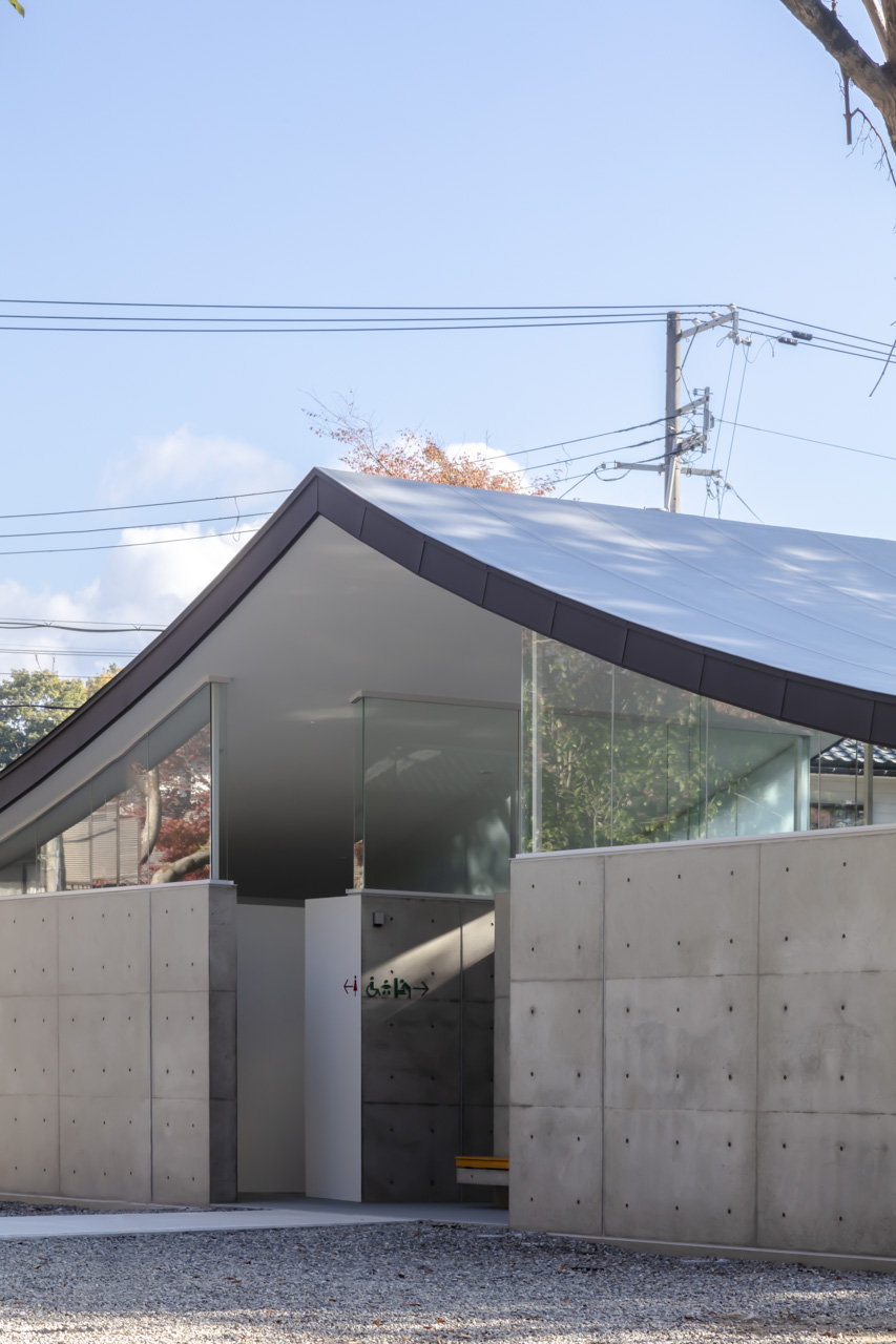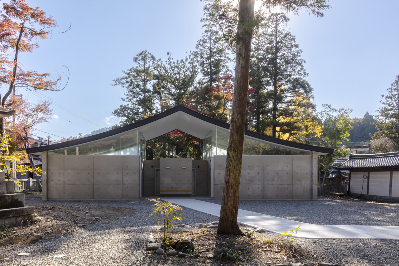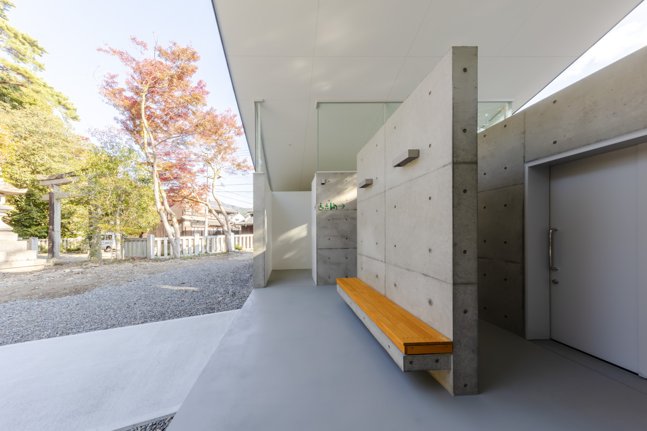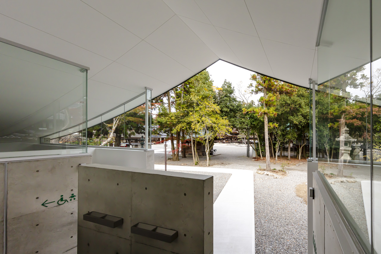 トイレ空間を 2.6m高のコンクリート壁で囲み、その上に本殿・拝殿を踏襲した反り屋根を架けています。トイレ空間のプライベート性を保ちつつ、室内はコンクリート壁と反り屋根の隙間から境内の木々の緑が望め、木漏れ日で満たされた明るい空間を実現しました。