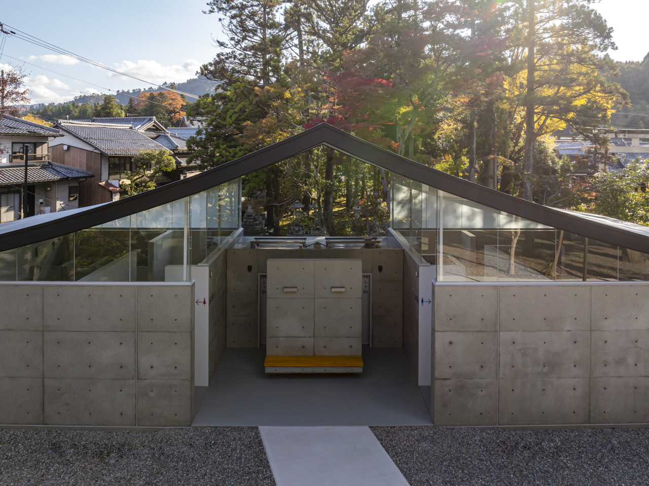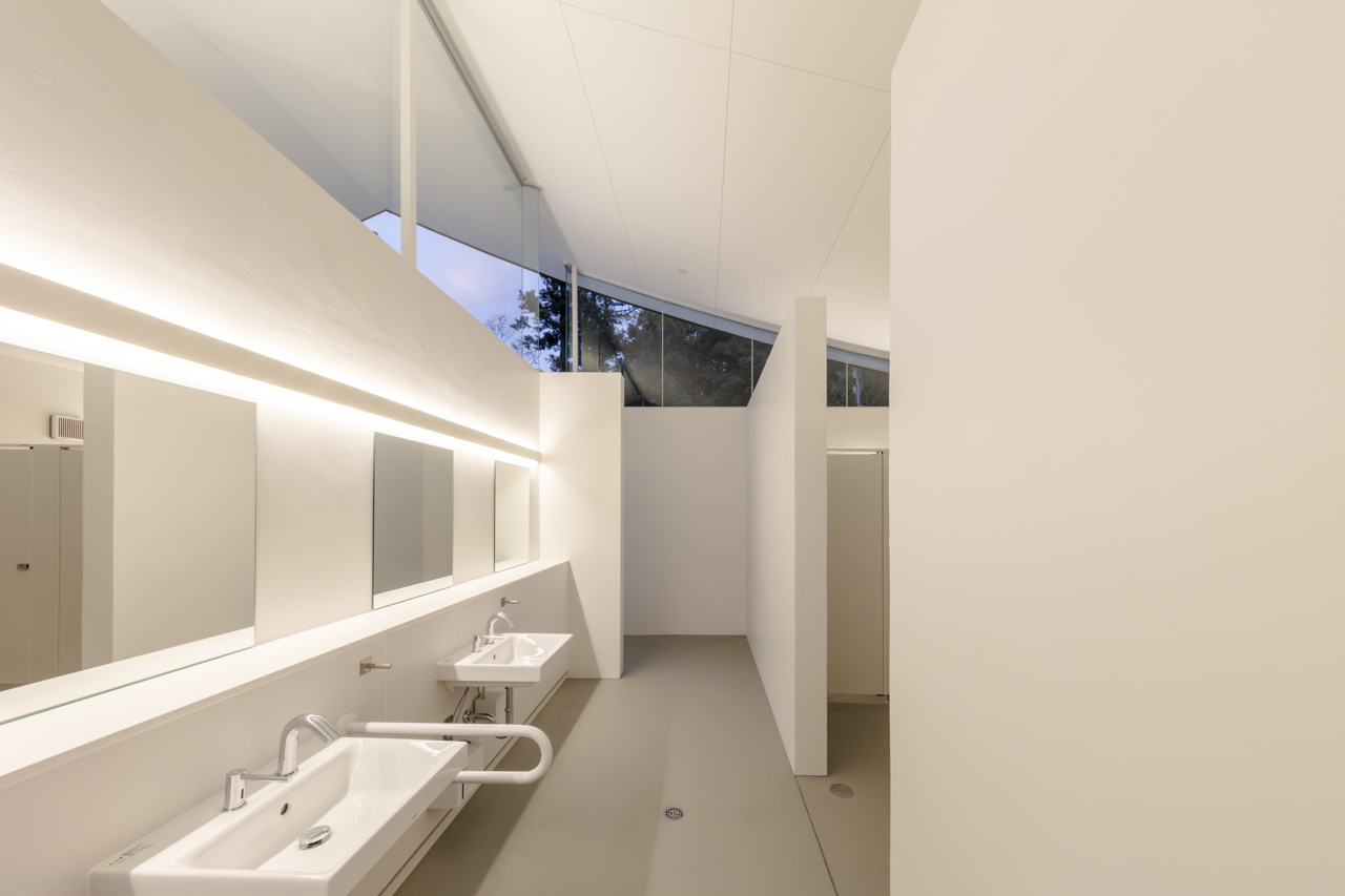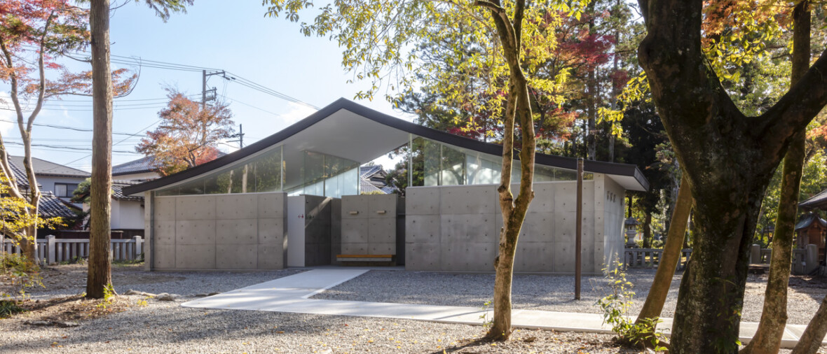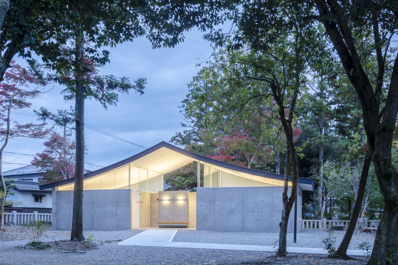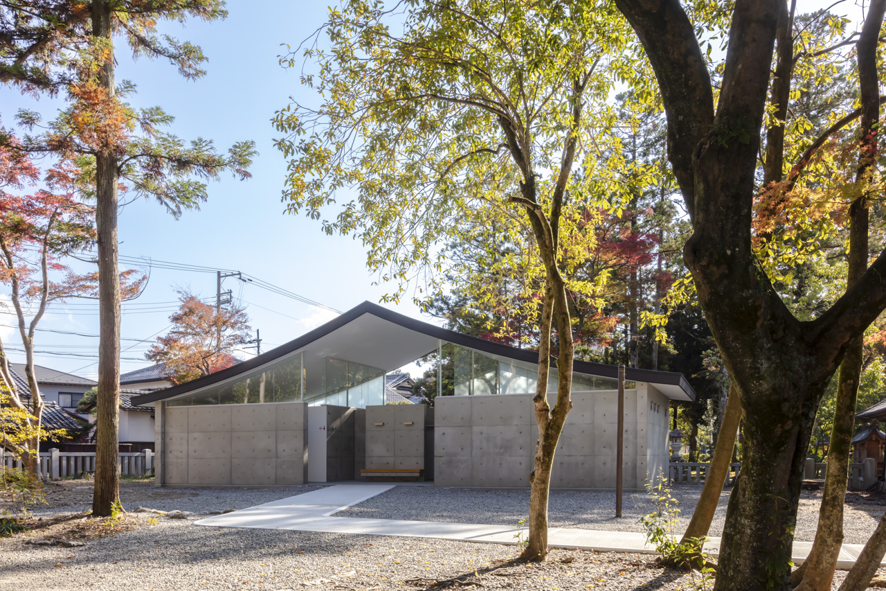 トイレ空間を 2.6m高のコンクリート壁で囲み、その上に本殿・拝殿を踏襲した反り屋根を架けています。トイレ空間のプライベート性を保ちつつ、室内はコンクリート壁と反り屋根の隙間から境内の木々の緑が望め、木漏れ日で満たされた明るい空間を実現しました。
