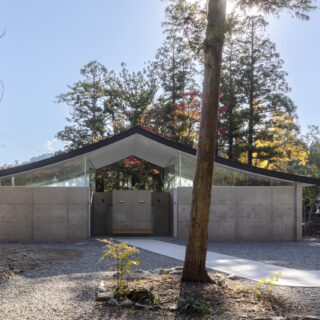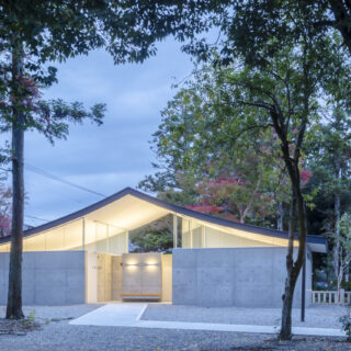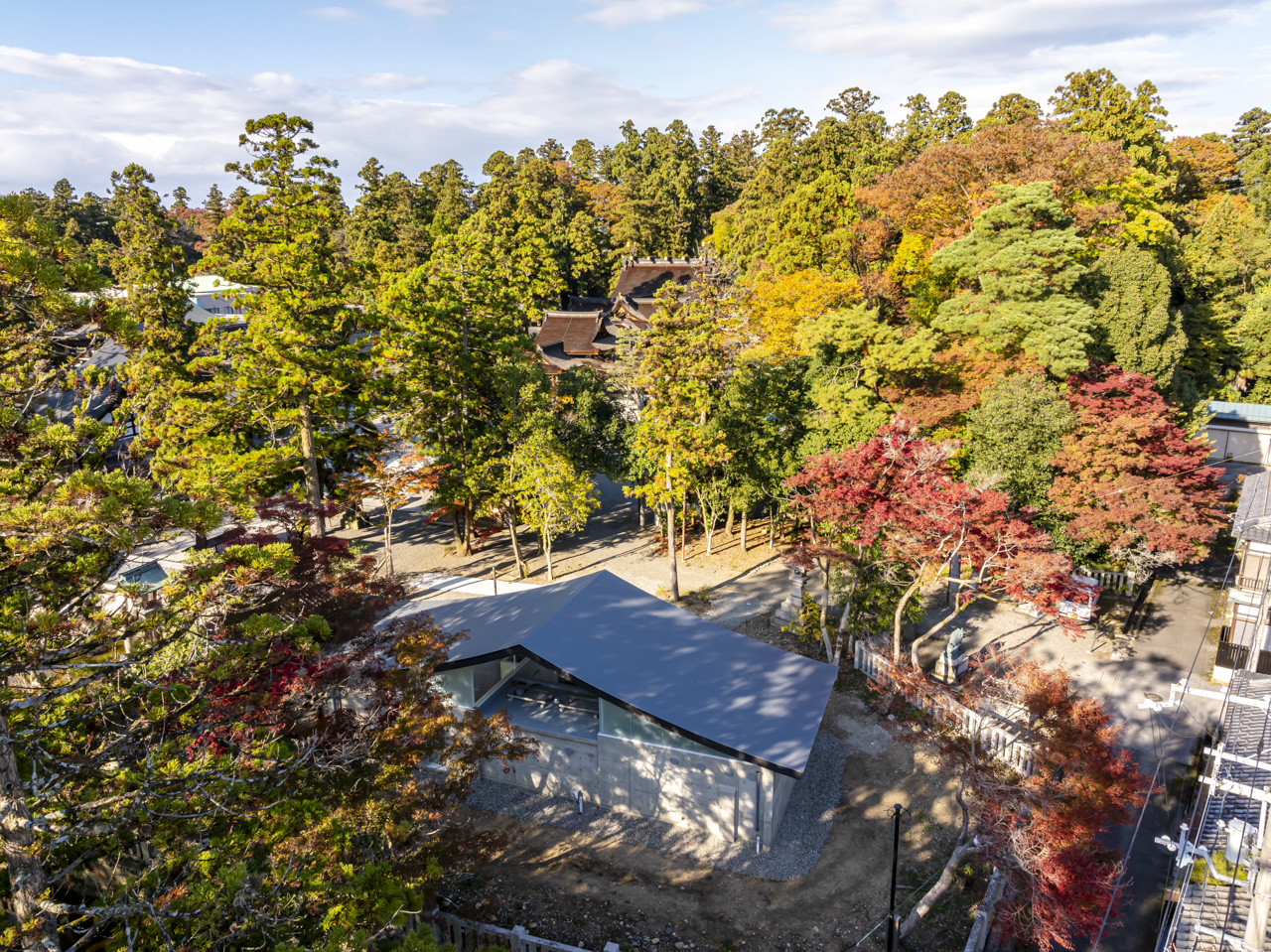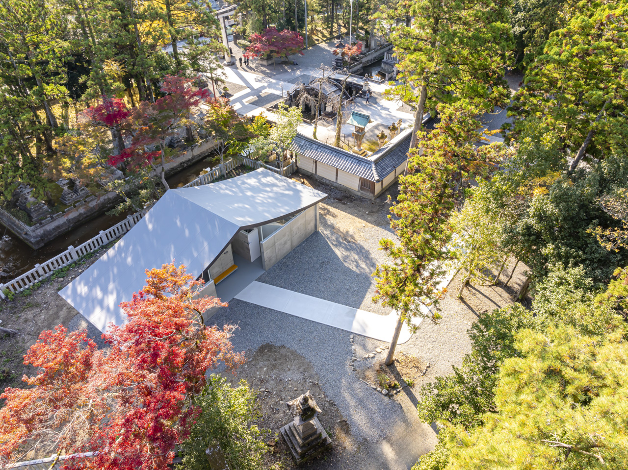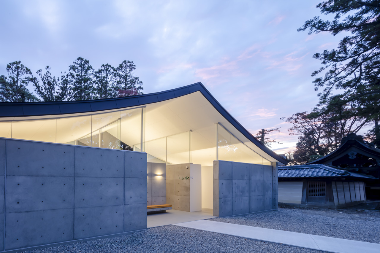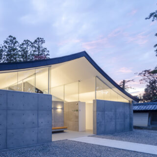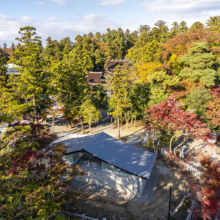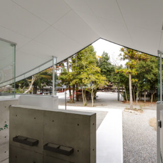 ソリッドなコンクリートとその上に浮かぶ抽象的な反り屋根の構成は数百年に渡る境内の風景に馴染みつつ、現代的なシンボル性も併せ持つ新たなランドマークとなっています。