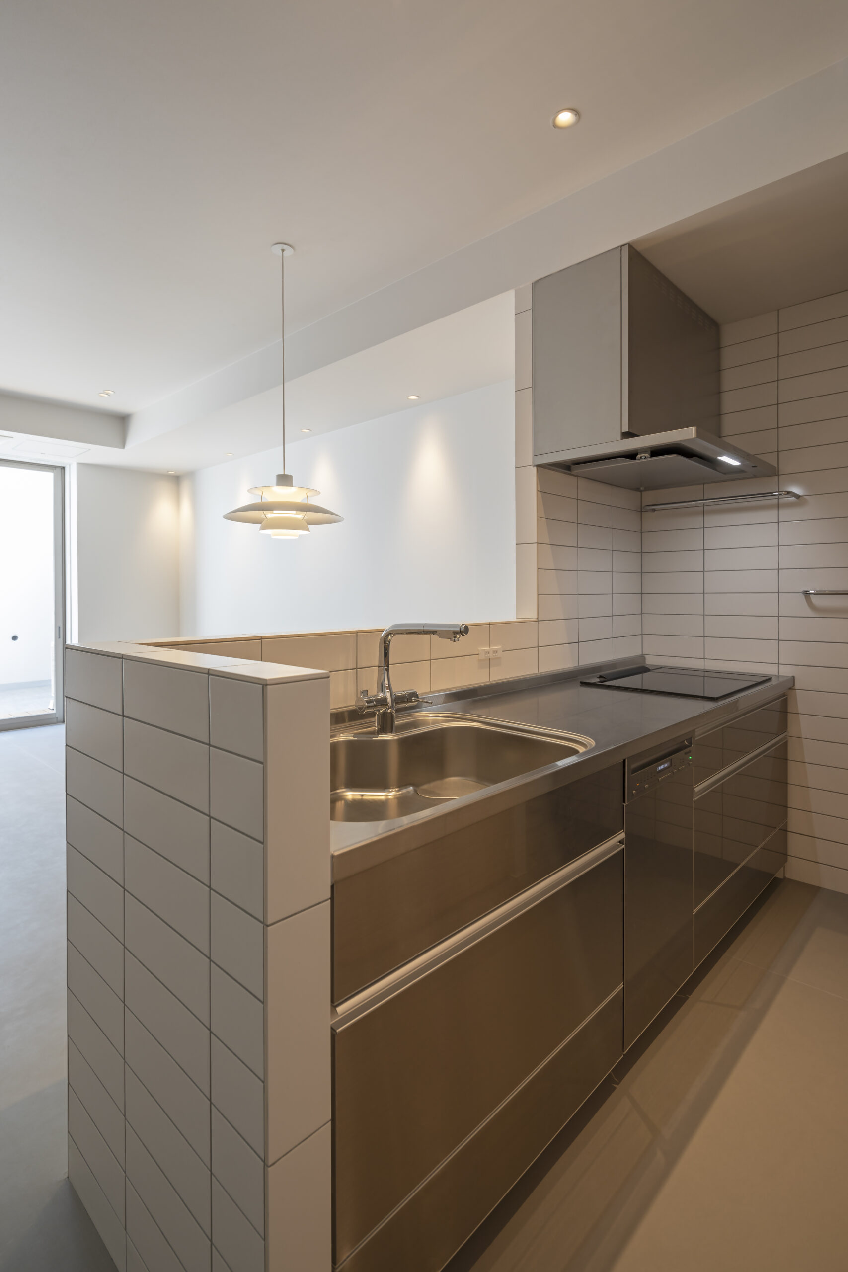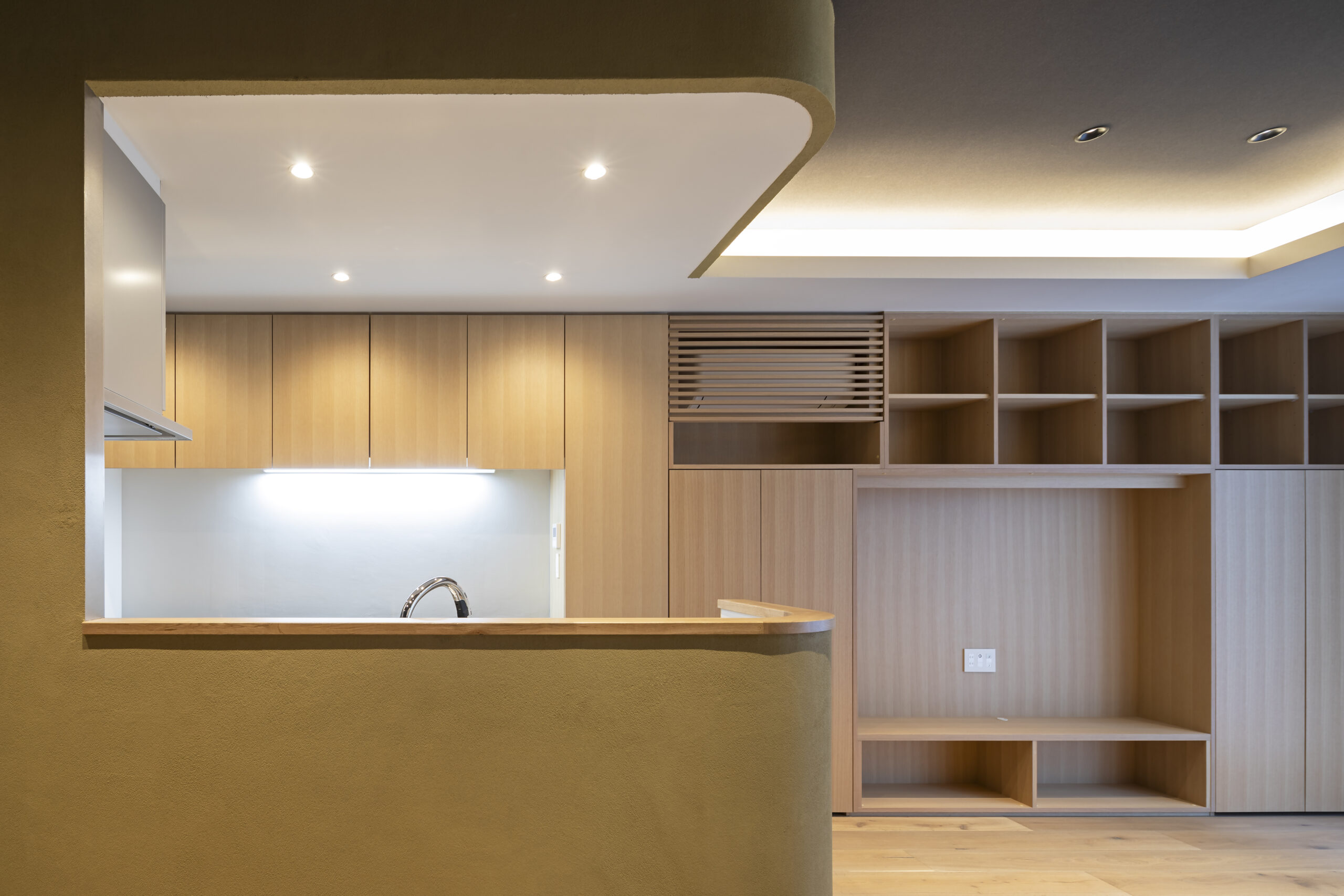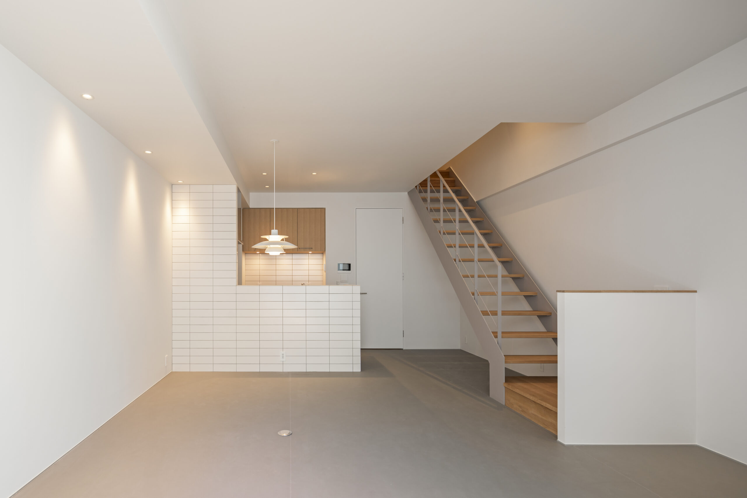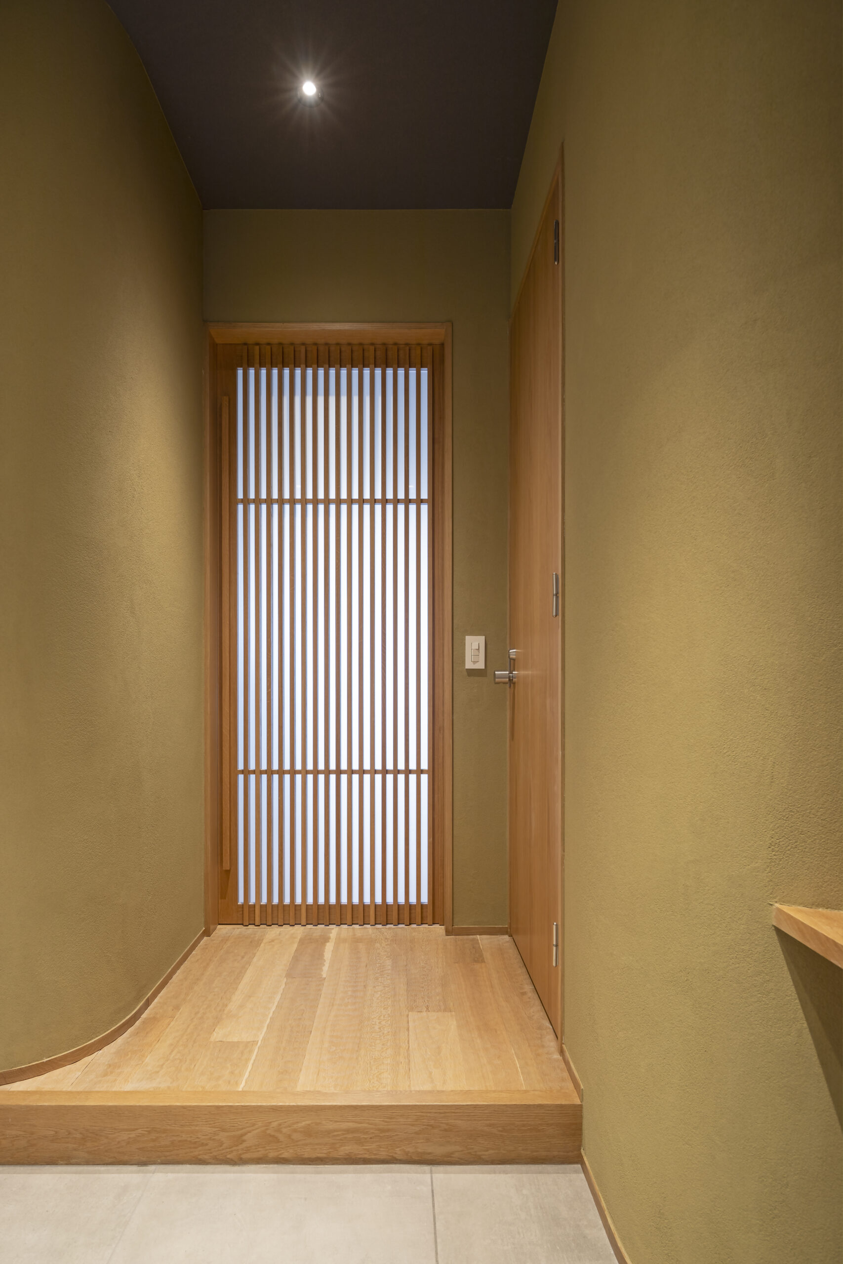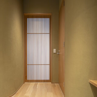 ⽩を基調とつつグレージュと⽊⽬をアクセントとしたミニマルな住まい、格⼦⼾や左官仕上げなど和