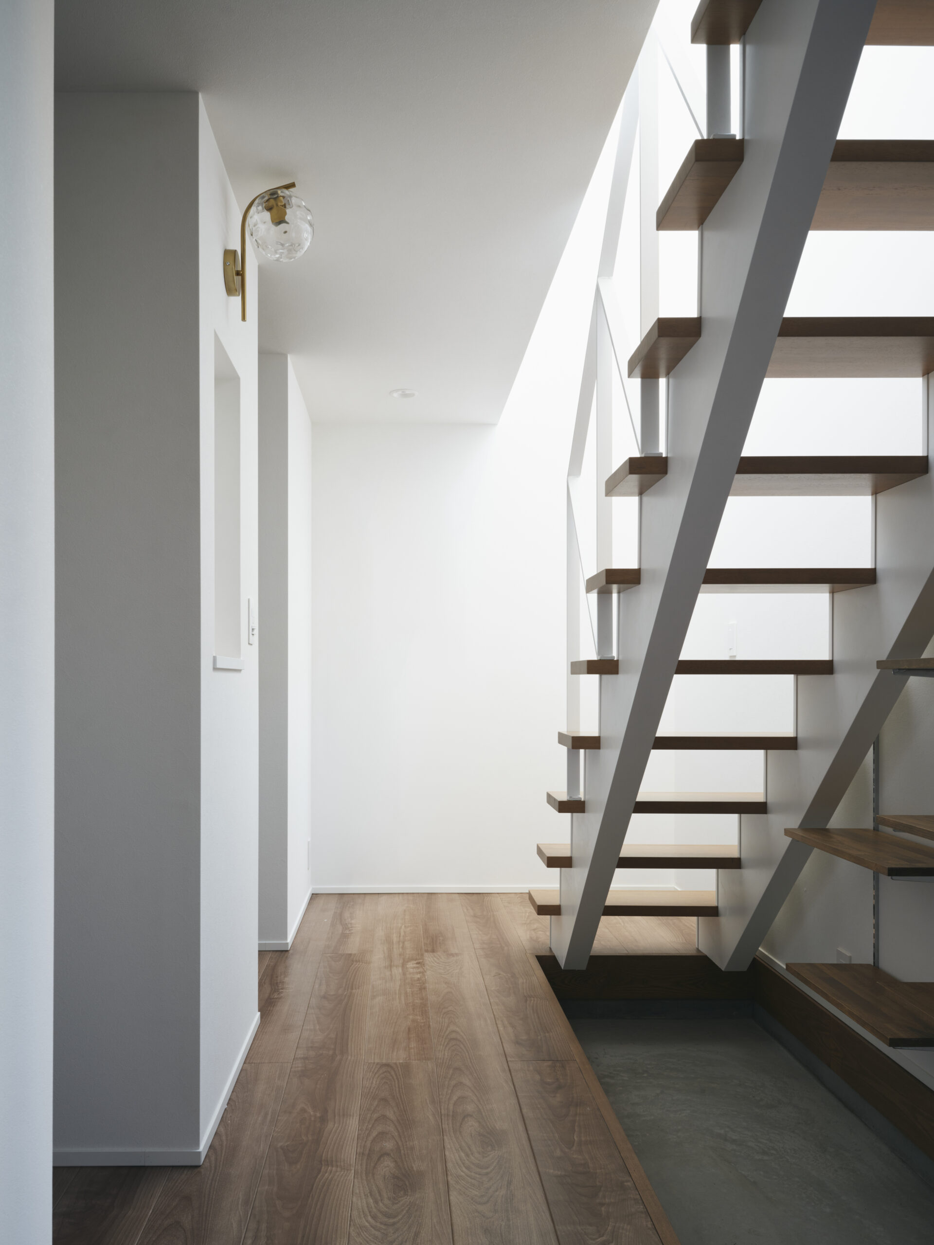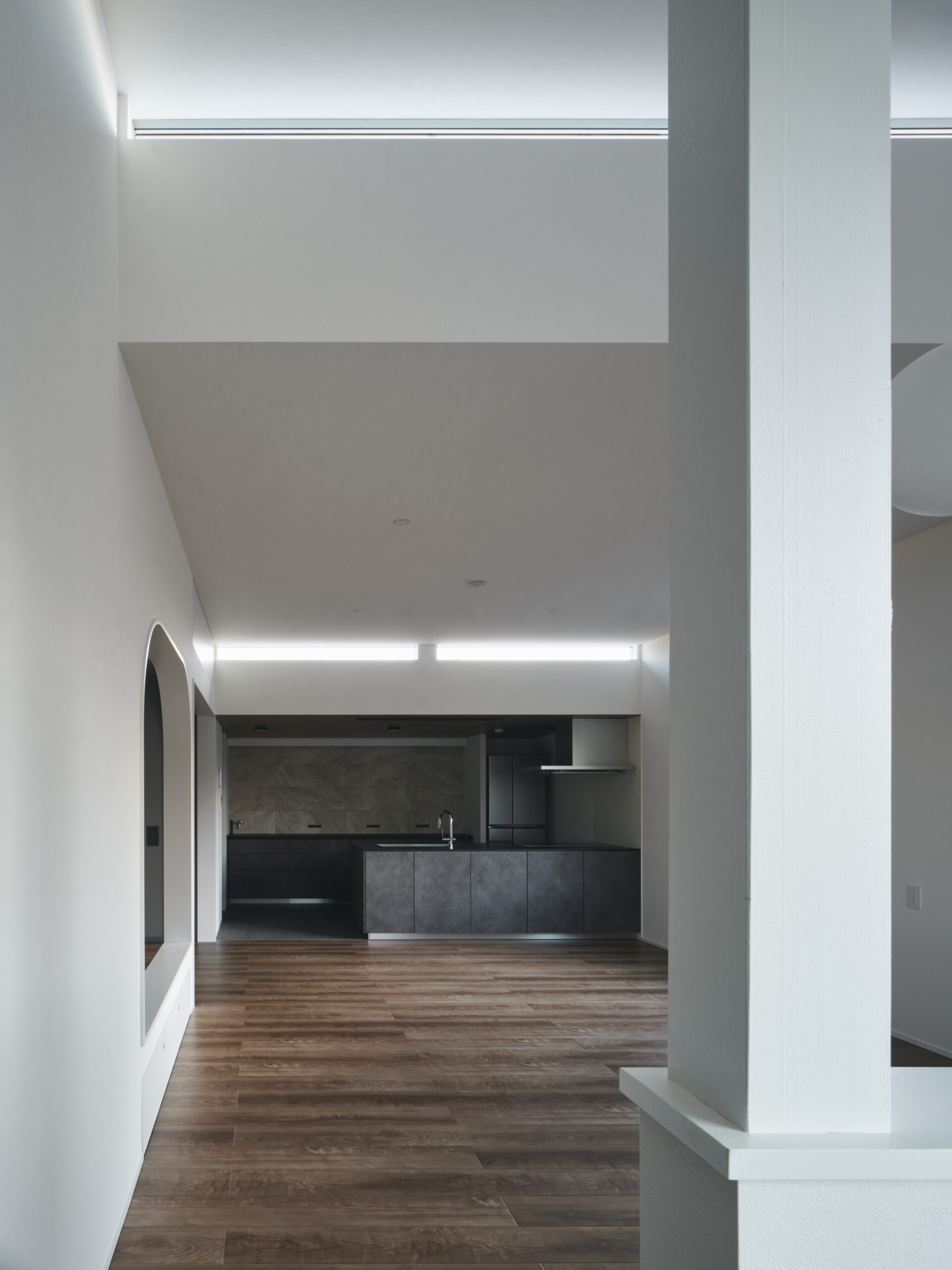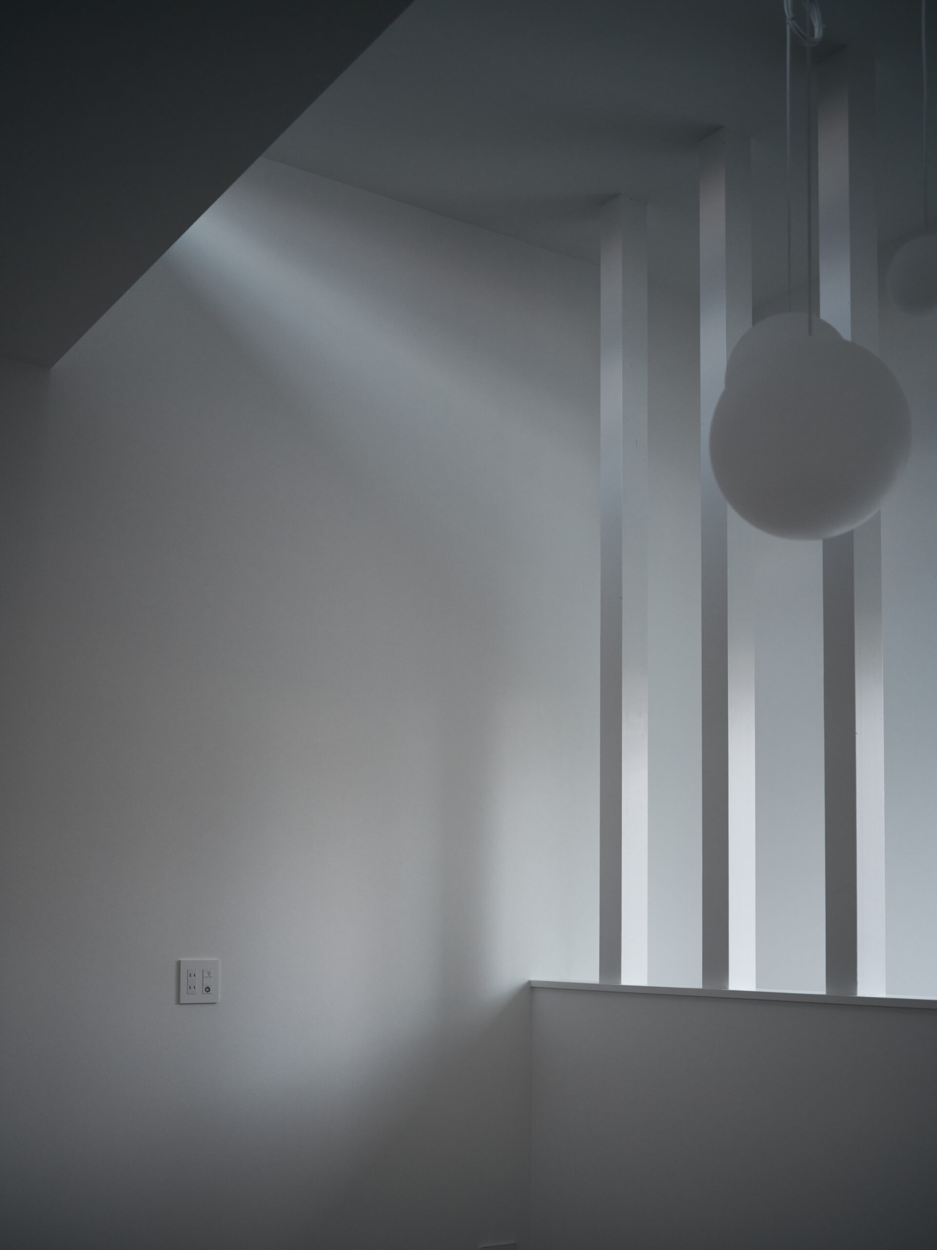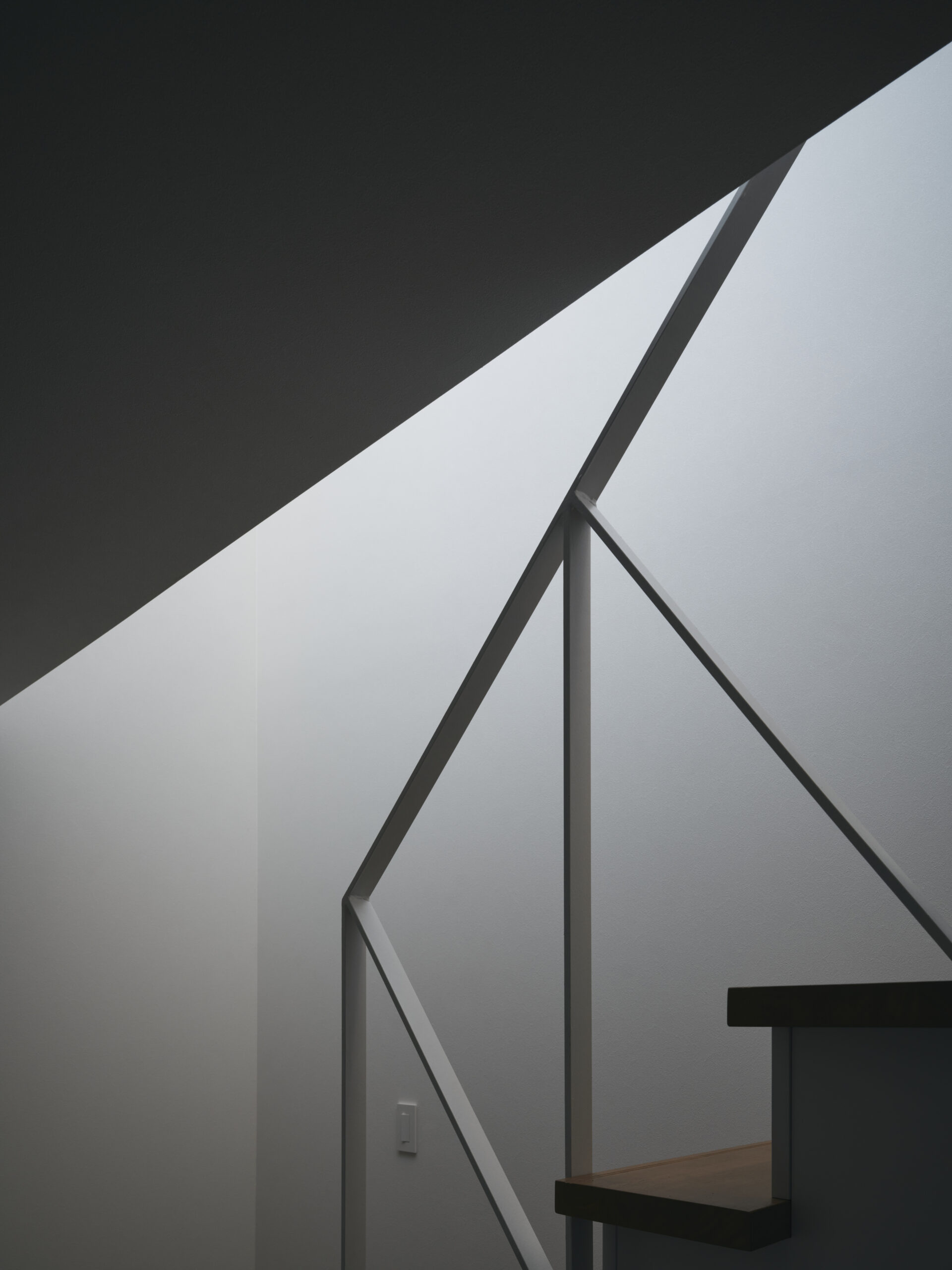 1階の低い軸を抜けて2階に上がると、南のハイサイドライトが天井を沿って滑り、光と影が歩みとともに微かに位置を変える。