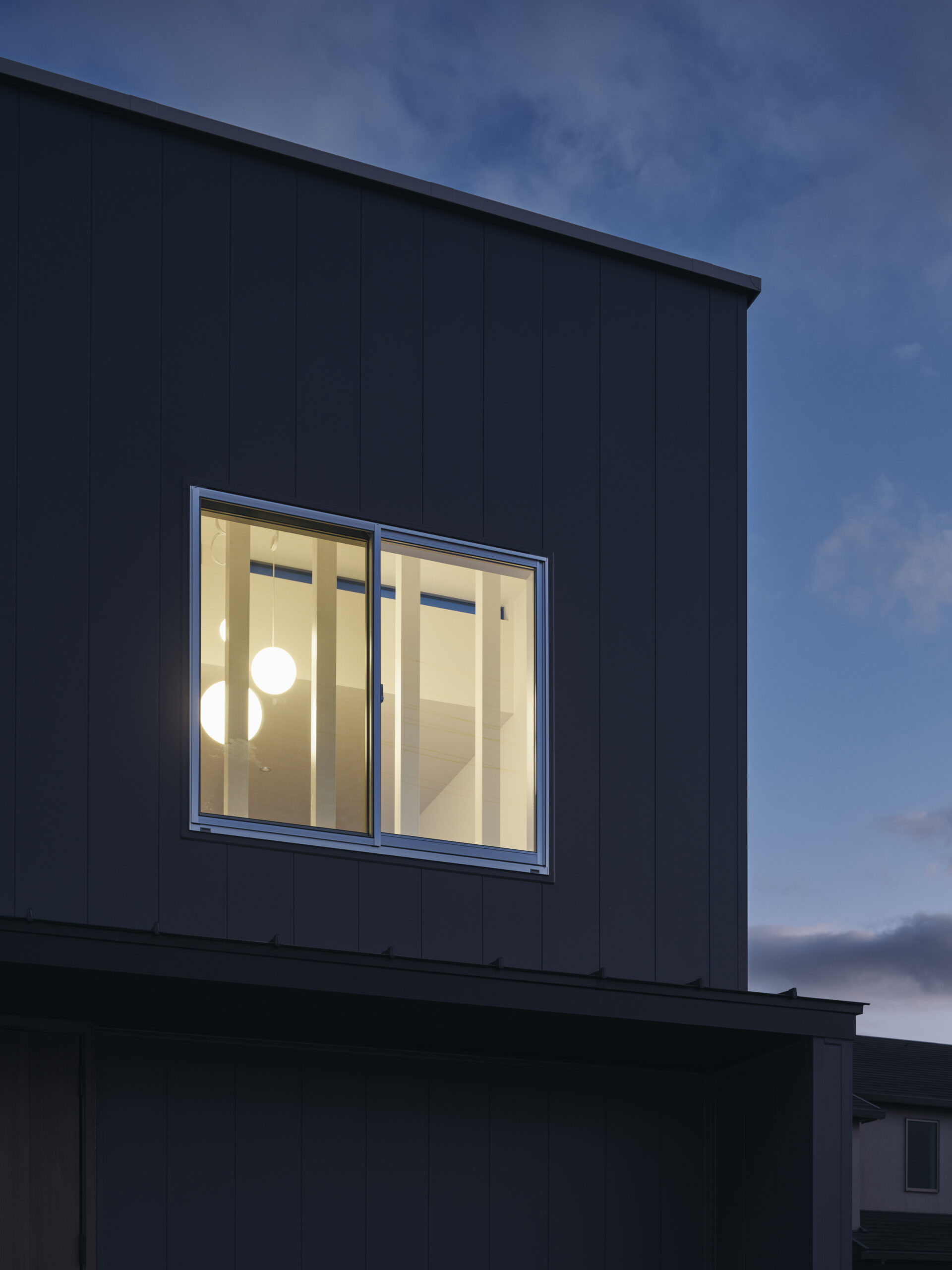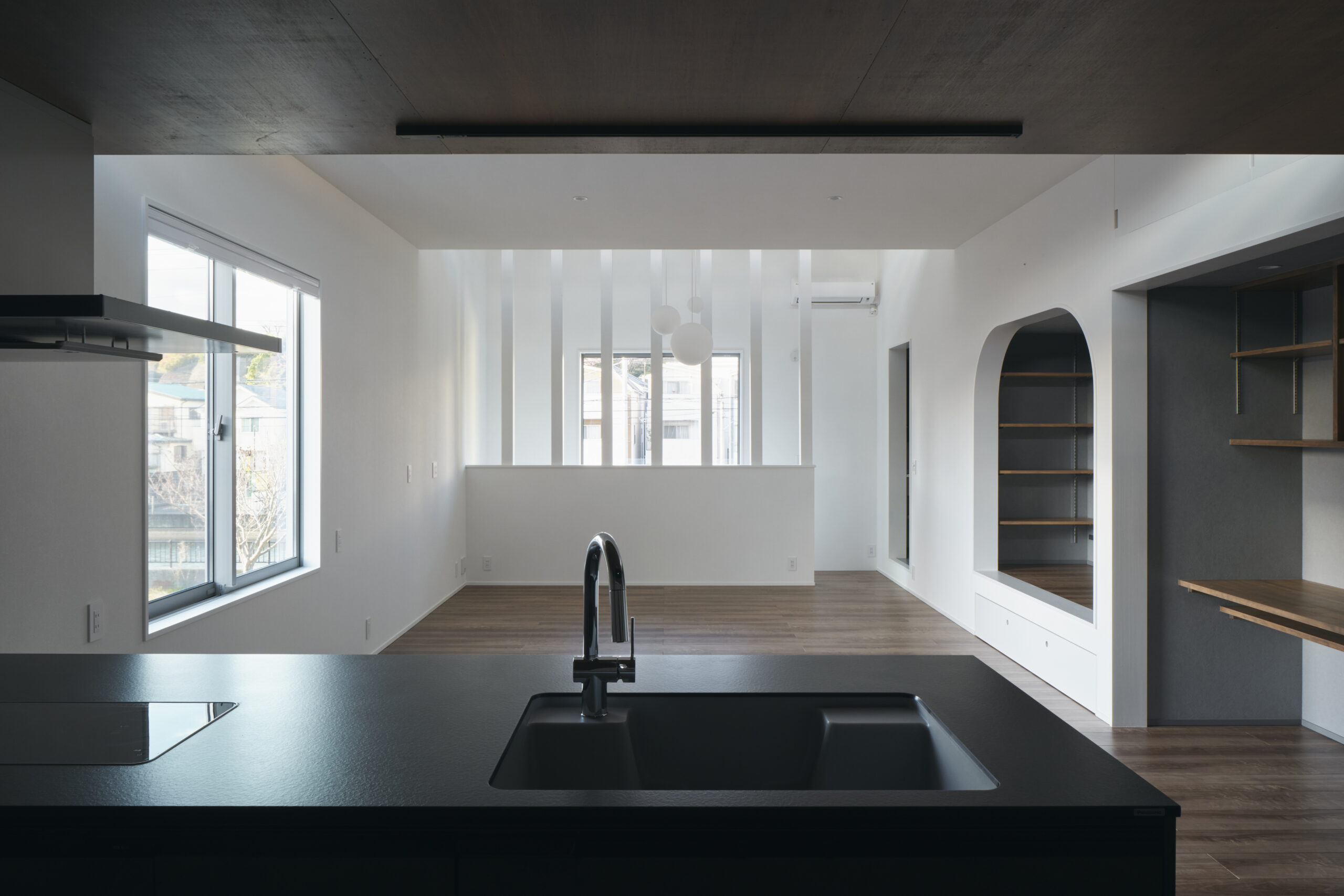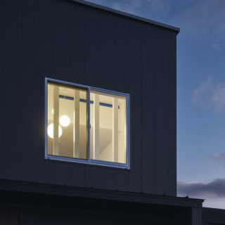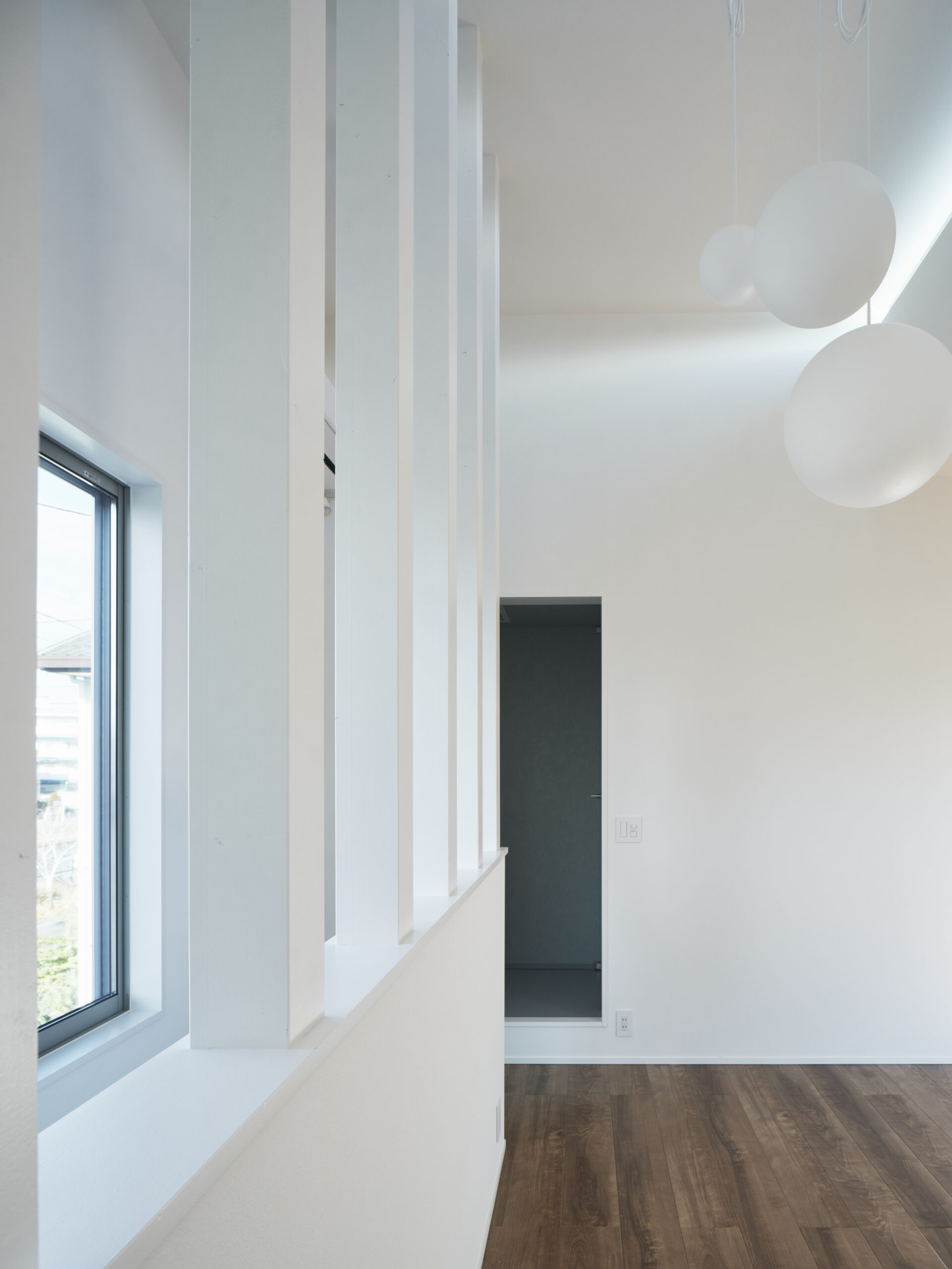 左の窓は通常より低く据えられ、視線の出口が別の角度から外を引き寄せる。