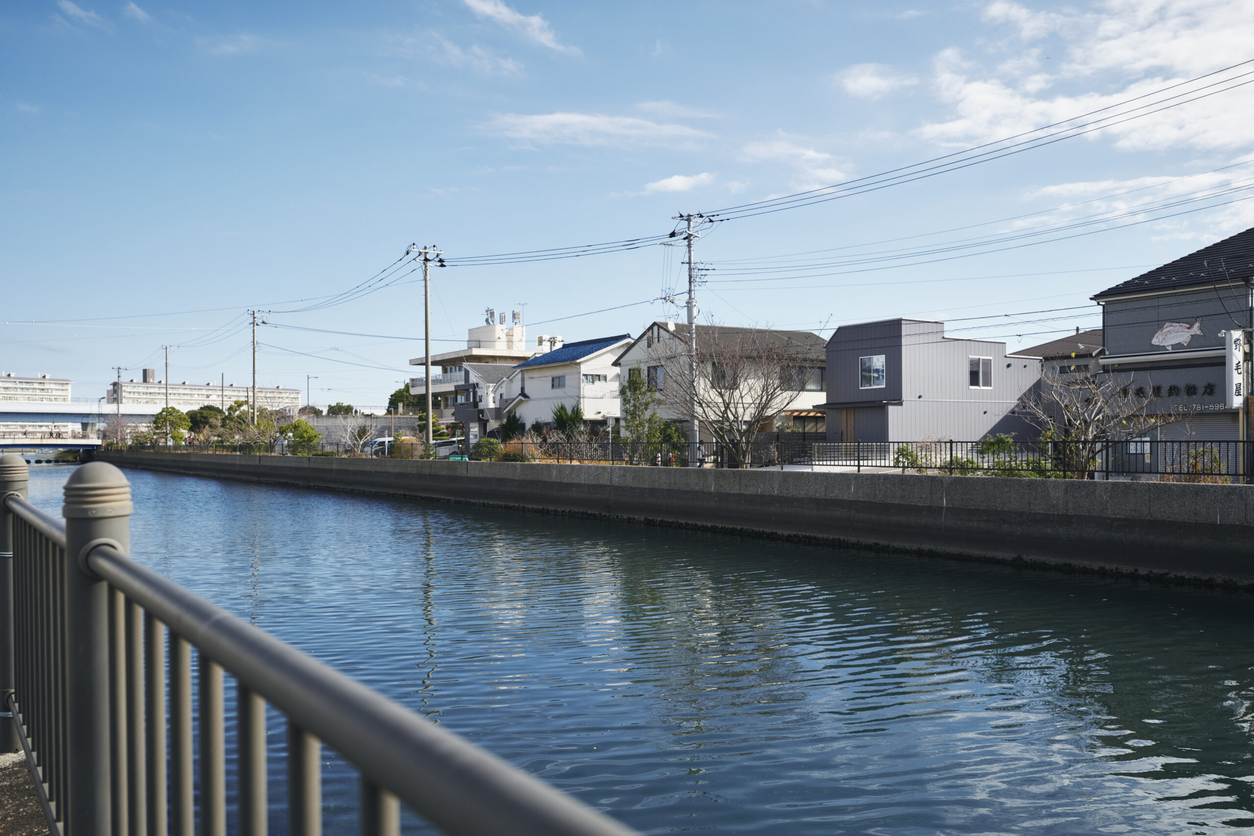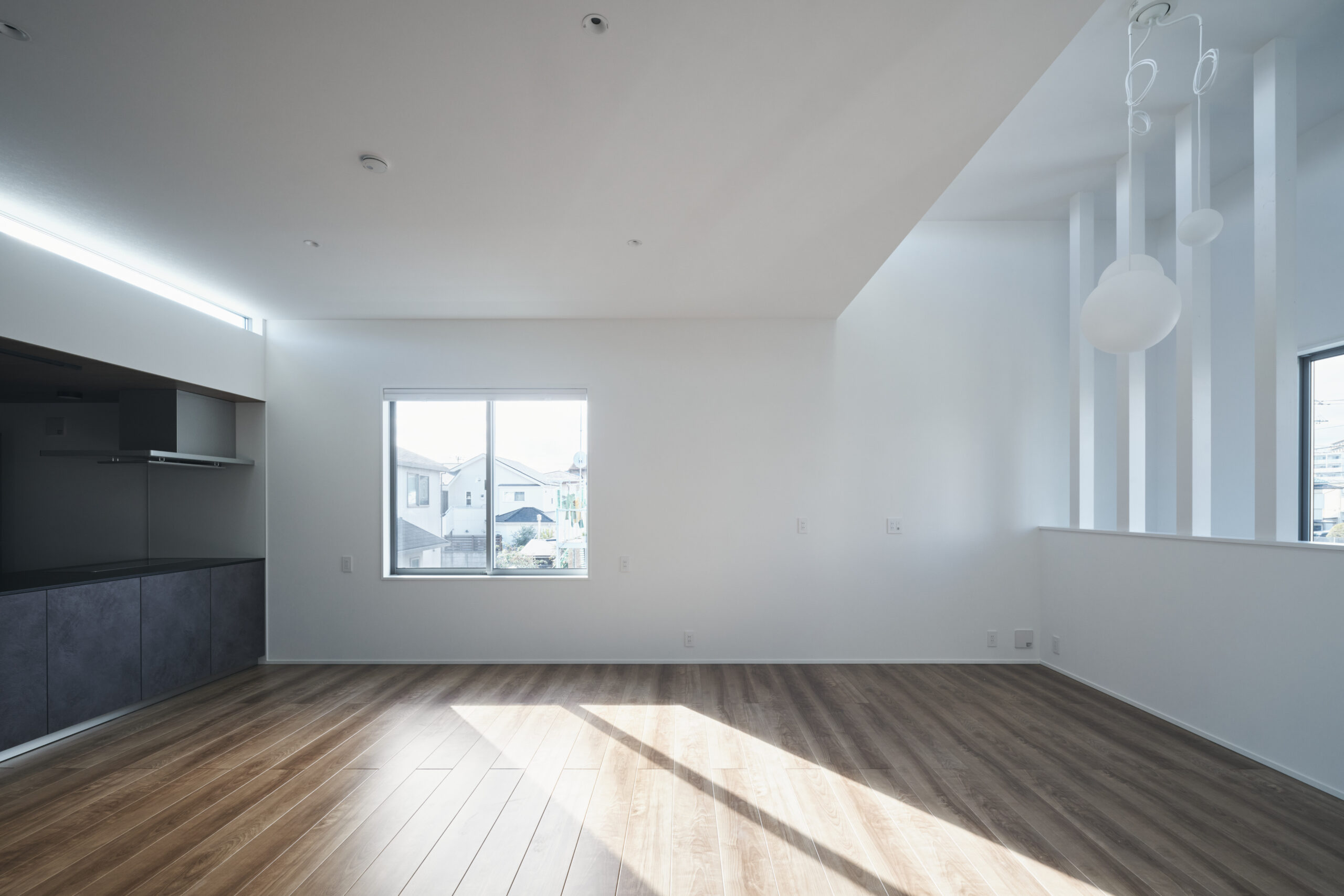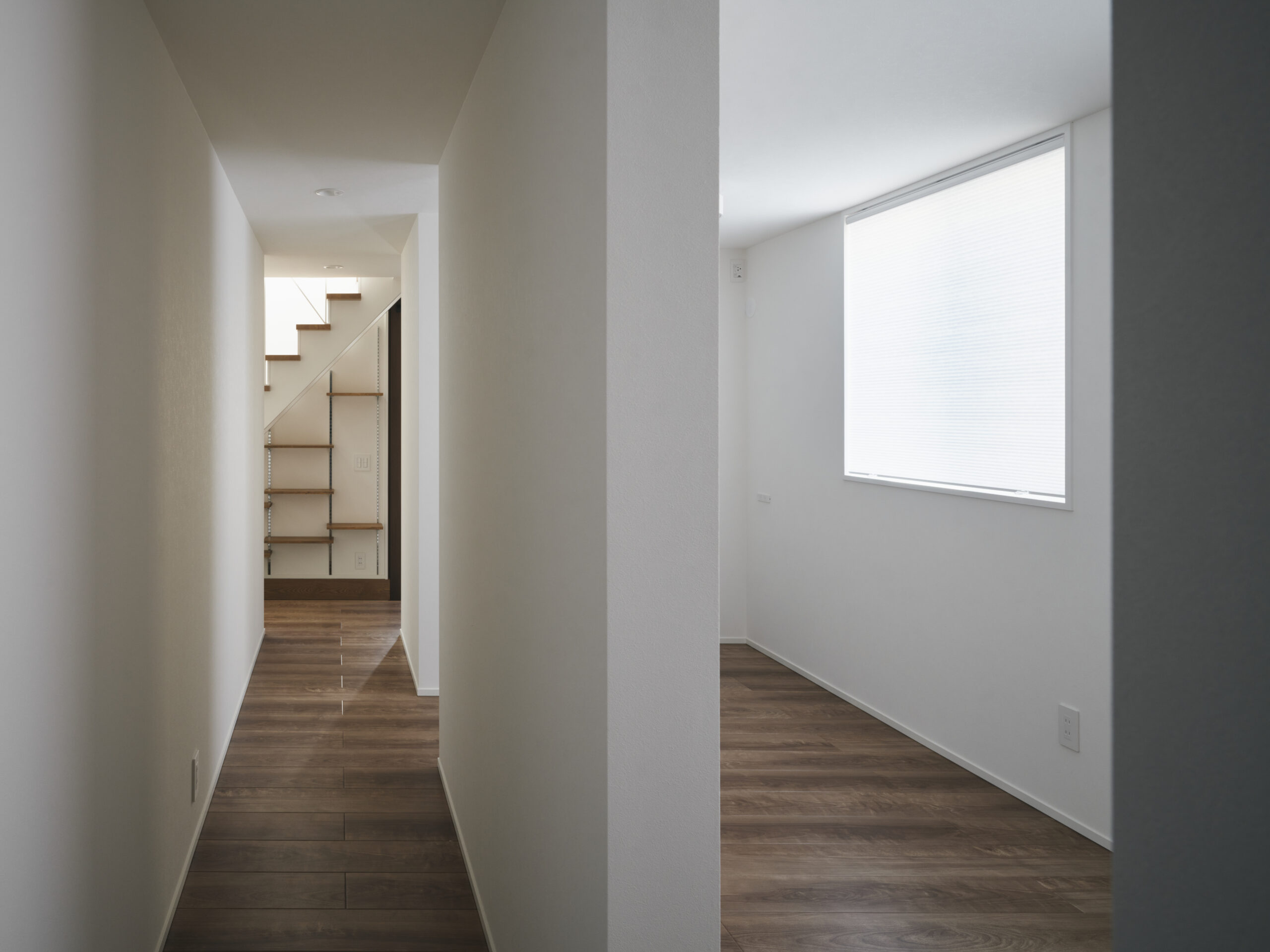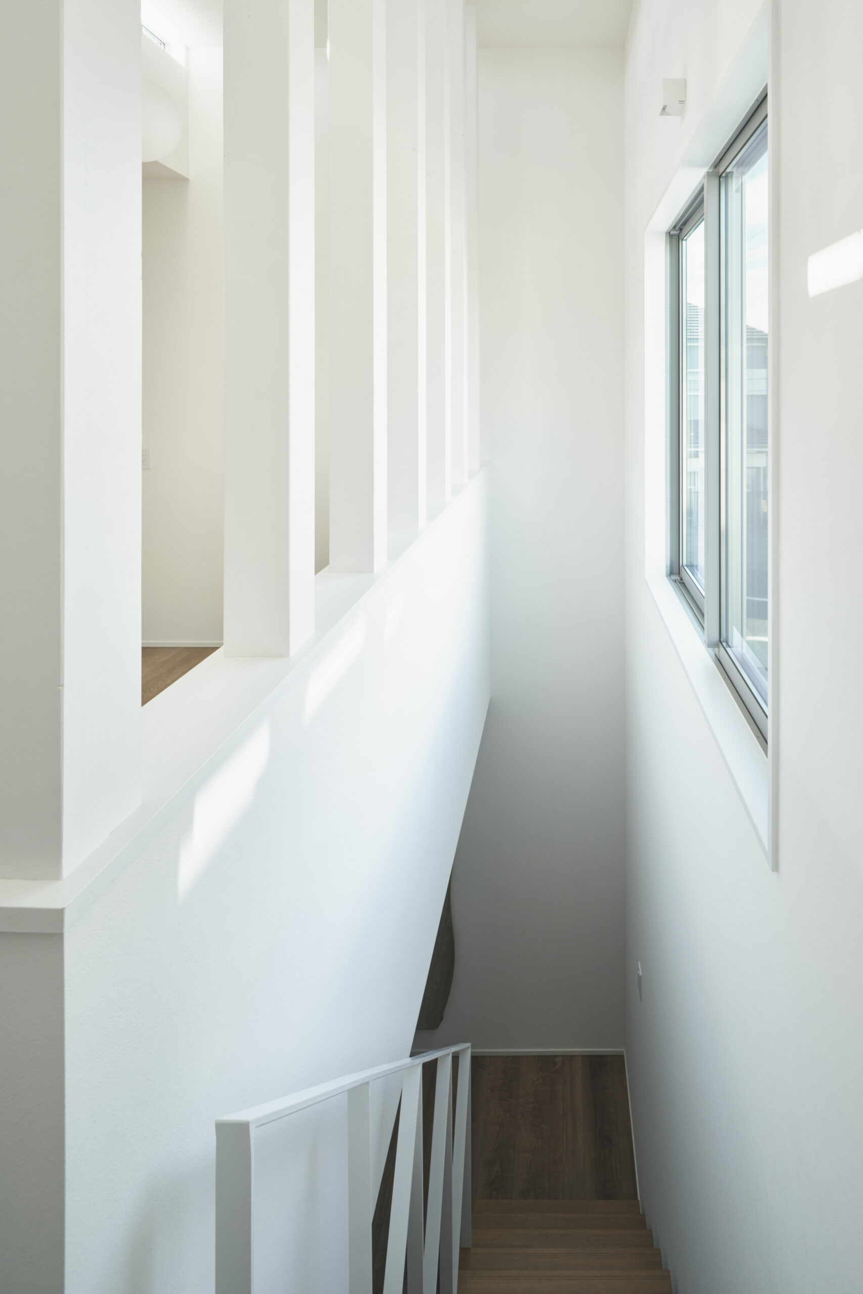 左の窓は通常より低く据えられ、視線の出口が別の角度から外を引き寄せる。