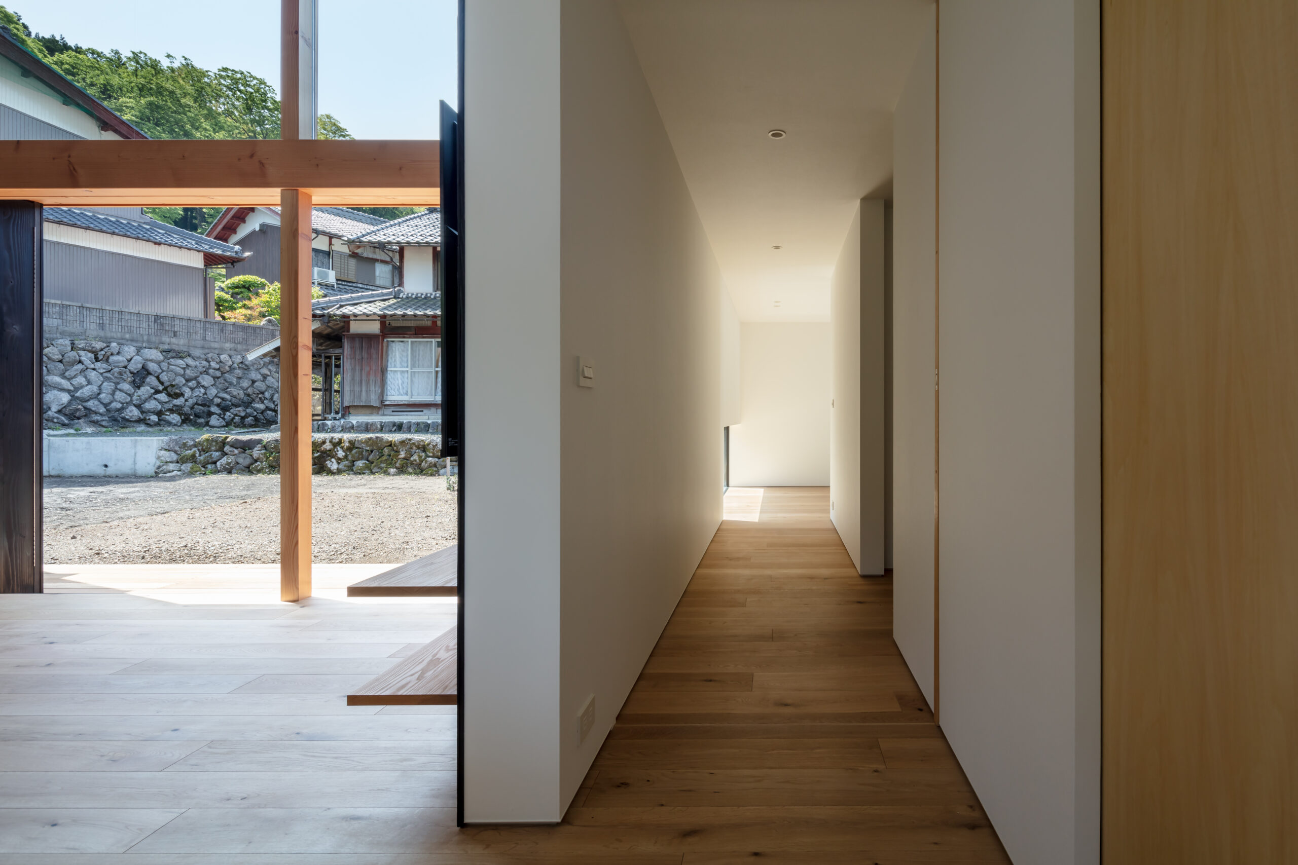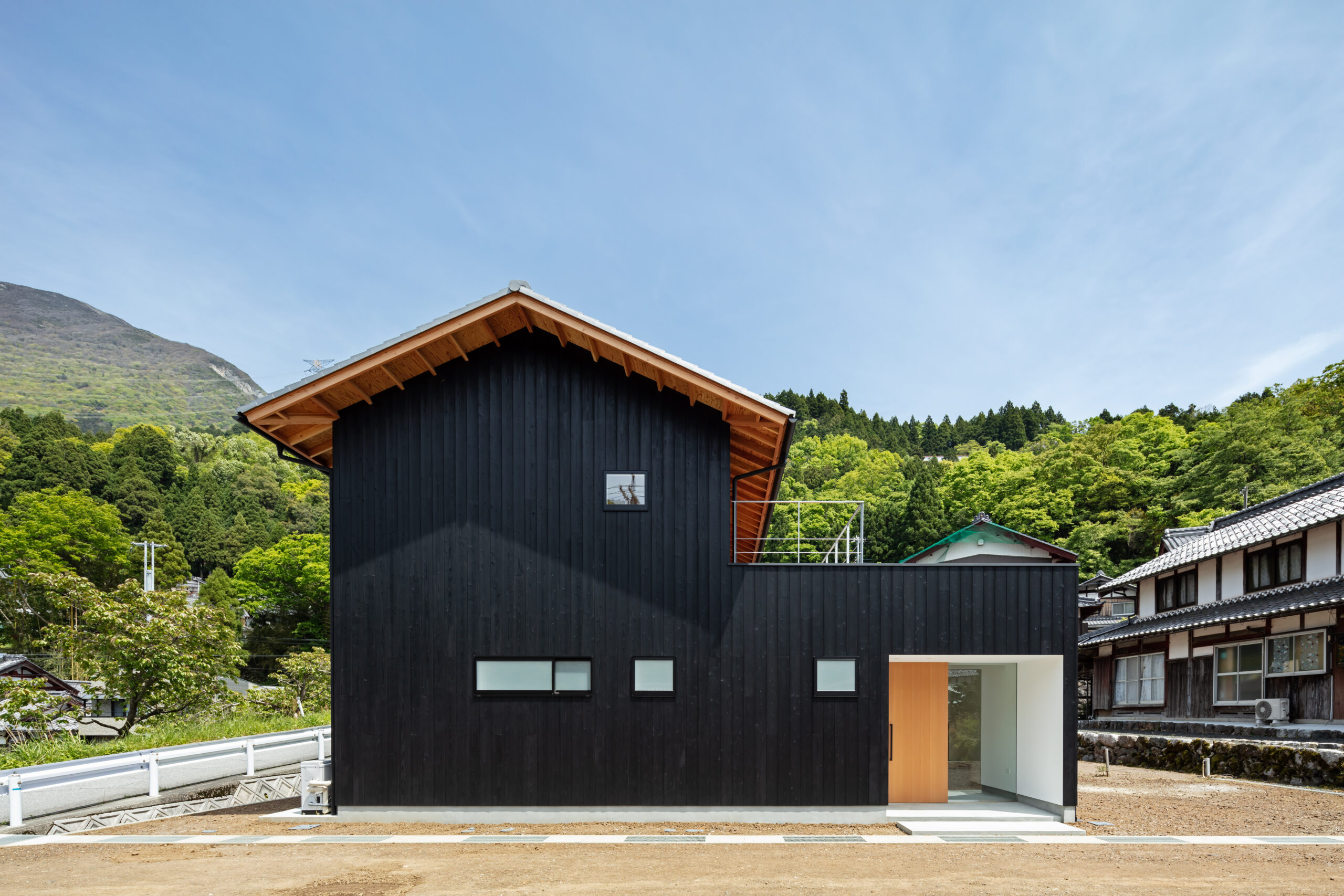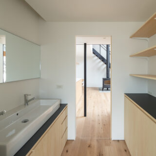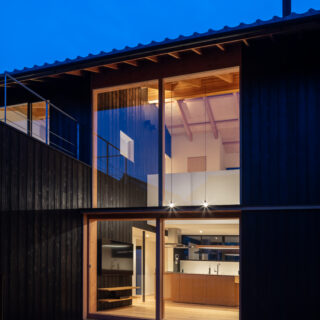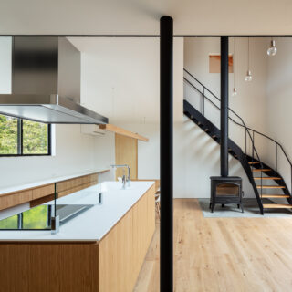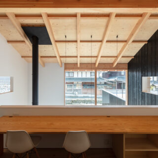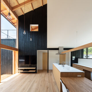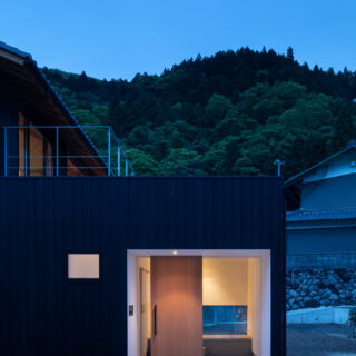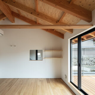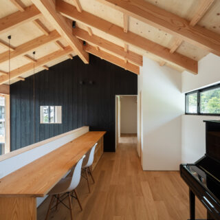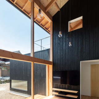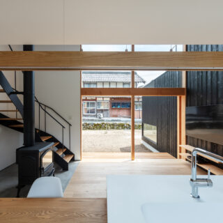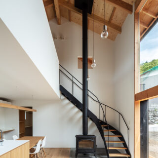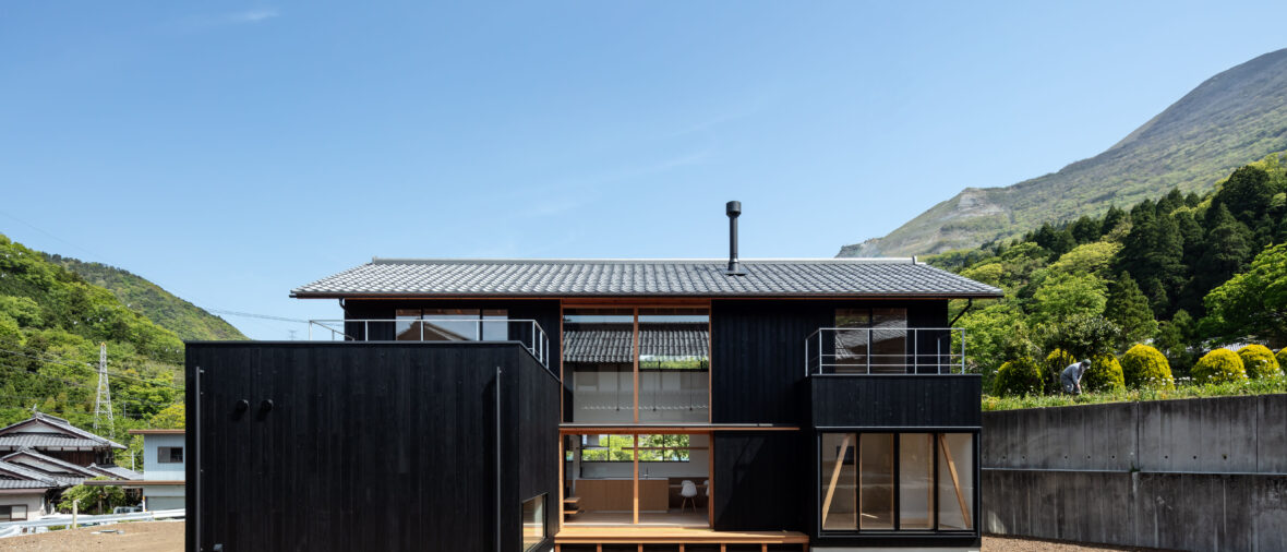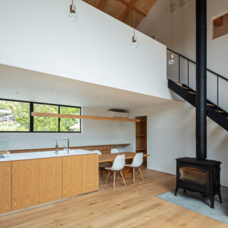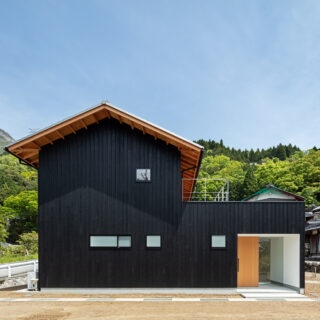 敷地は滋賀県米原市、伊吹山の麓の緑豊かな集落のなかにあり、夏は山から吹き下ろす風が心地よい場所ですが、一方で冬は寒さの厳しい豪雪地域でもあります。敷地は畑だった生家の北側隣地を宅地に転用し、子世帯のための家を建てることになりました。そして、クライアントからは夏には豊かな自然環境を目一杯に享受できる風通しの良い開放的な暮らしと、冬の厳しい寒さから守られた住環境の両立が求められました。