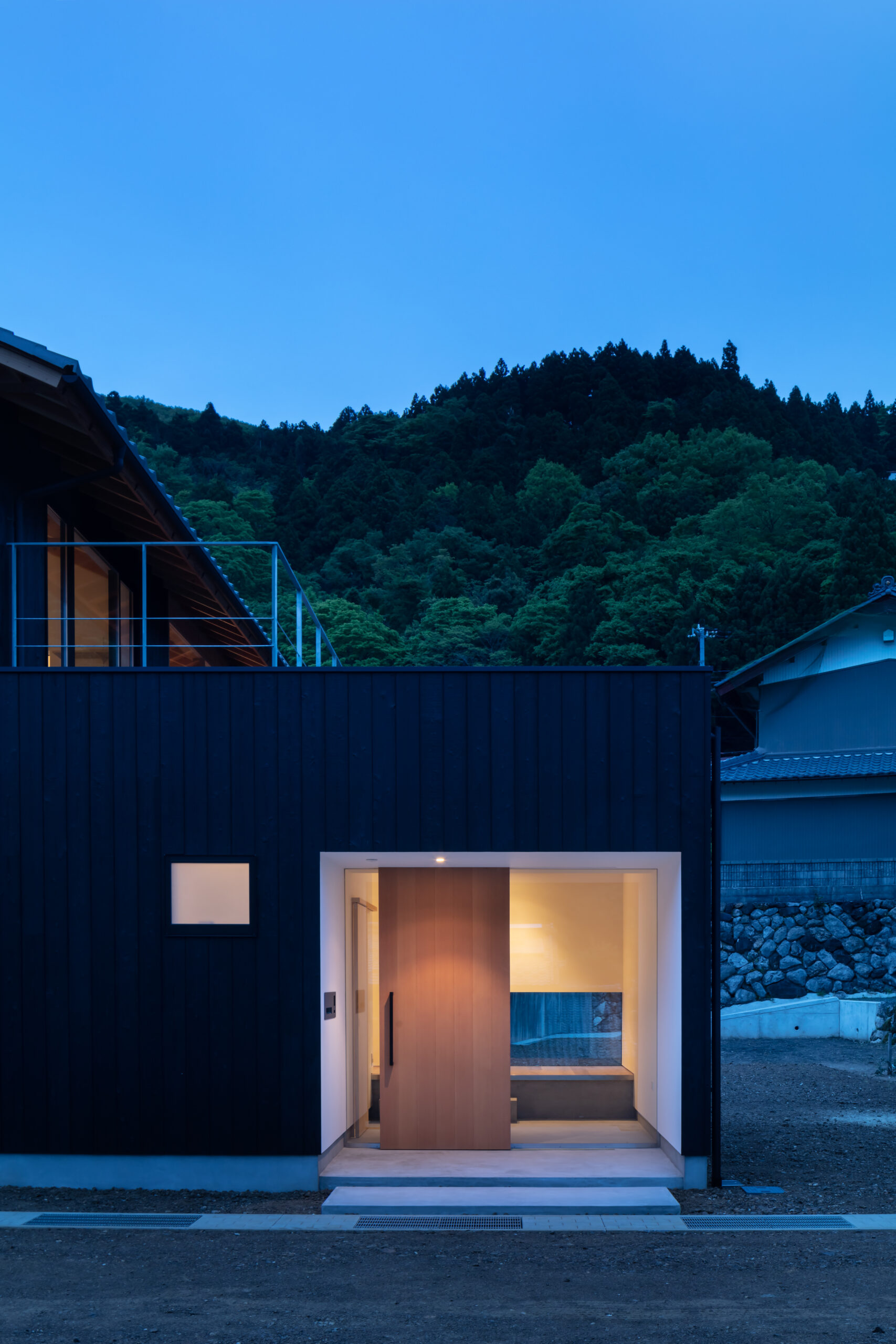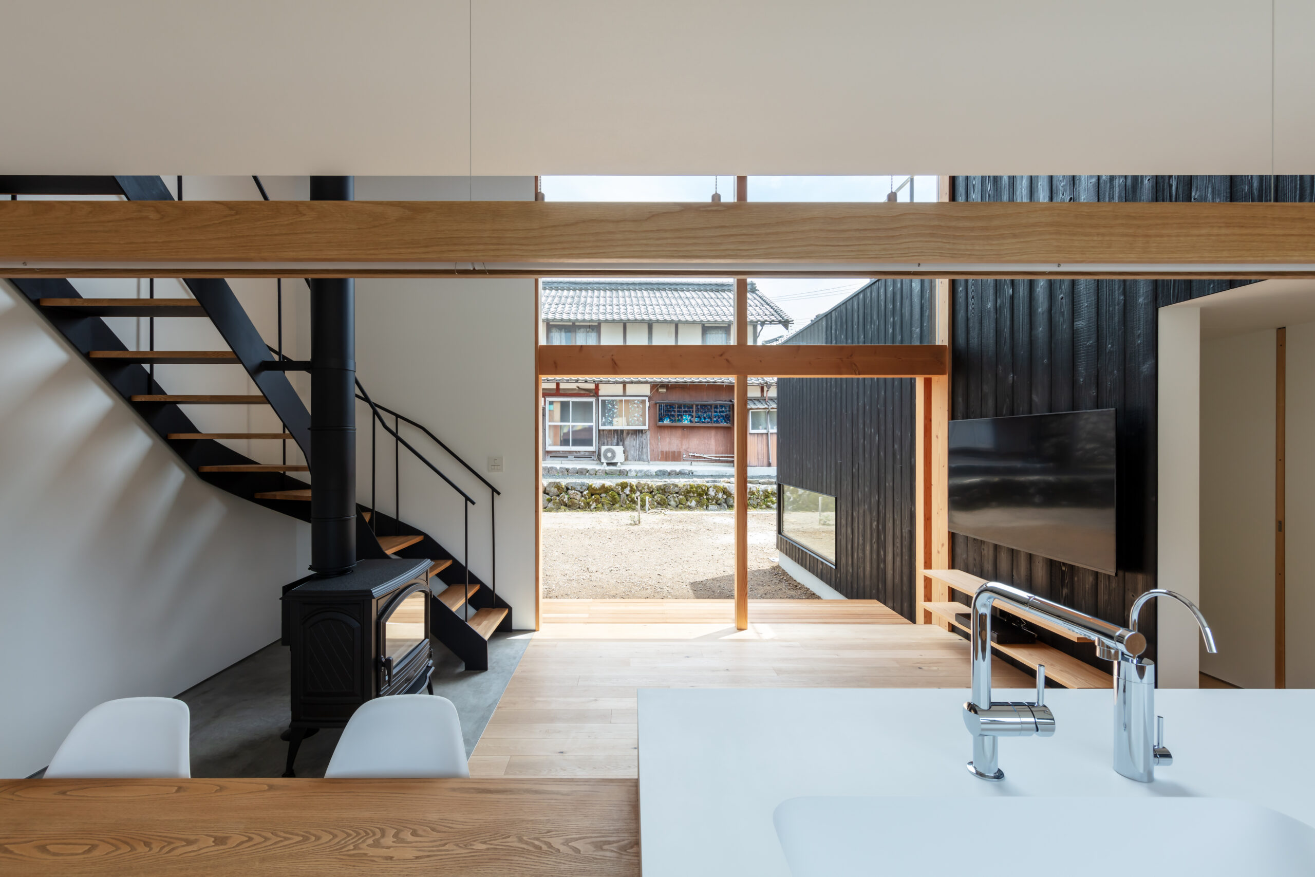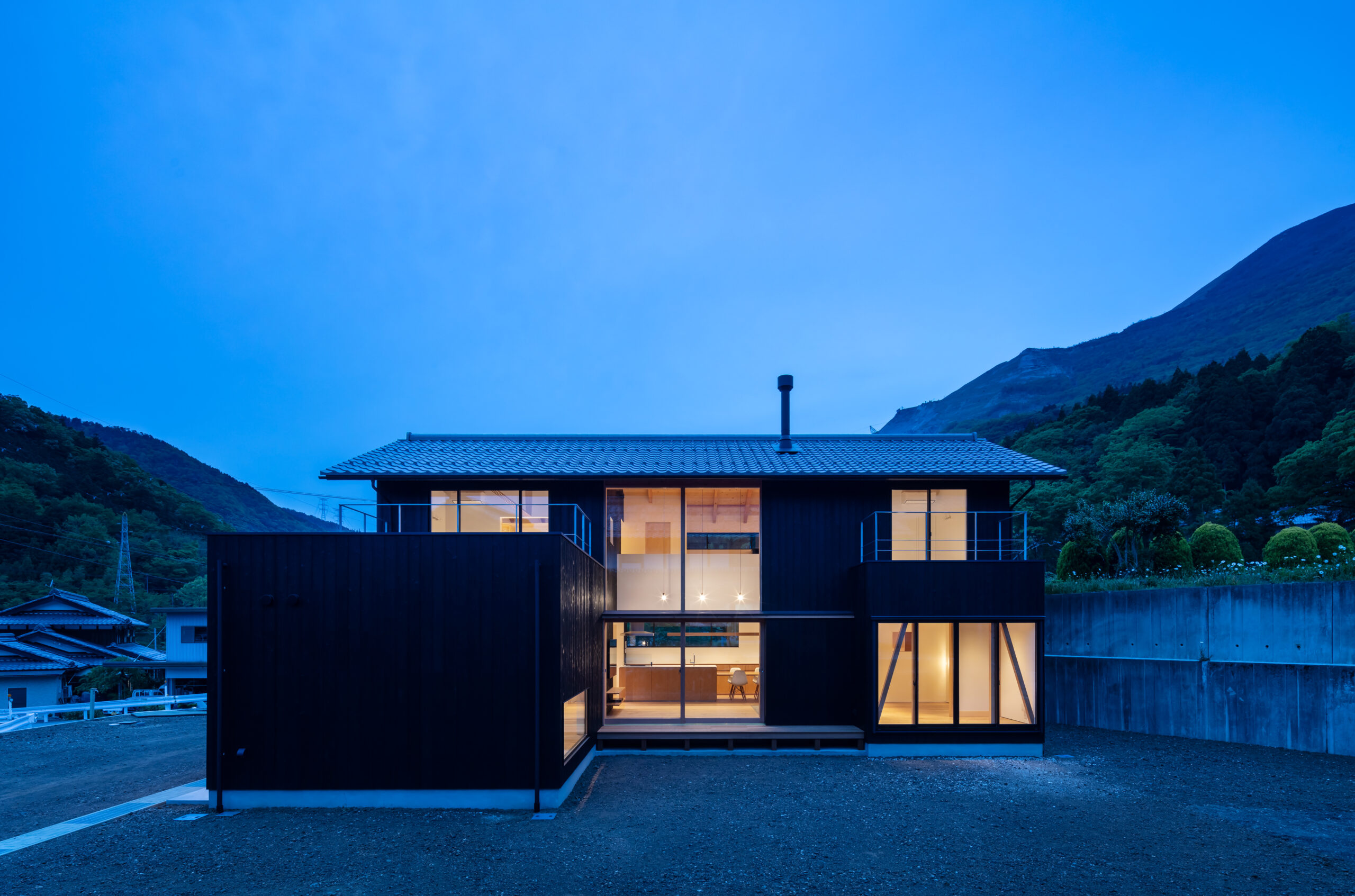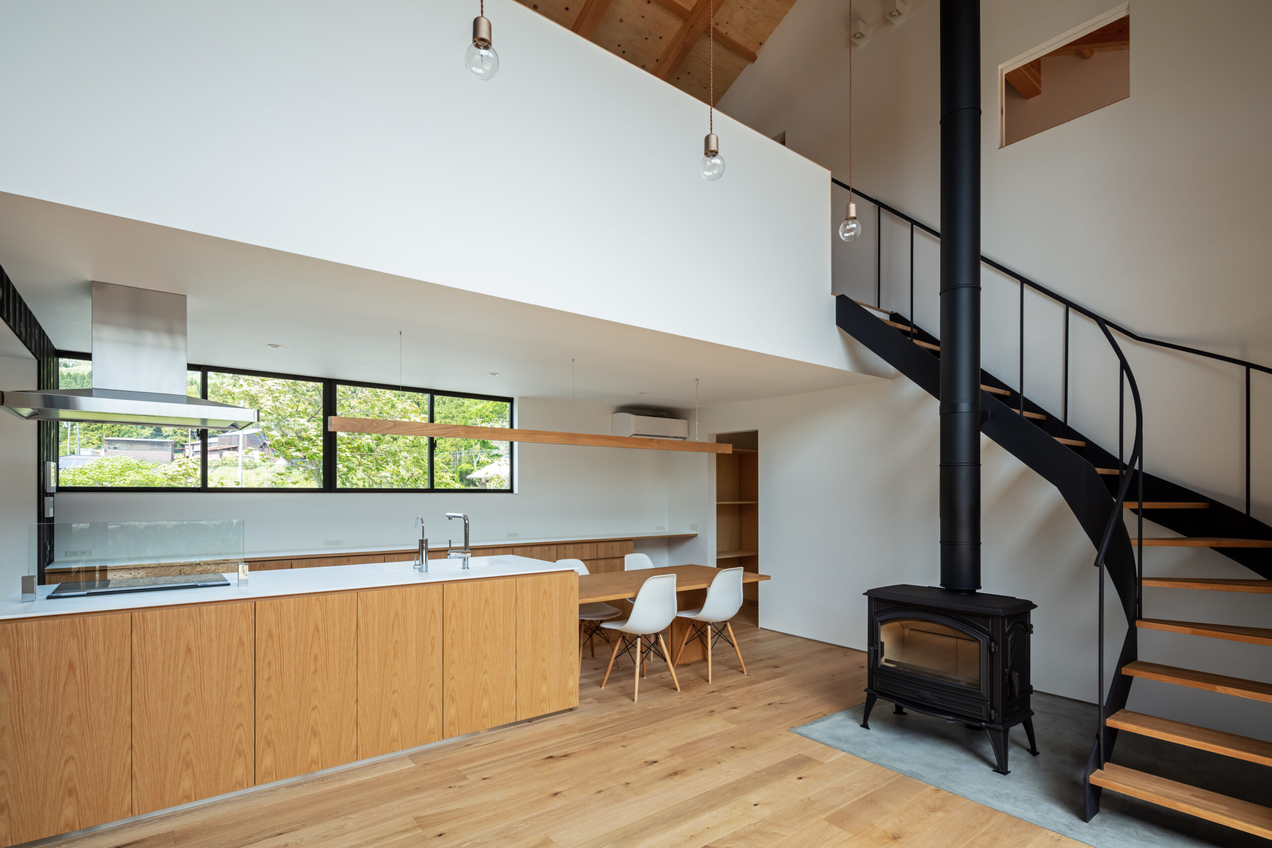 敷地は滋賀県米原市、伊吹山の麓の緑豊かな集落のなかにあり、夏は山から吹き下ろす風が心地よい場所ですが、一方で冬は寒さの厳しい豪雪地域でもあります。敷地は畑だった生家の北側隣地を宅地に転用し、子世帯のための家を建てることになりました。そして、クライアントからは夏には豊かな自然環境を目一杯に享受できる風通しの良い開放的な暮らしと、冬の厳しい寒さから守られた住環境の両立が求められました。