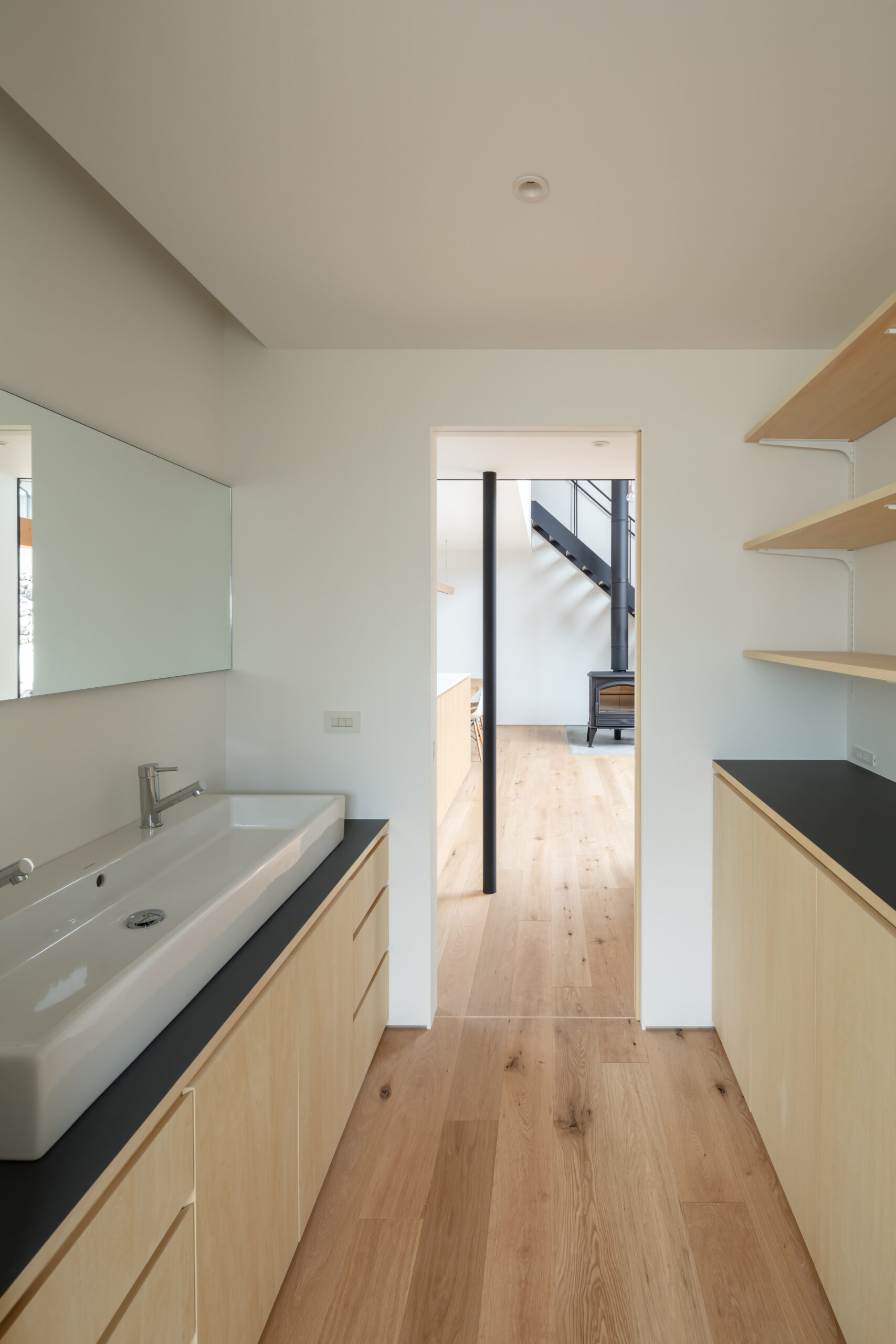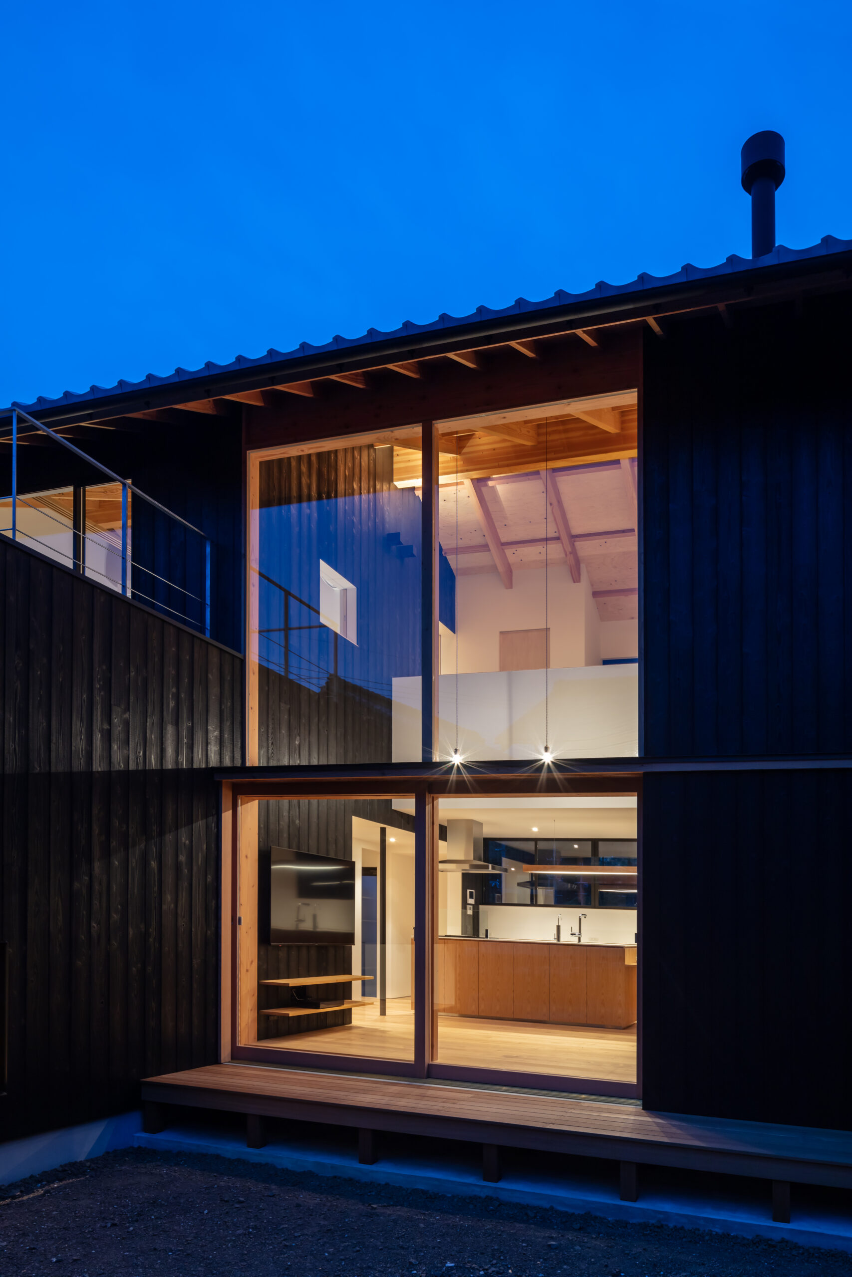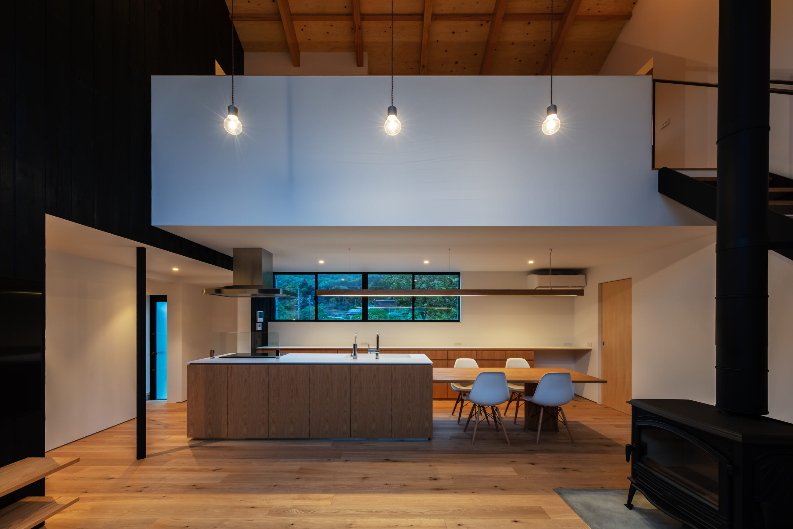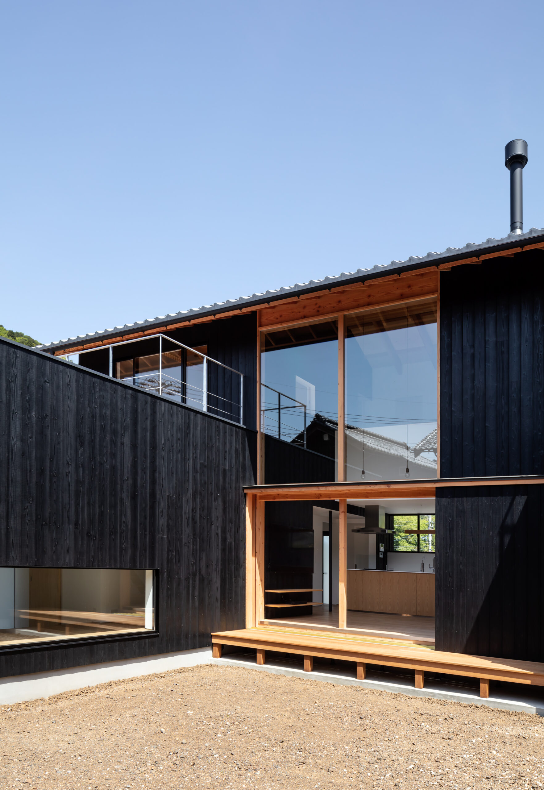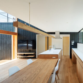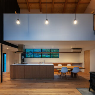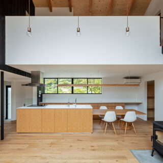 建物配置は東西を軸として敷地の北側に寄せつつ、LDKが中央に位置したL型の建物を南側隣地に建つ母屋とともに中庭を囲むように配置しています。玄関を入ると正面の地窓から中庭とリビングの足元が垣間見え、天井高さを低く抑えた廊下を抜けると吹抜け空間のLDKへと連なります。南側に開いた大開口の吹抜が中庭とリビング、そして2階のファミリールームや子供室へと連続して繋いでいます。この吹抜のリビングを中心に家族がどこにいても互いに気配を感じることができるよう計画しました。積極的に外部空間を取り入れ、豊かな自然環境とともに四季の移ろいを感じながら暮らすことができる、そんな住まいを目指しました。