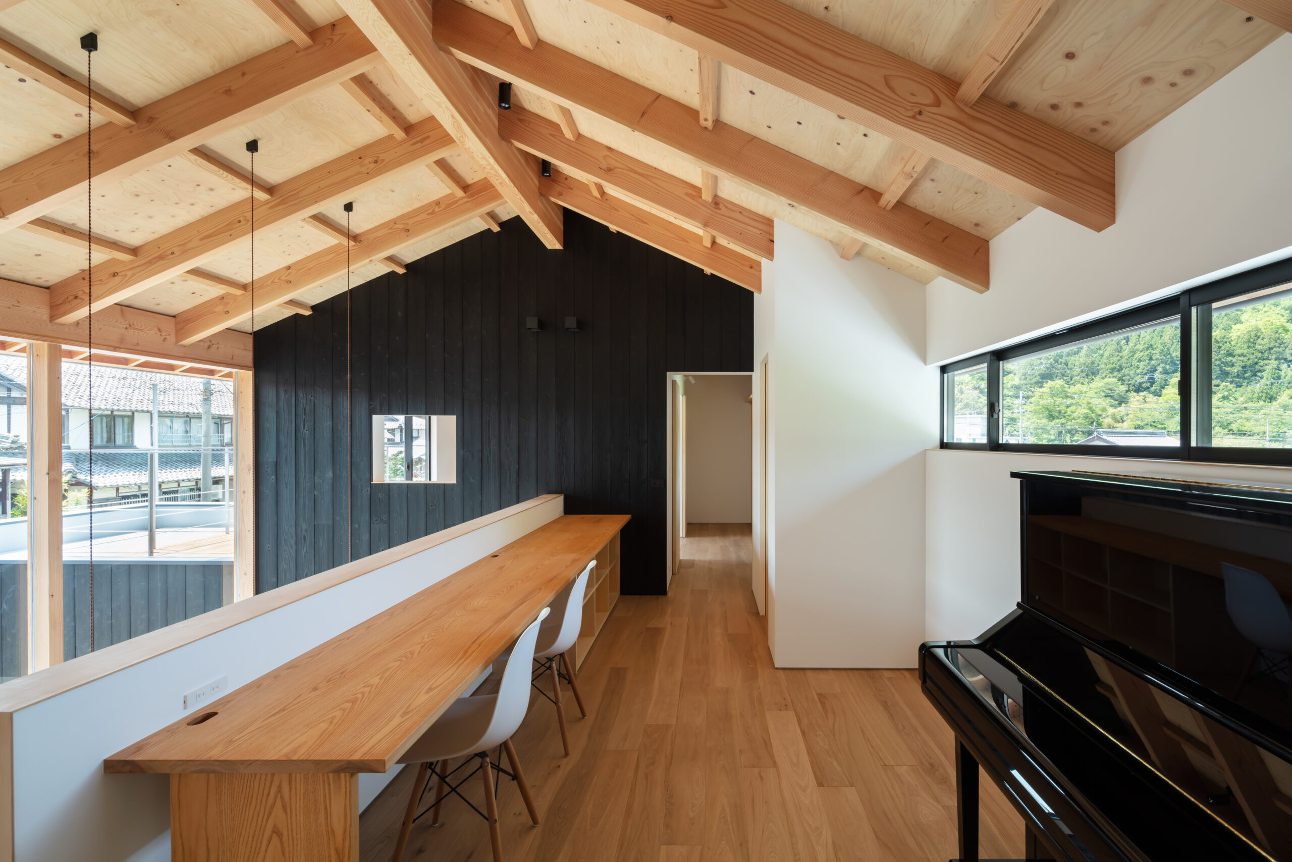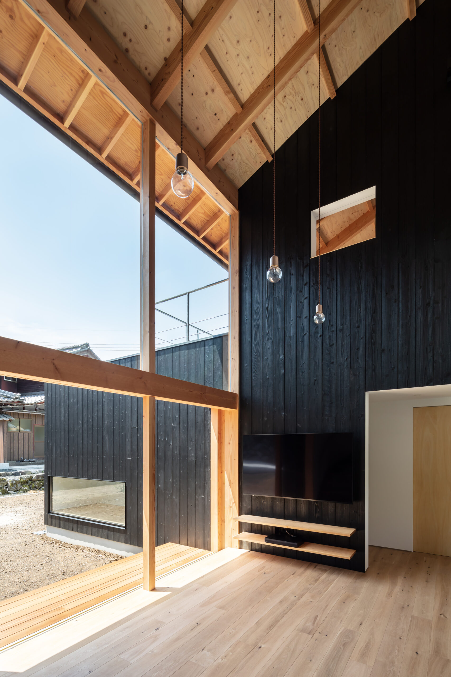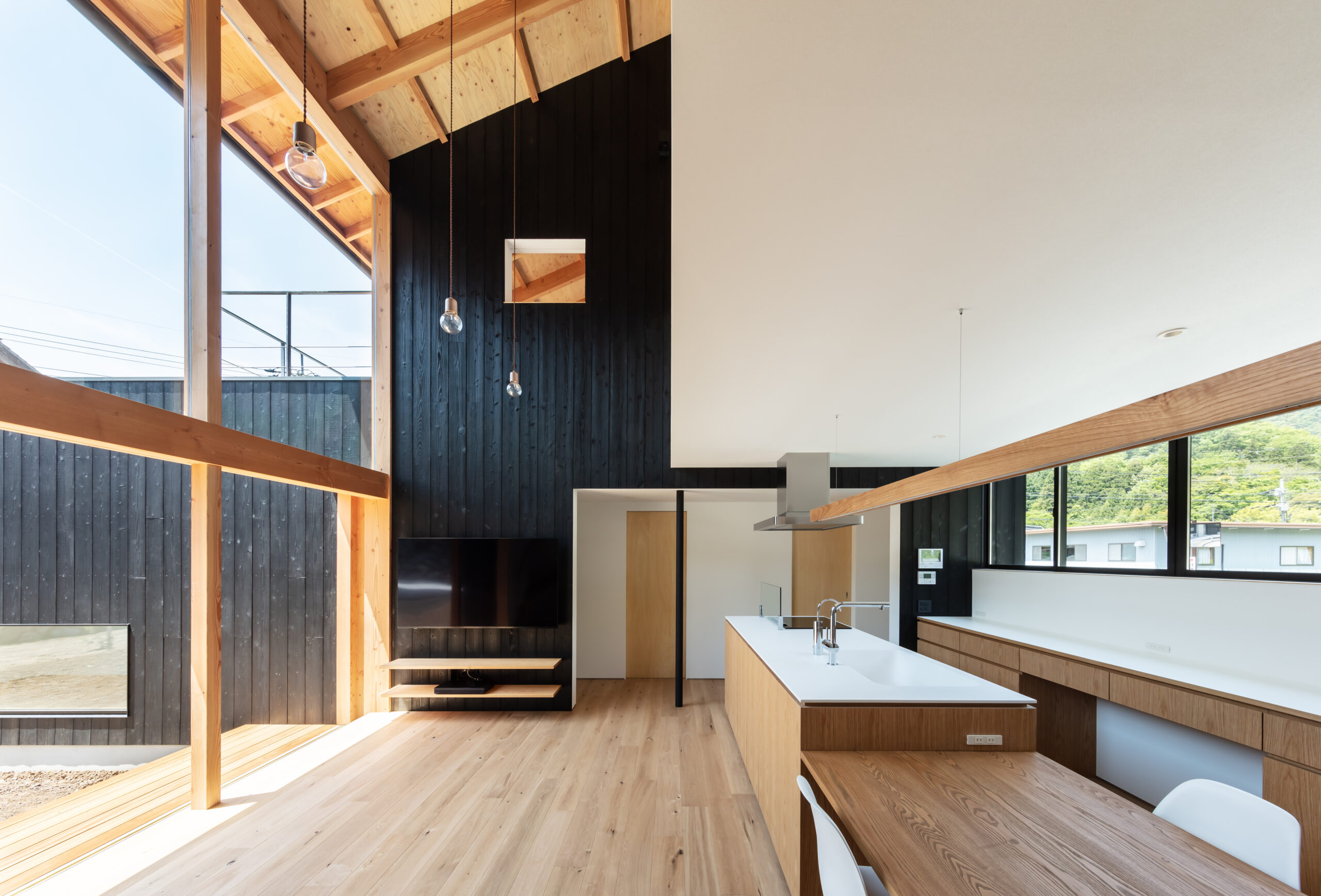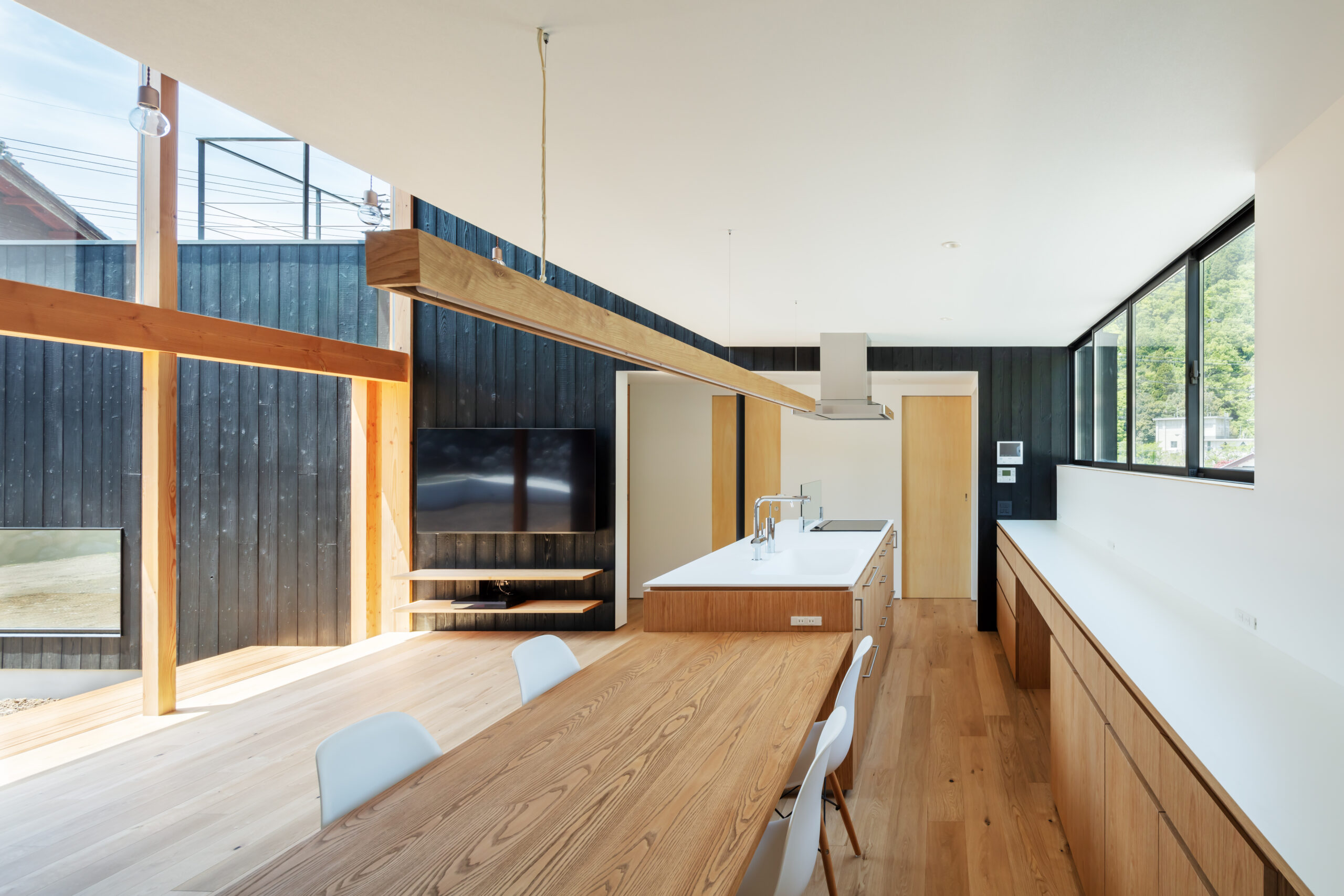 そこで、夏は伊吹山から吹き下ろす風を利用し外気を効率的に取り入れることができるよう、風上にあたる北側は開口部を小さくとり風下の南側は大きく開くよう計画しました。これにより冬の寒さ溜まりとなりやすい北側に対して開口面積を減らすことにもなり、そして南側の大開口からたっぷりと暖かな陽射しを取り込むことができます。
