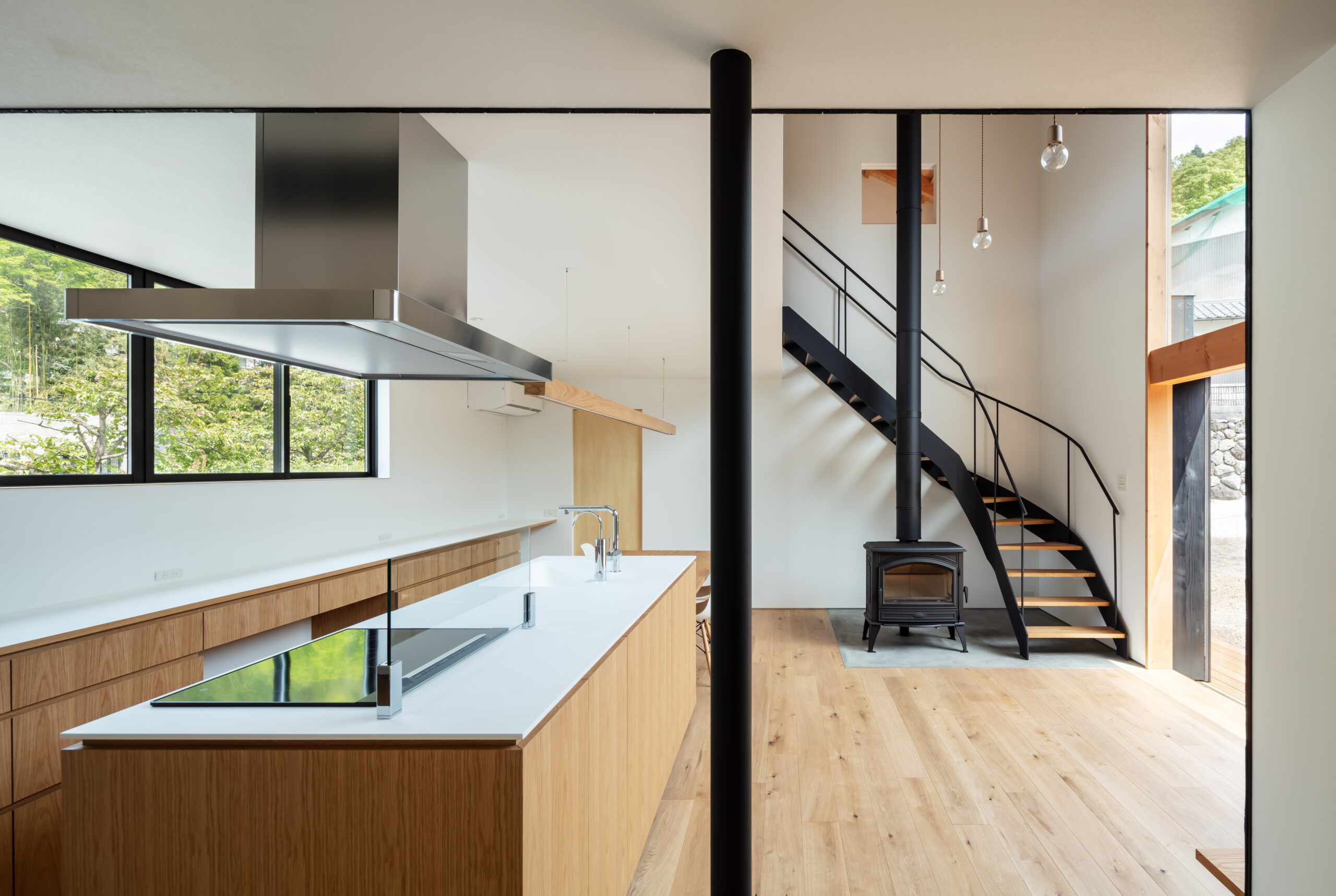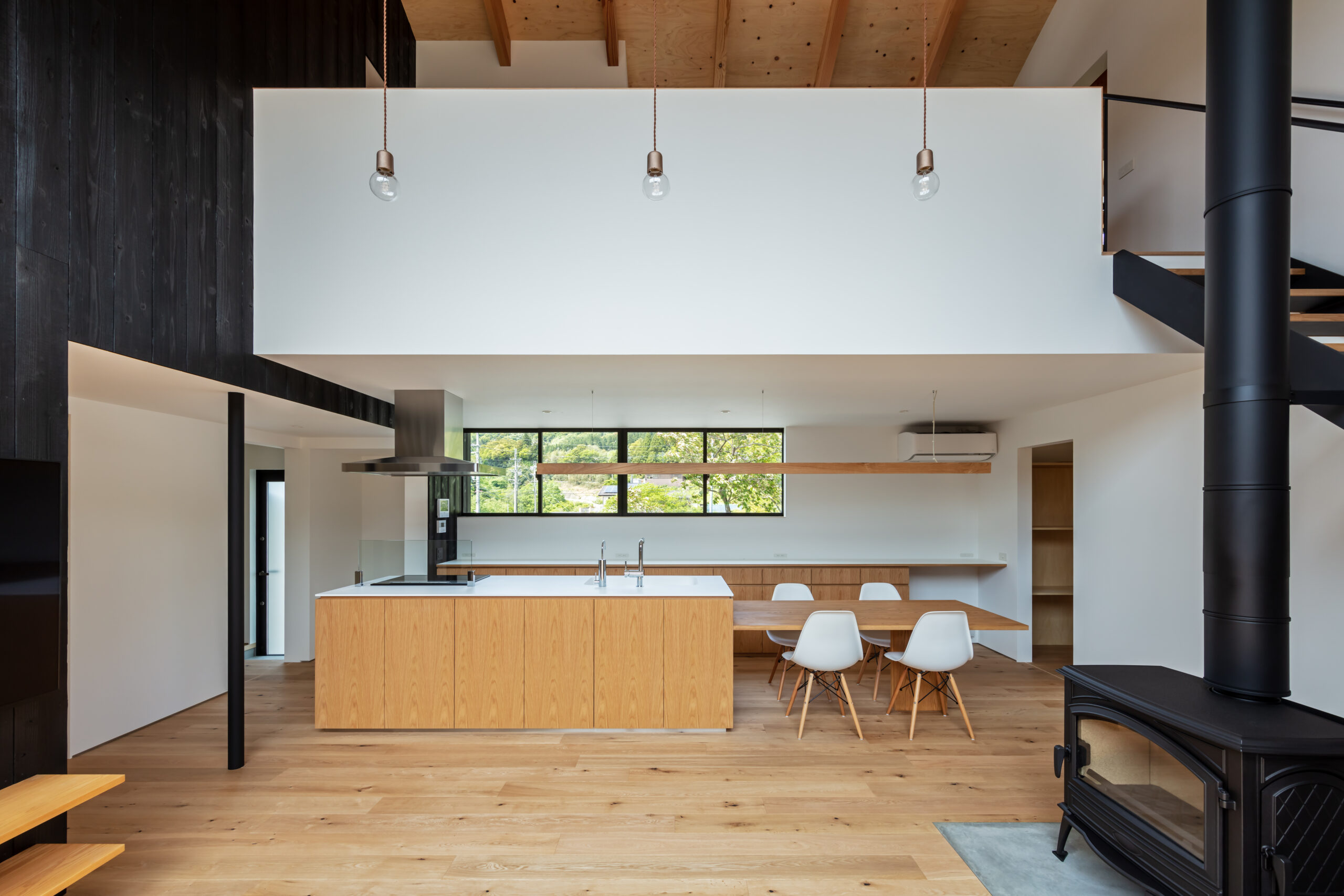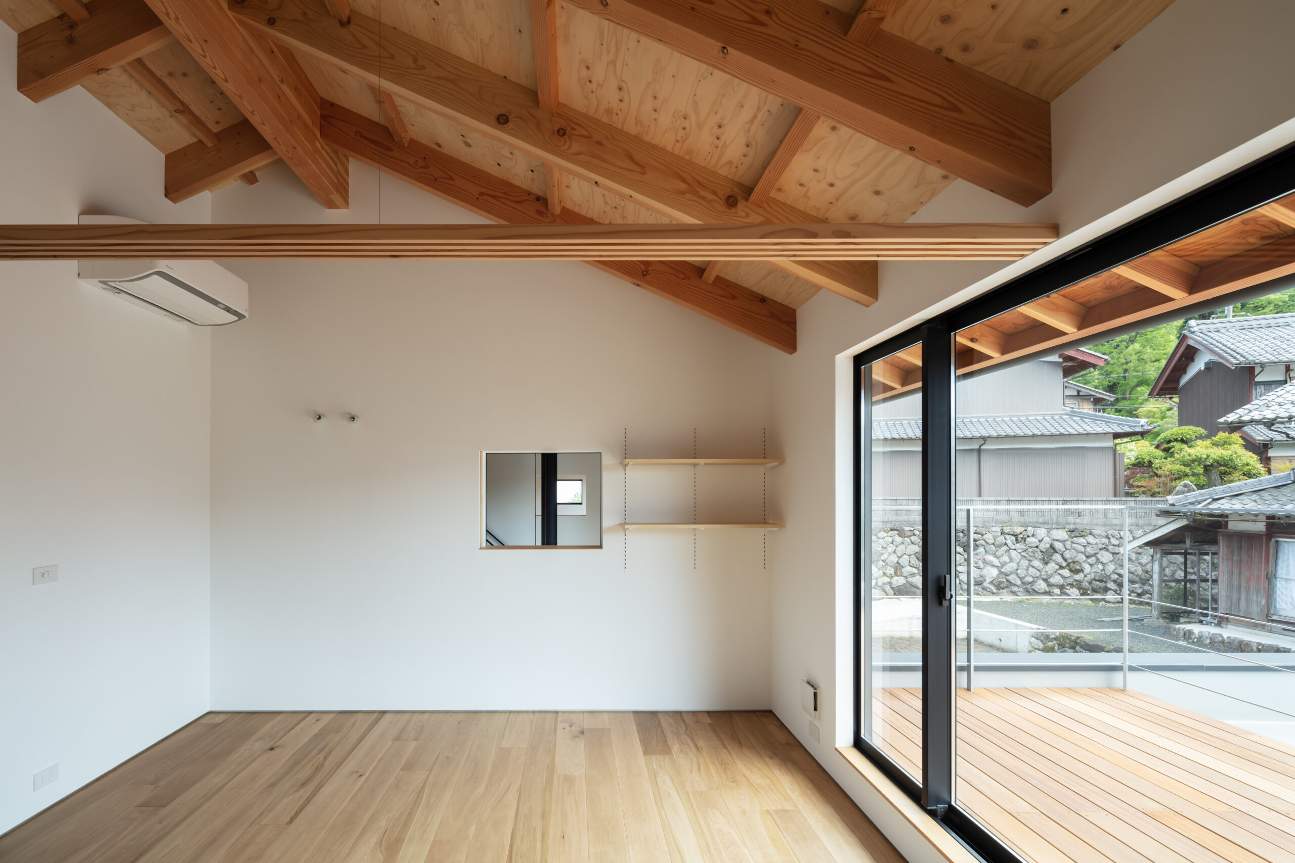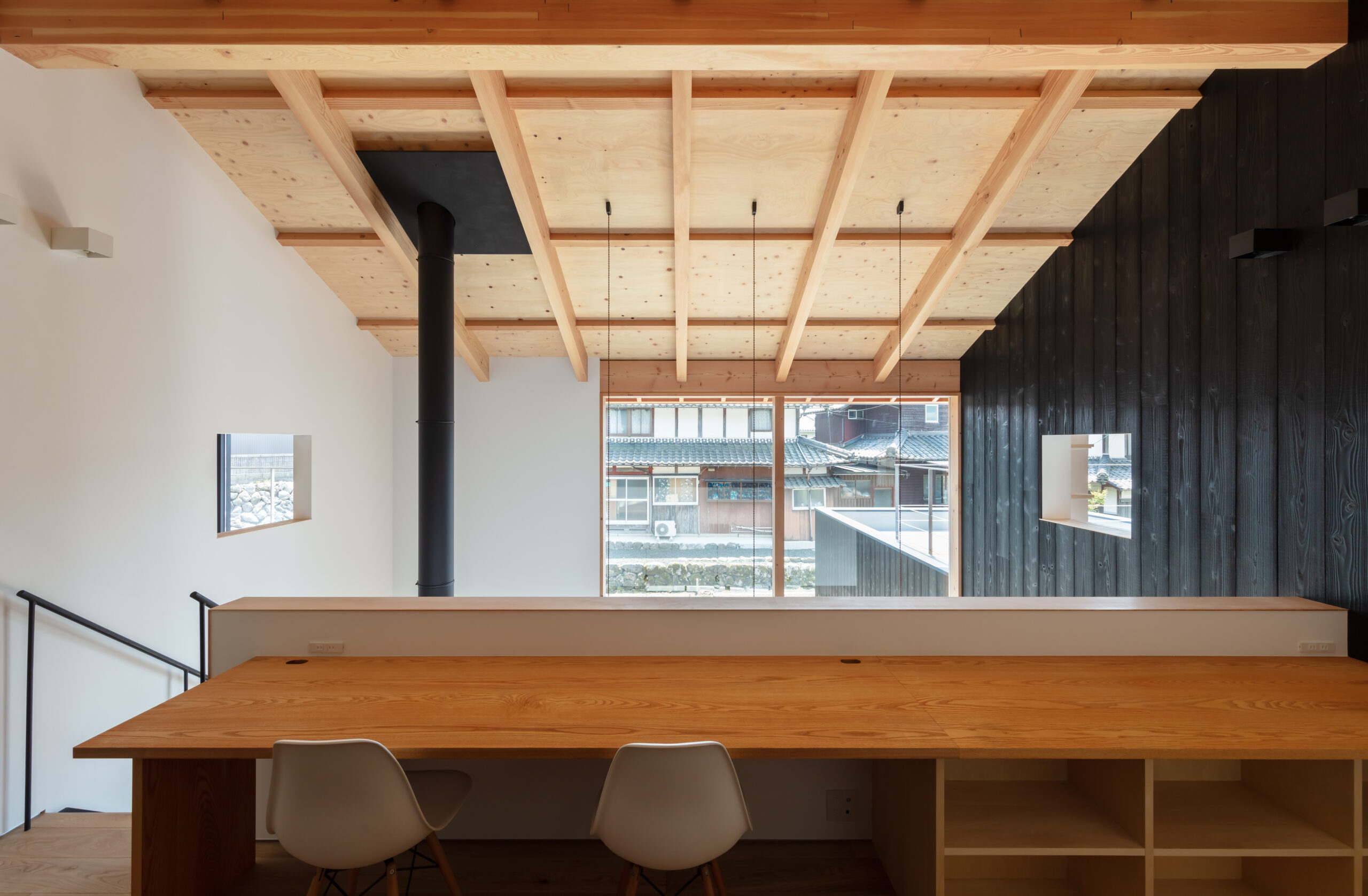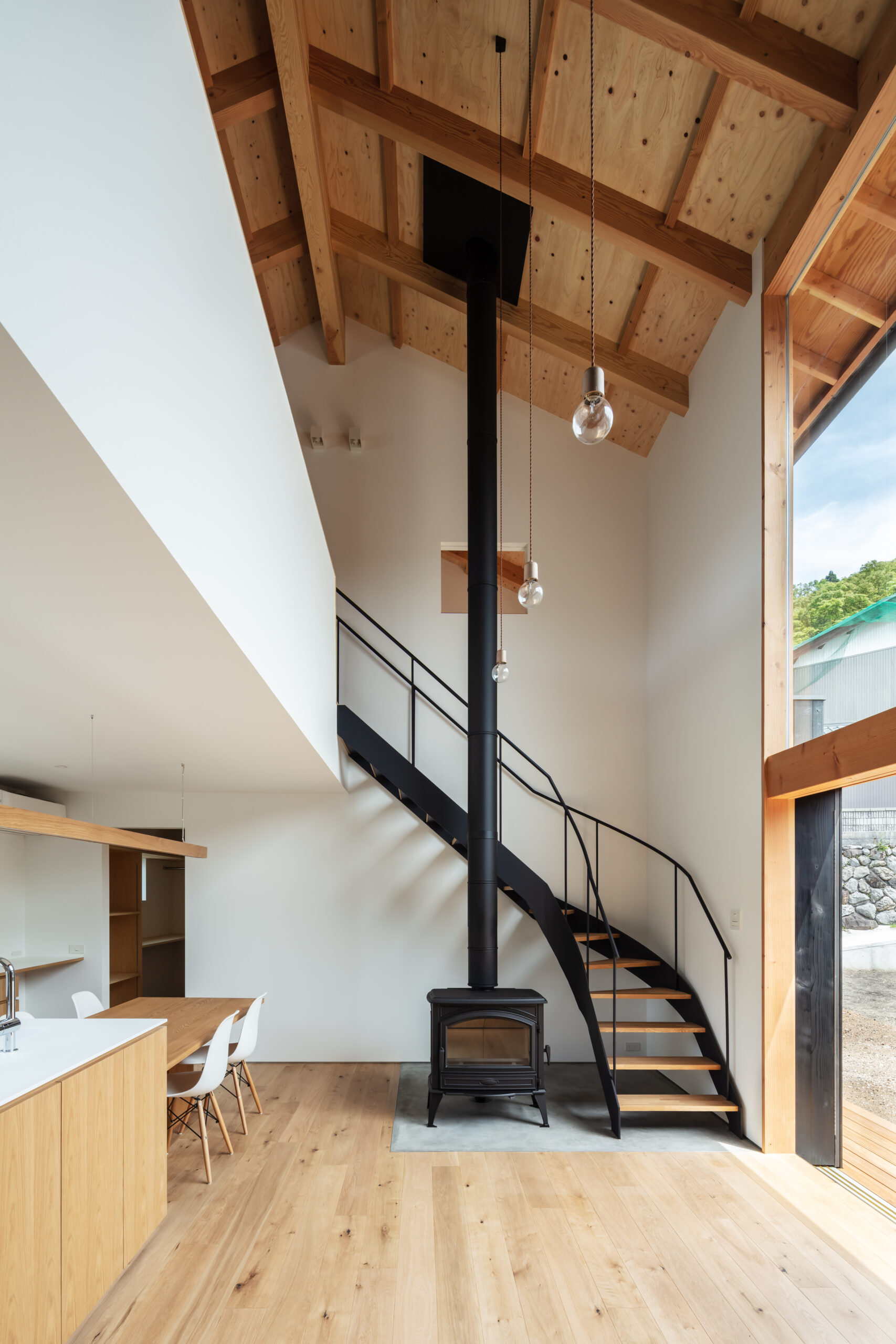 そこで、夏は伊吹山から吹き下ろす風を利用し外気を効率的に取り入れることができるよう、風上にあたる北側は開口部を小さくとり風下の南側は大きく開くよう計画しました。これにより冬の寒さ溜まりとなりやすい北側に対して開口面積を減らすことにもなり、そして南側の大開口からたっぷりと暖かな陽射しを取り込むことができます。