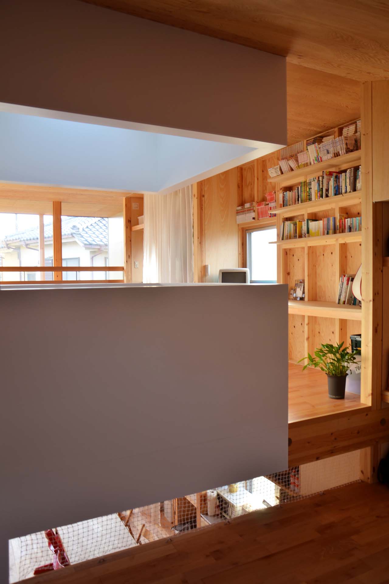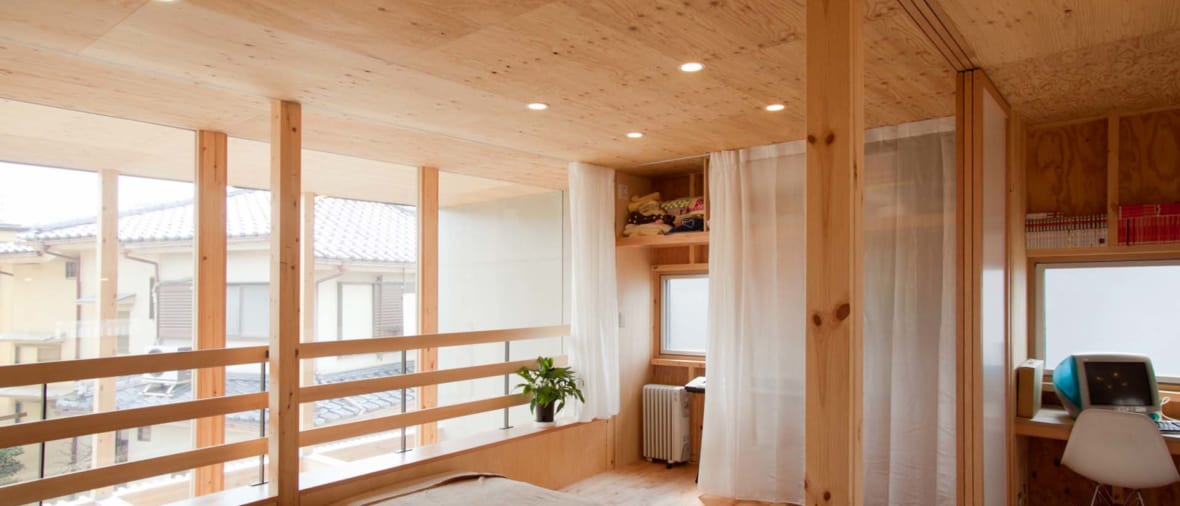 長辺方向は東西の壁面を閉鎖的にして、短辺方向は両端で60cmという最低限の耐力小壁を連続させることで開放的にしている。この小壁で生じる「フトコロ」部分は、カーテンで閉じたり開いたりしながら、収納になったり作業台や机になったり、はたまた部屋の一部になったりと、様々にその役割を変えることができる。全体は中央に階段と吹抜を配置して回遊動線を確保し、斜線制限に合わせて2階北側の床を下げることで、家全体がつながるような構成になっている。階段や吹抜からも様々に顔を出せるような開口を設けた。南側には玄関を兼ねた大きな土間をテラスと一体的につくり、木ルーバーで囲うことで内部に引き込んでいる。大開口の窓を開けることで内外を一体化し、ペットたちとも交流できる場所となっている。