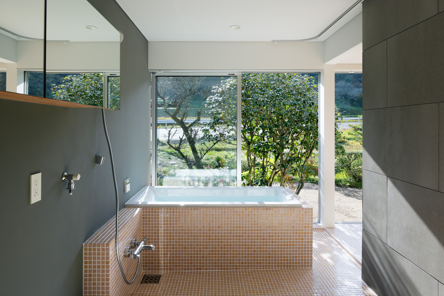バリアフリーにも配慮したバスルーム。庭の景色を見ながらの入浴は、露天風呂気分を味わえる