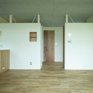 LDKから玄関や水回りの方向を見る。壁面の上部を空け天井を繋げたことに加え、中央の通路を出て右にある玄関とLDKの間に仕切りを設けず、より広い体感が得られる空間を実現した。壁の上部に見られる鉄骨はこの家が建った40年前からのもの