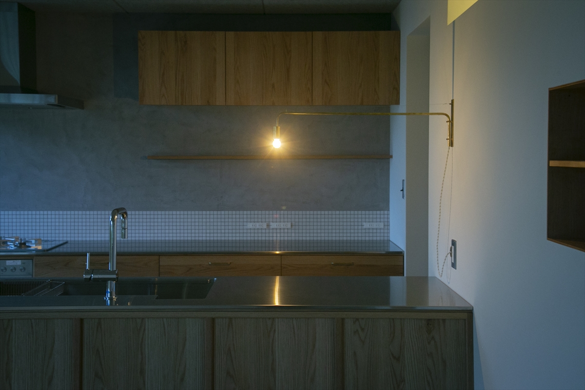 キッチン。画像右、壁面に取り付けたこの家のアイコン、真鍮のライトがある。インテリアの要として、取り付ける高さにもこだわった。40年前の鉄骨や、工業用品を用いた無骨な天井、手仕事を感じるキッチンの壁面など、新しいものと古いものが融合して唯一無二の空間となっている