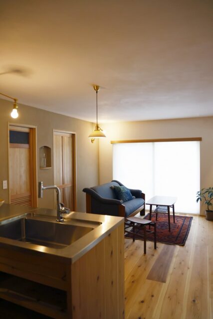 キッチンからLDKを見る。リノベでは、断熱性を高めるために内窓を設置。内窓は自然素材の部屋に馴染むよう、木製サッシを用いた。リビング・ダイニング(写真左)と畳スペース(同右)は、化粧柱やコンパクトな白壁でさりげなくゾーニングしている