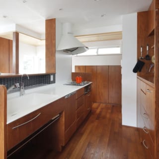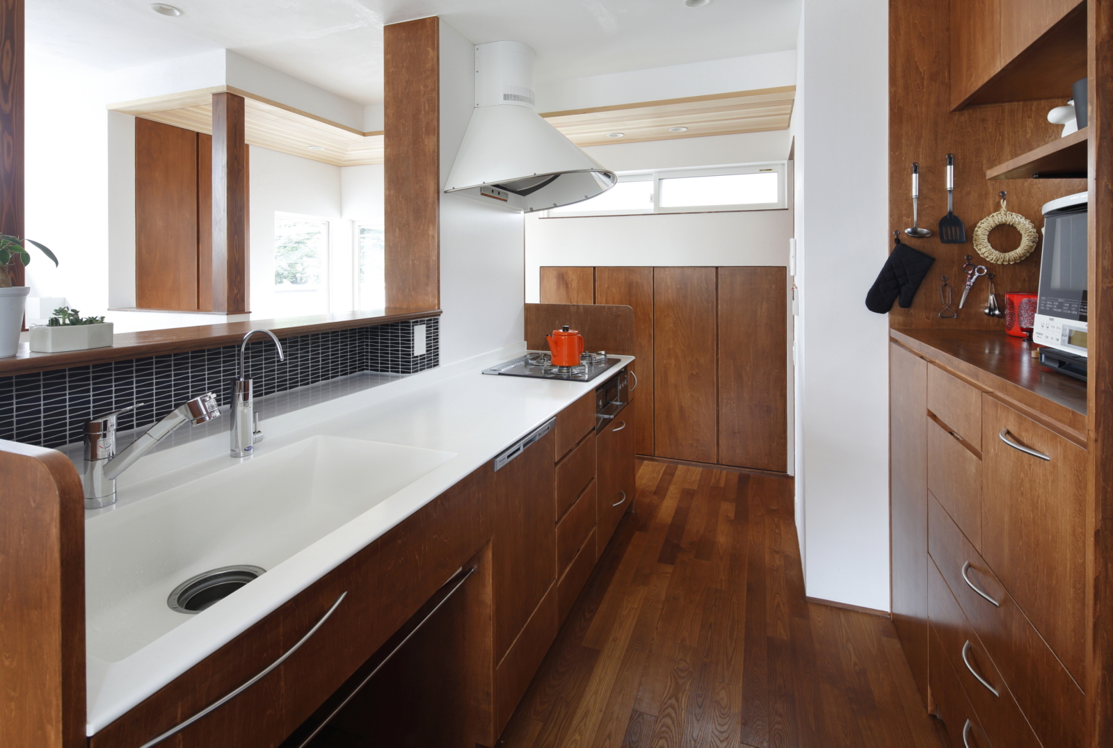 2階 キッチン/奥の壁にも収納を設けるなど、使い勝手の良いキッチン。背面の棚は奥様の背丈に合わせ高さを調整。奥様のこだわりだという白い換気扇フードがかわいらしい