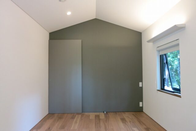 シンプルで落ち着きのある寝室。グリーンのアクセントウォールと窓先の緑のマッチングが心地よい
