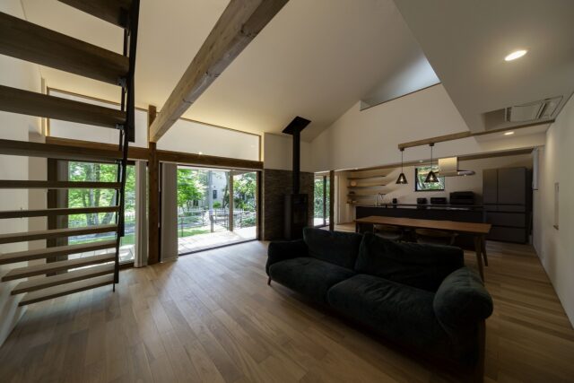 リビングに鎮座する薪ストーブは、暖房だけでなく、音や光、香りでも心を暖めてくれる。階段はスケルトンとすることで、高窓からの光を下すとともに、薪ストーブの暖気を2階に導く