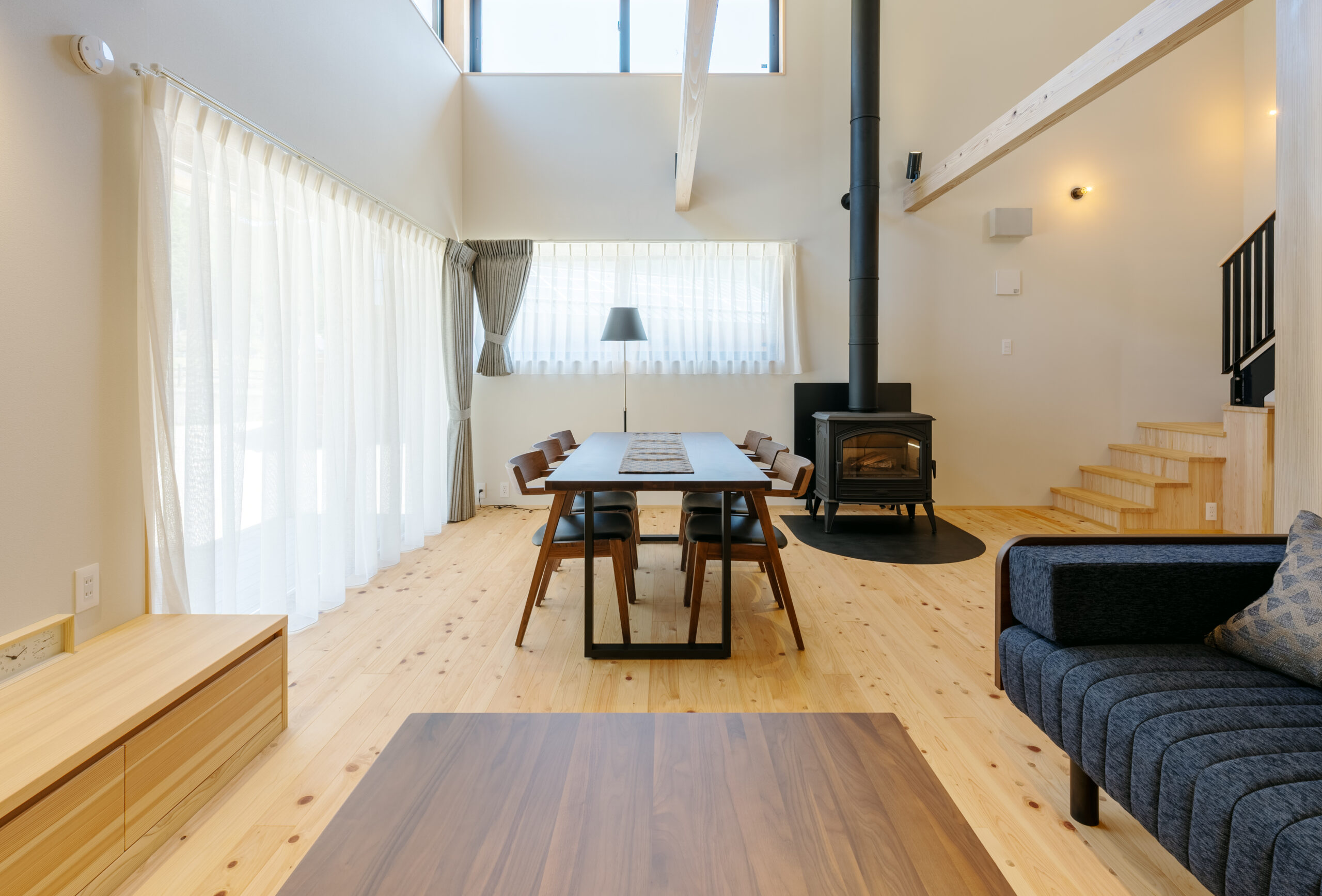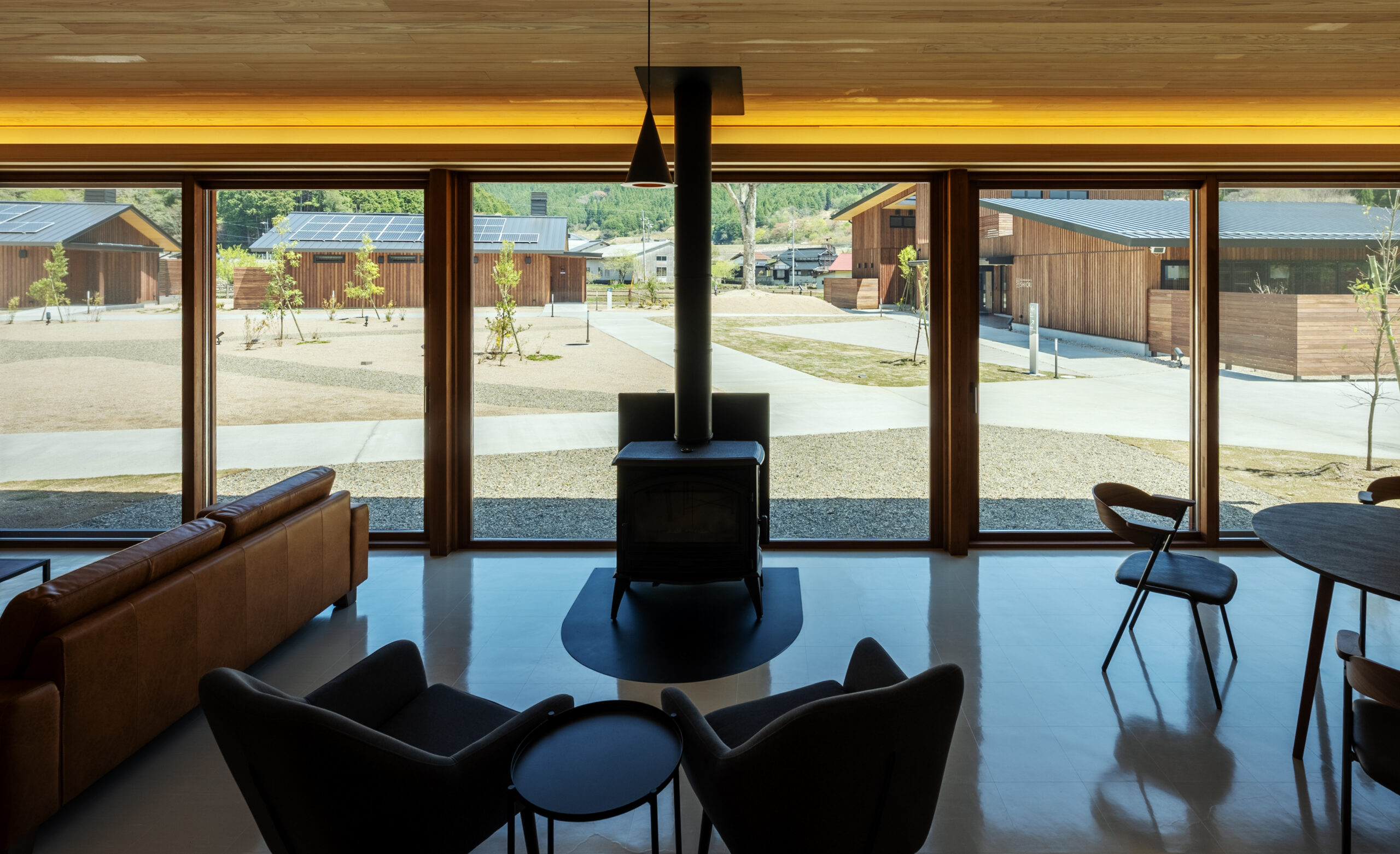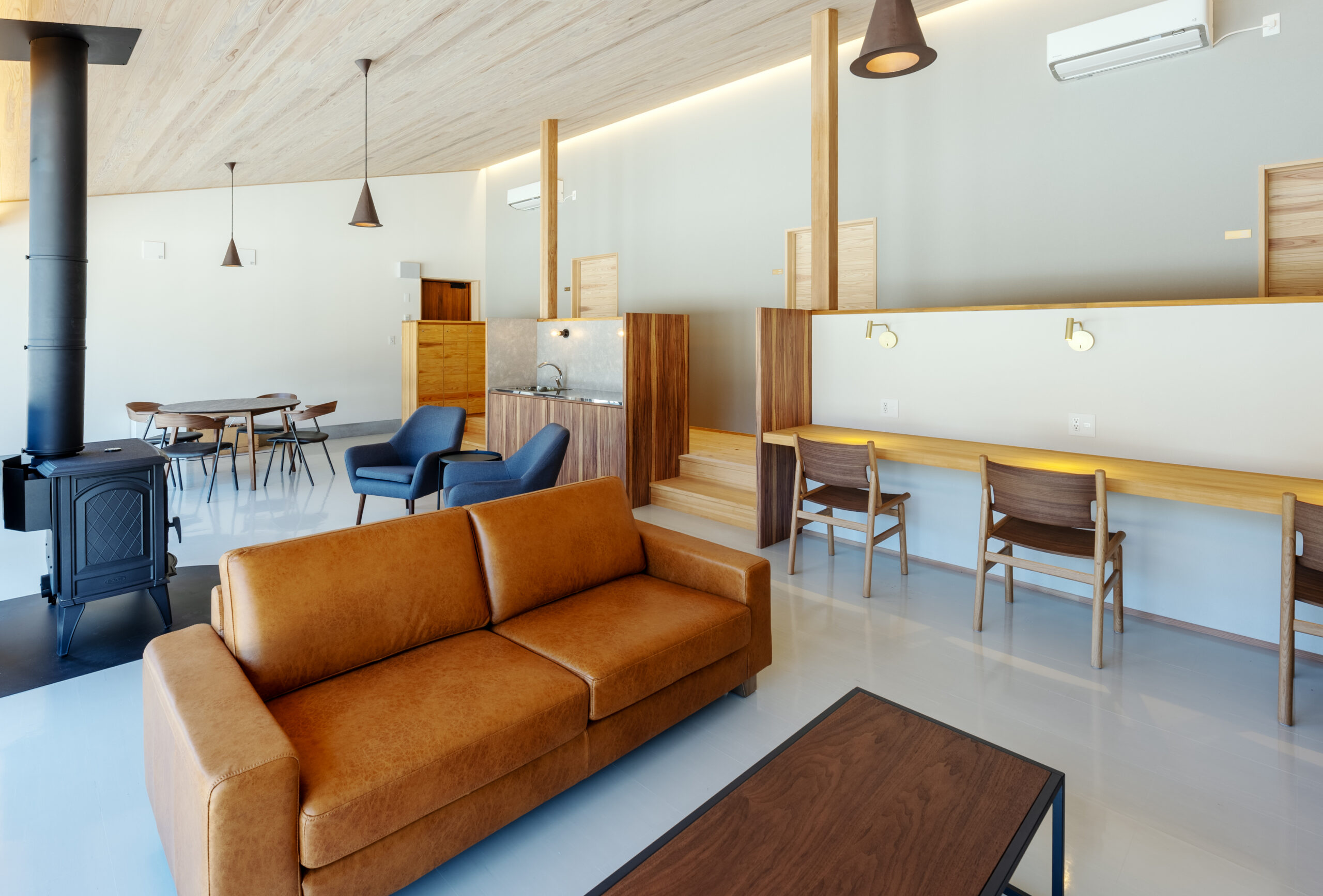 B棟1階リビングダイニング。2階までの吹き抜けによって開放感抜群の空間。A棟よりもカジュアルに仕上げたB棟は、グループでわいわいと楽しむのに向いている。雪が降るほど寒いという西粟倉村。大きな開口部は木製サッシを採用し、デザイン性と断熱性能を両立させた