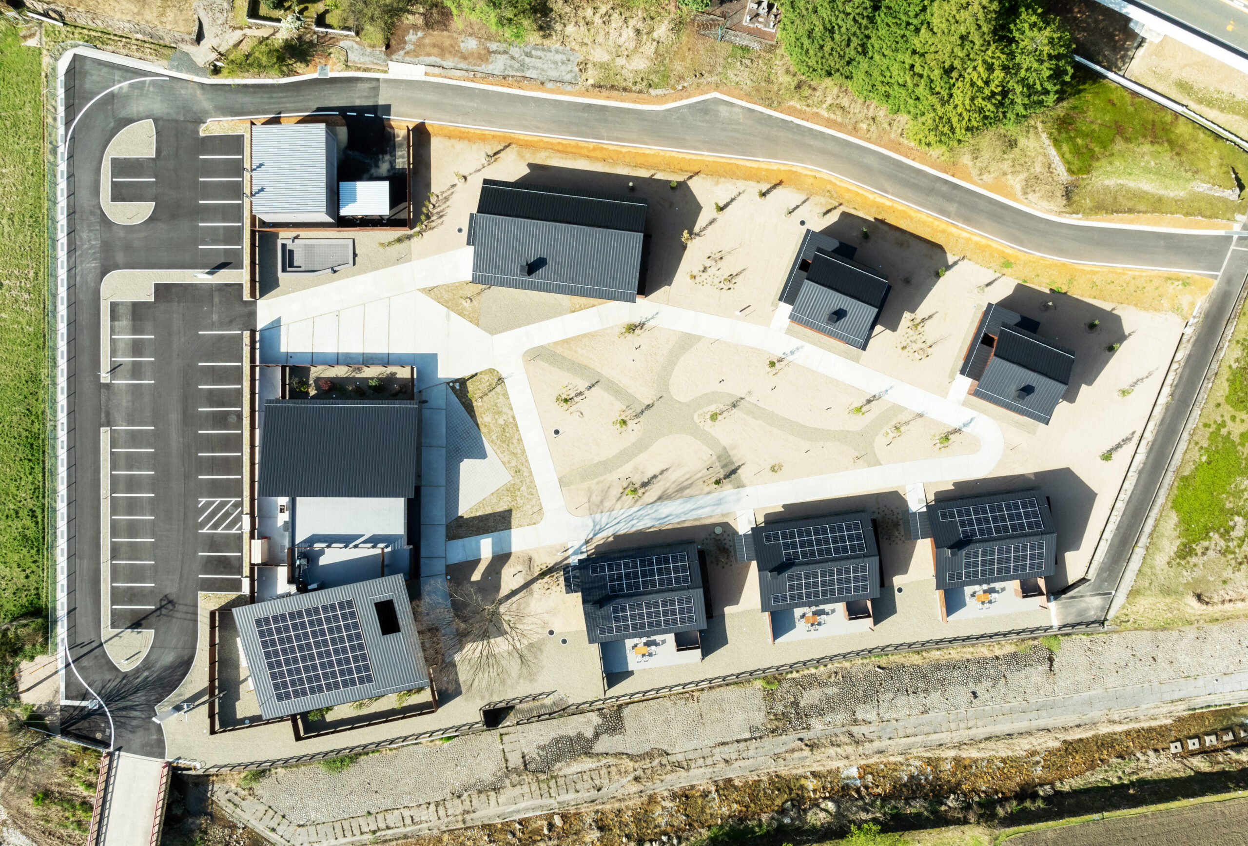 西側高所からの全景。左側に並ぶのはA棟、右に2つ並ぶ棟はB棟。収容人数は同じながら、大きな平屋のA棟に対して、B棟は高さを抑えたコンパクトな2階建て。B棟の2階からは、A棟からも見える美しい山が眺められる。場の持つイメージを踏まえ、宿泊施設は全て切妻屋根とした