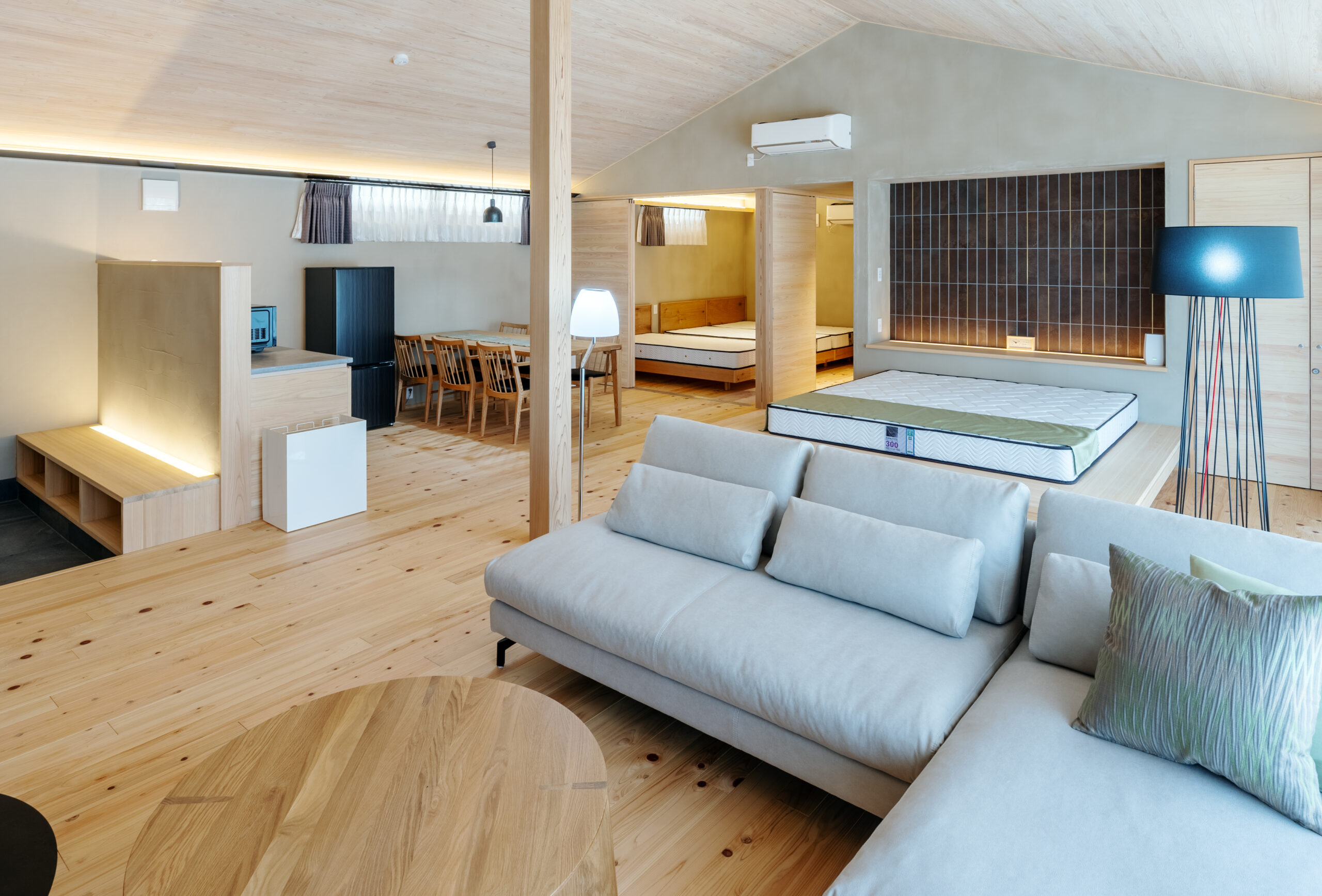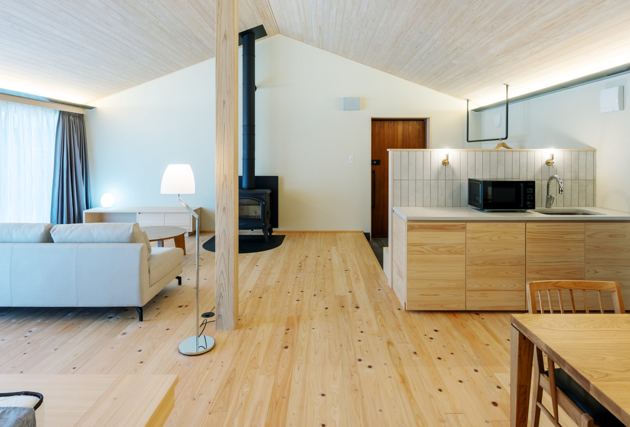 A棟。キングベッドの辺りから玄関方向を見渡す。ラグジュアリーなA棟は、ヒノキの床に加えて天井にもヒノキを張った。壁は漆喰の塗壁とし、木や自然素材の温もりが存分に感じられる空間をつくり上げた。薪ストーブで暖を取る、そのちょっとしたひと手間が贅沢な時間を演出する