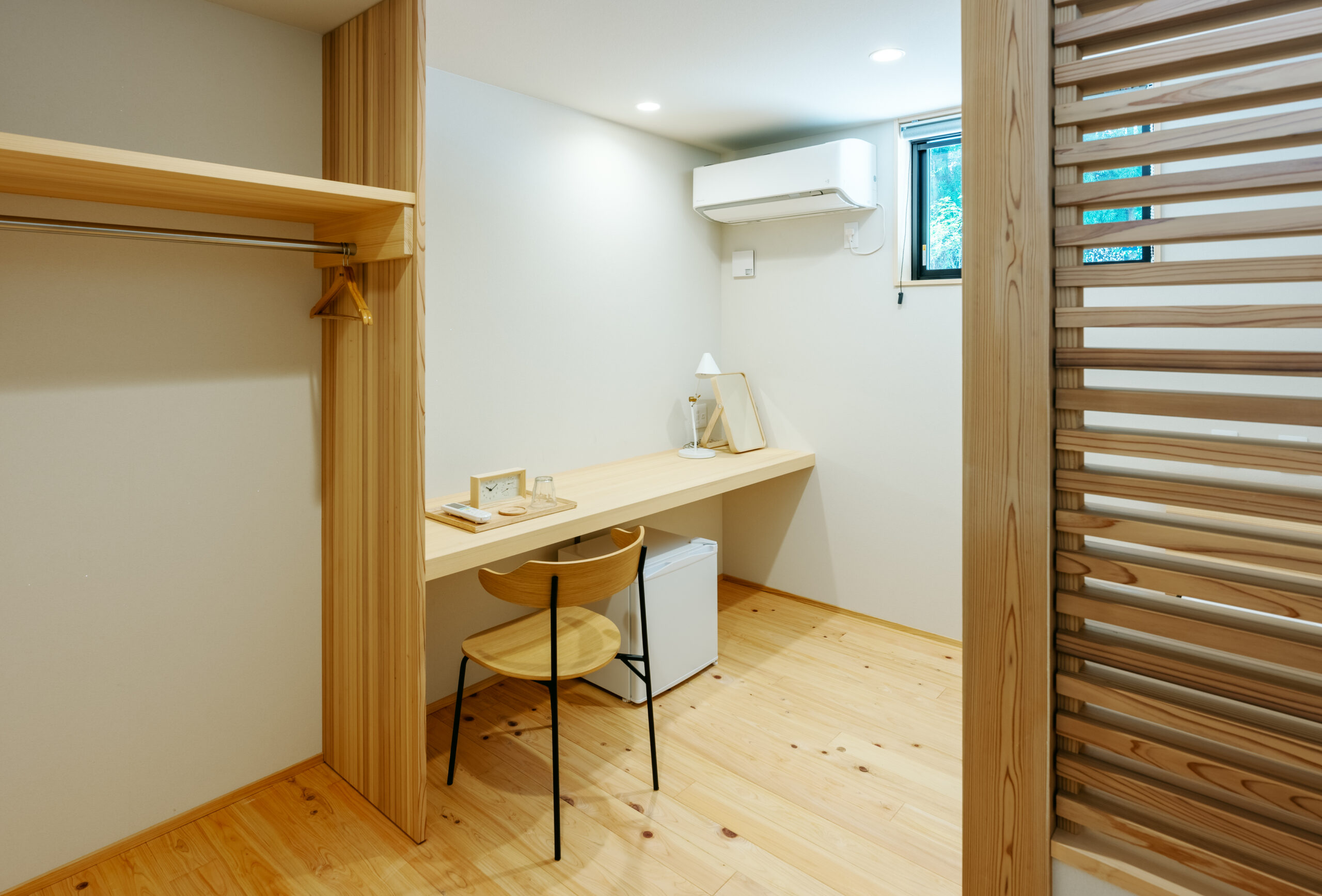 岡山県西粟倉村、「百年の森林構想」に基づいて完成した、室内も屋外も木々に溢れたホテル「100年の森のホテルSHIORI」。設計を担当した建築家の大類さんは、ひとりでも大人数でもホテルステイが楽しめることはもちろん、非日常感を味わいながらゆったりとくつろげる空間をつくりあげた。