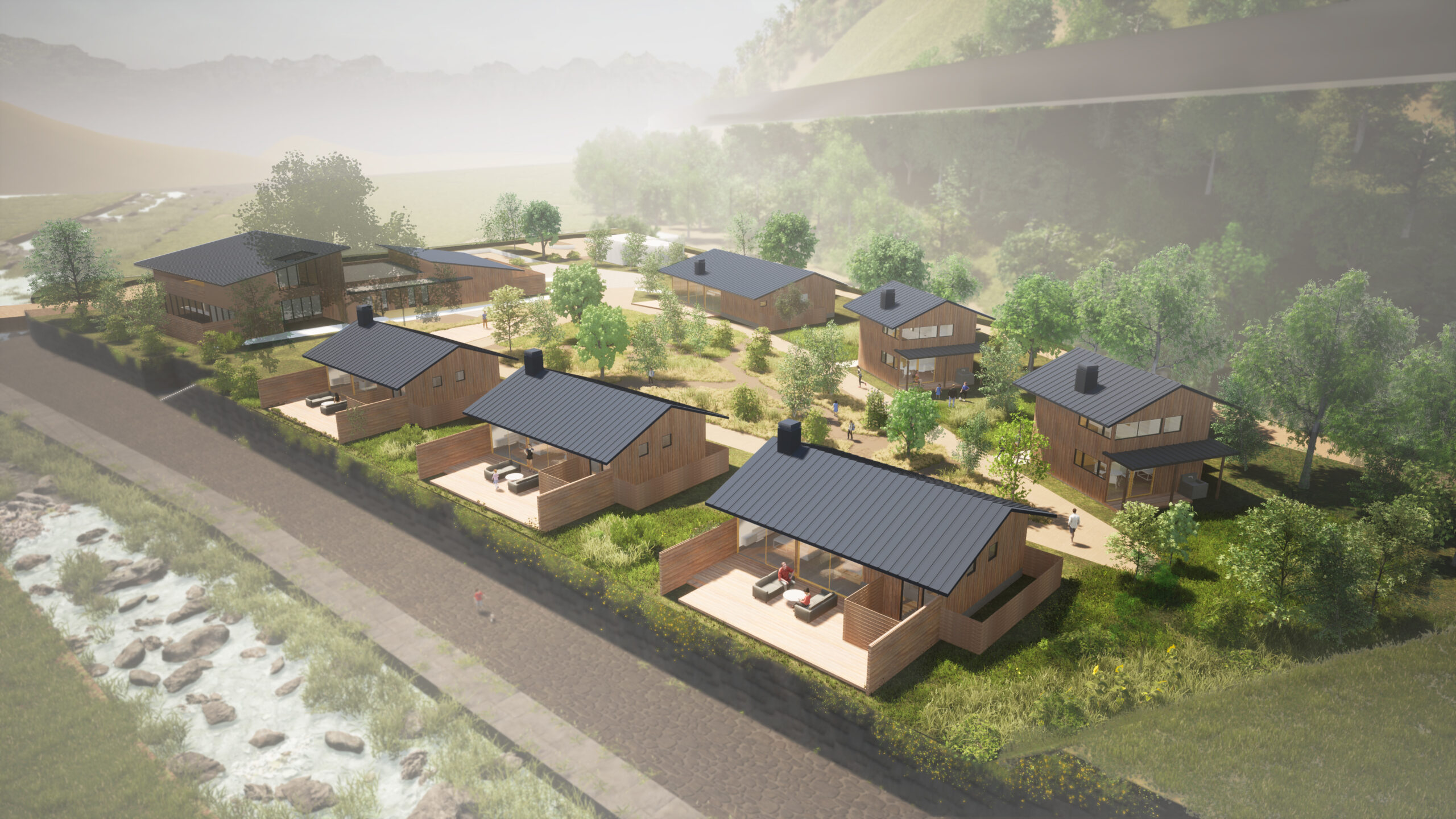 全景。切妻屋根が宿泊施設の建物。左端が共用棟。そこから時計回りに、C棟(1棟)、B(2棟)、A棟(3棟)。A棟の下に川が流れており、ホテルへは左下の橋を渡ってアプローチする。そのため、ホテル内は日常から一つ離れた世界という感覚が得られるよう計画した