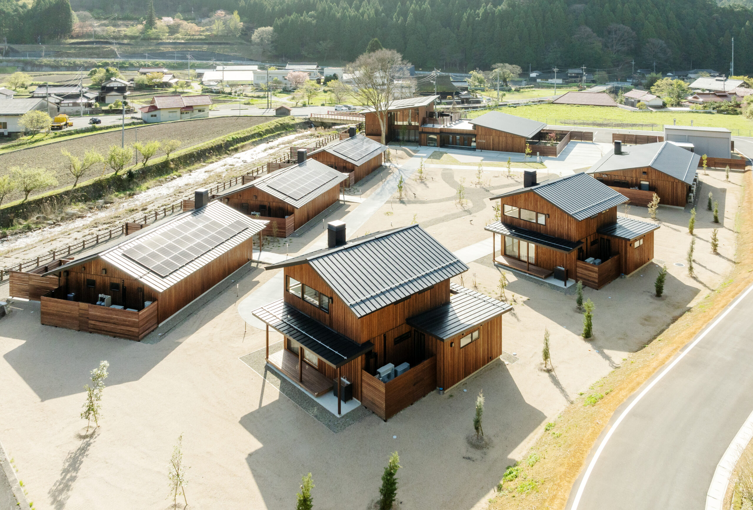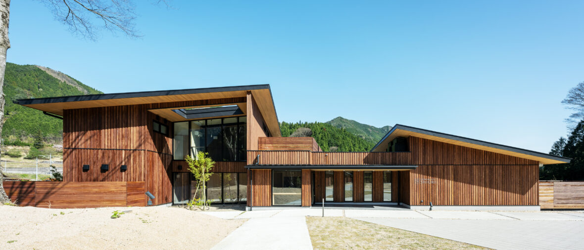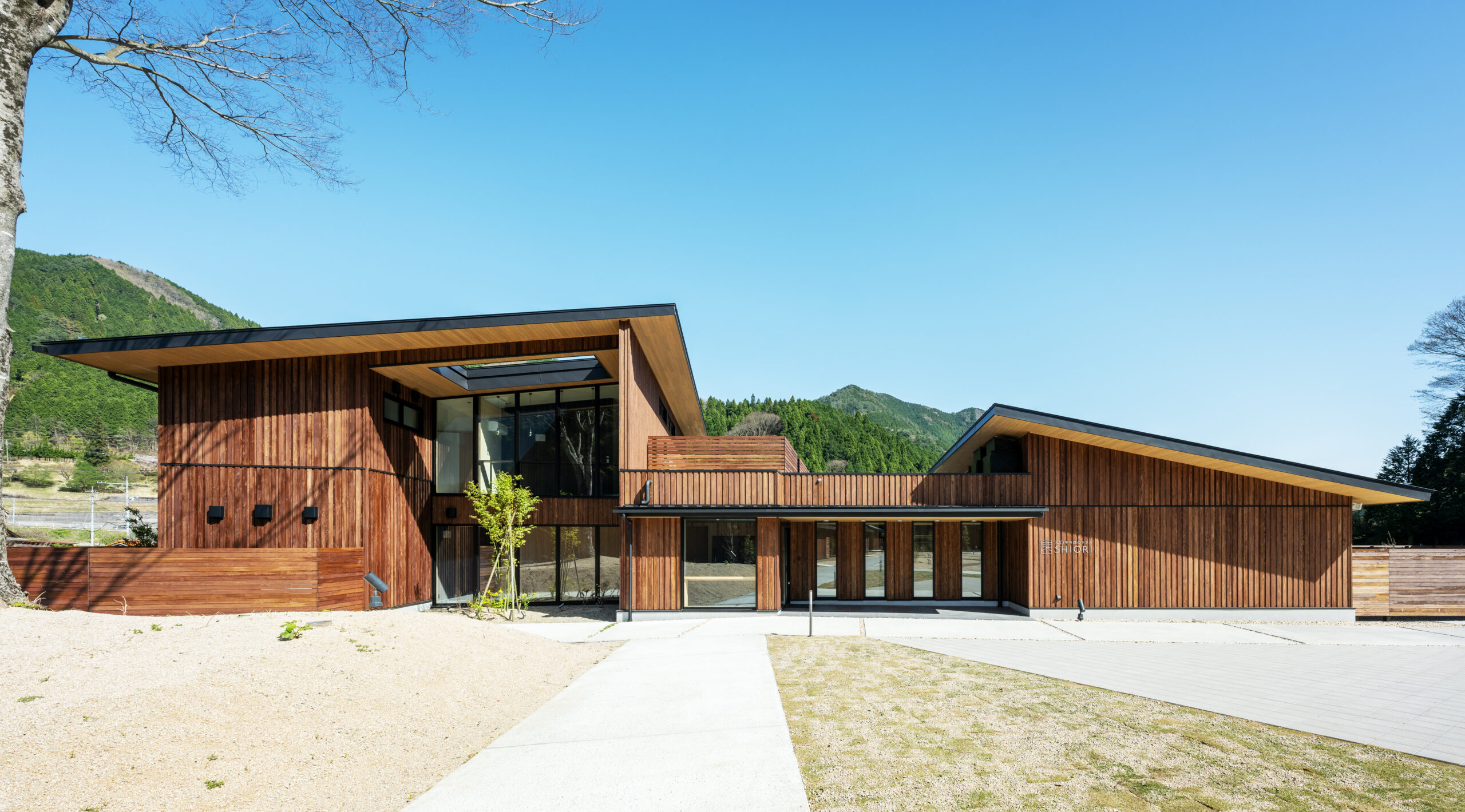 B棟外観。村で推進している「百年の森林構想」の取り組みから、全棟の外壁は地域の木材を使用した。軒を深く出して外壁が受けるダメージをコントロールするなど、劣化の対応ももちろんしているが、実は木材はとても強く、素材自体がだめになることはほぼないとのこと