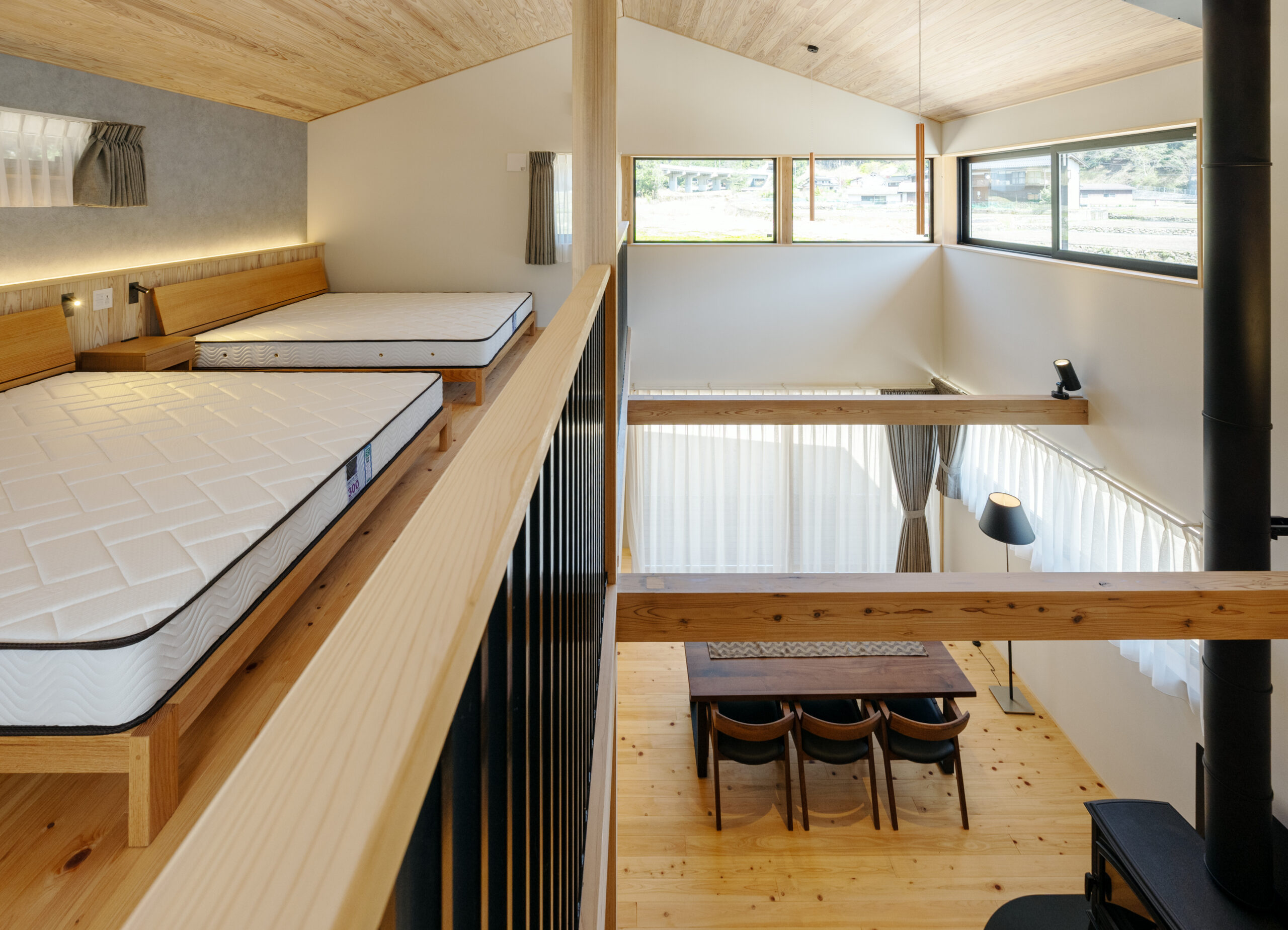 B棟2階、メインベッドルーム。大人数での旅行では、LDKと寝室が分かれているとプライバシーも確保しやすくありがたい。吹き抜けを挟んだ壁面の窓からは、北側の美しい山が眺められる