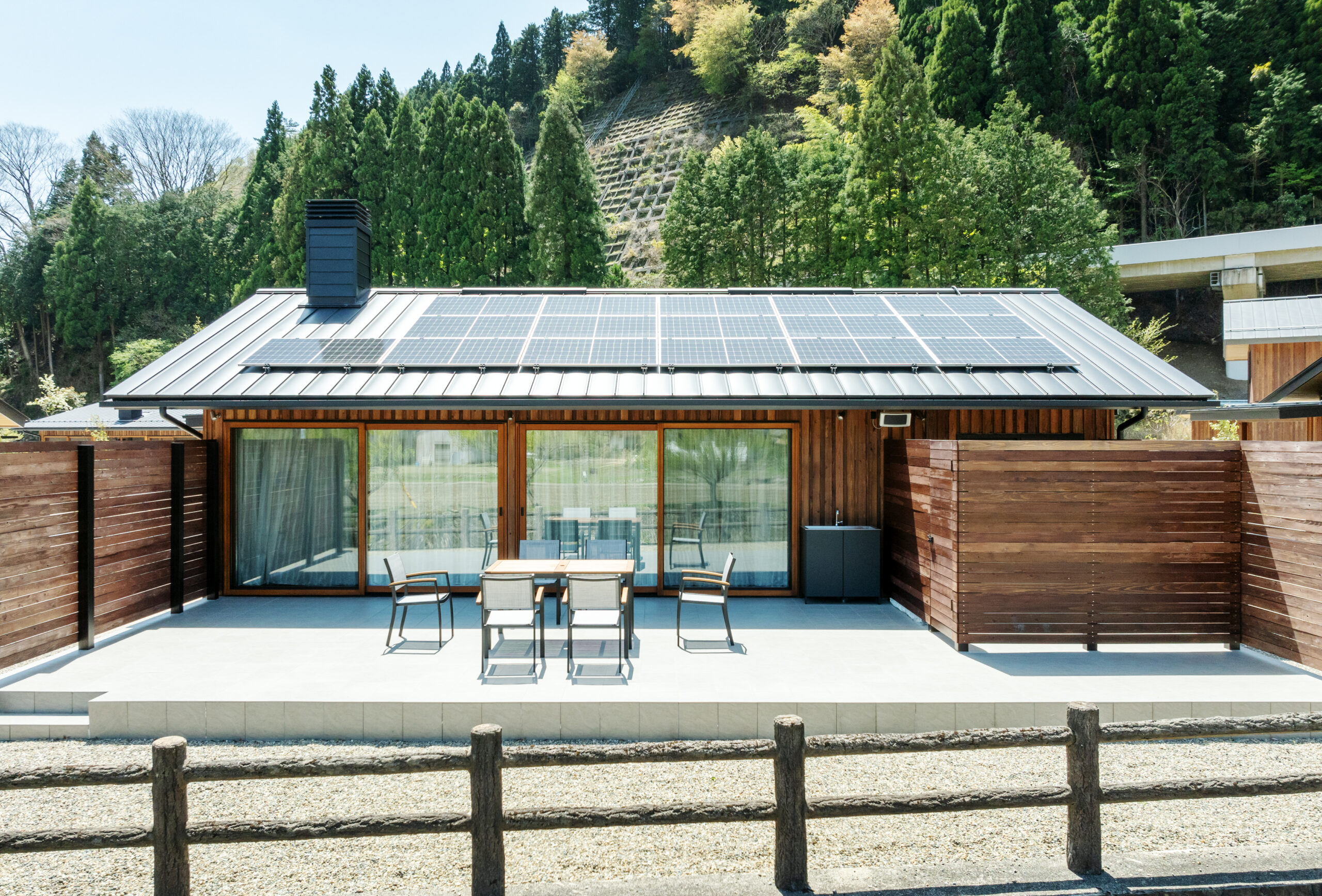 A棟テラス。リビングの大きな開口からシームレスにつながり、室内も屋外もゆったりした感覚が得られる。川が流れる音も聞こえて気持ちがいい。写真右、木材の壁で囲っているのは浴室と中庭。向かい側からの視線を気にせずに外気浴が楽しめる
